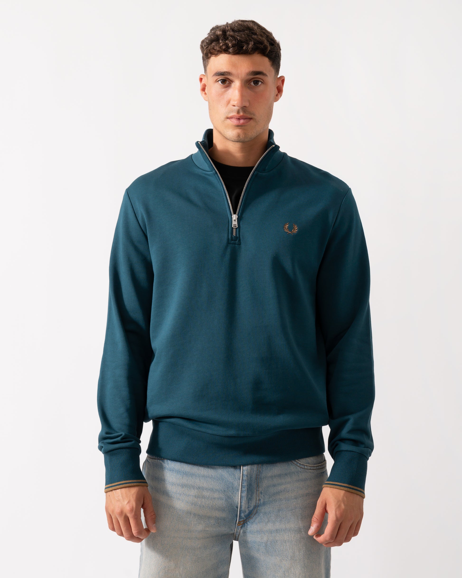 A stripped back Half Zip sweatshirt constructed from a cotton-rich blend and featuring signature Fred Perry detailing.