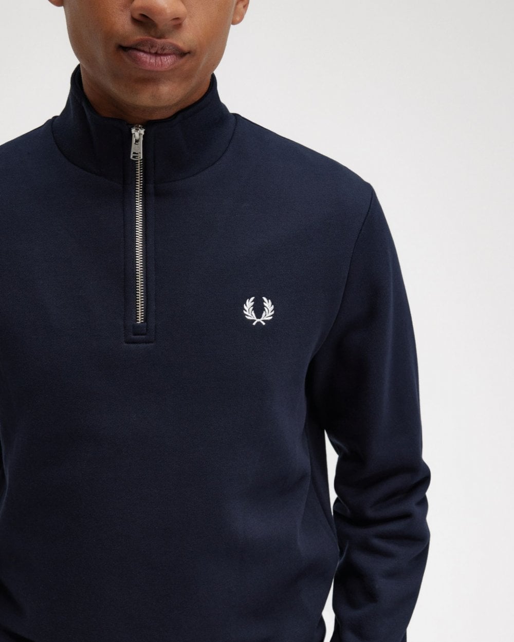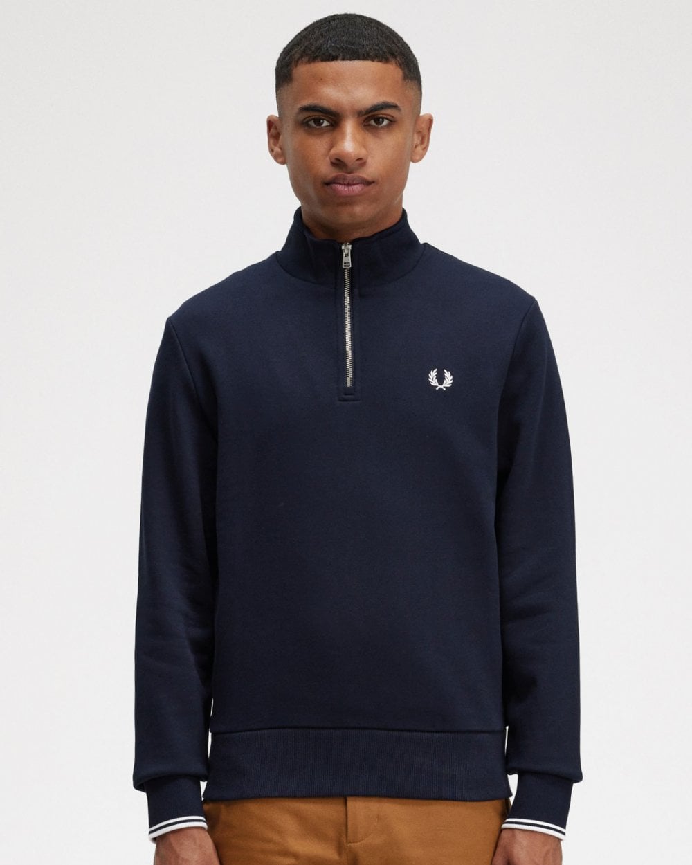 A stripped back Half Zip sweatshirt constructed from a cotton-rich blend and featuring signature Fred Perry detailing.