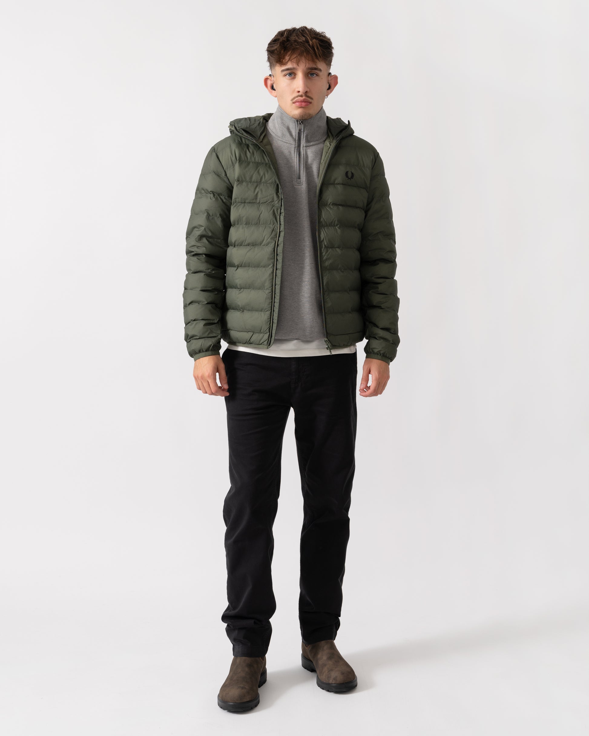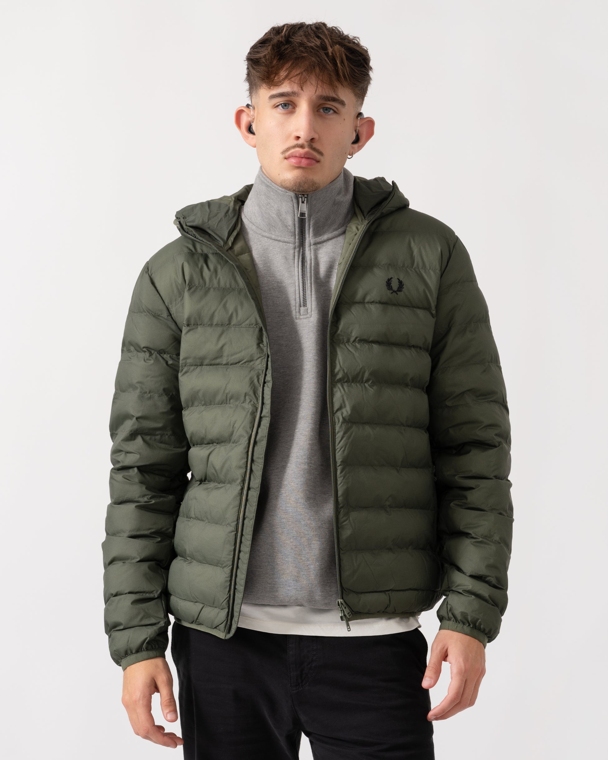 A staple Fred Perry insulated jacket with an adjustable hood and twin tipping to the internal collar.