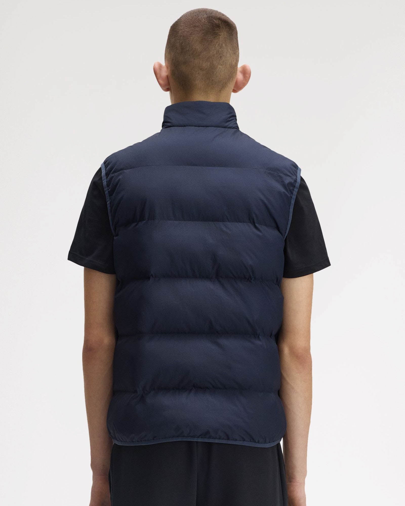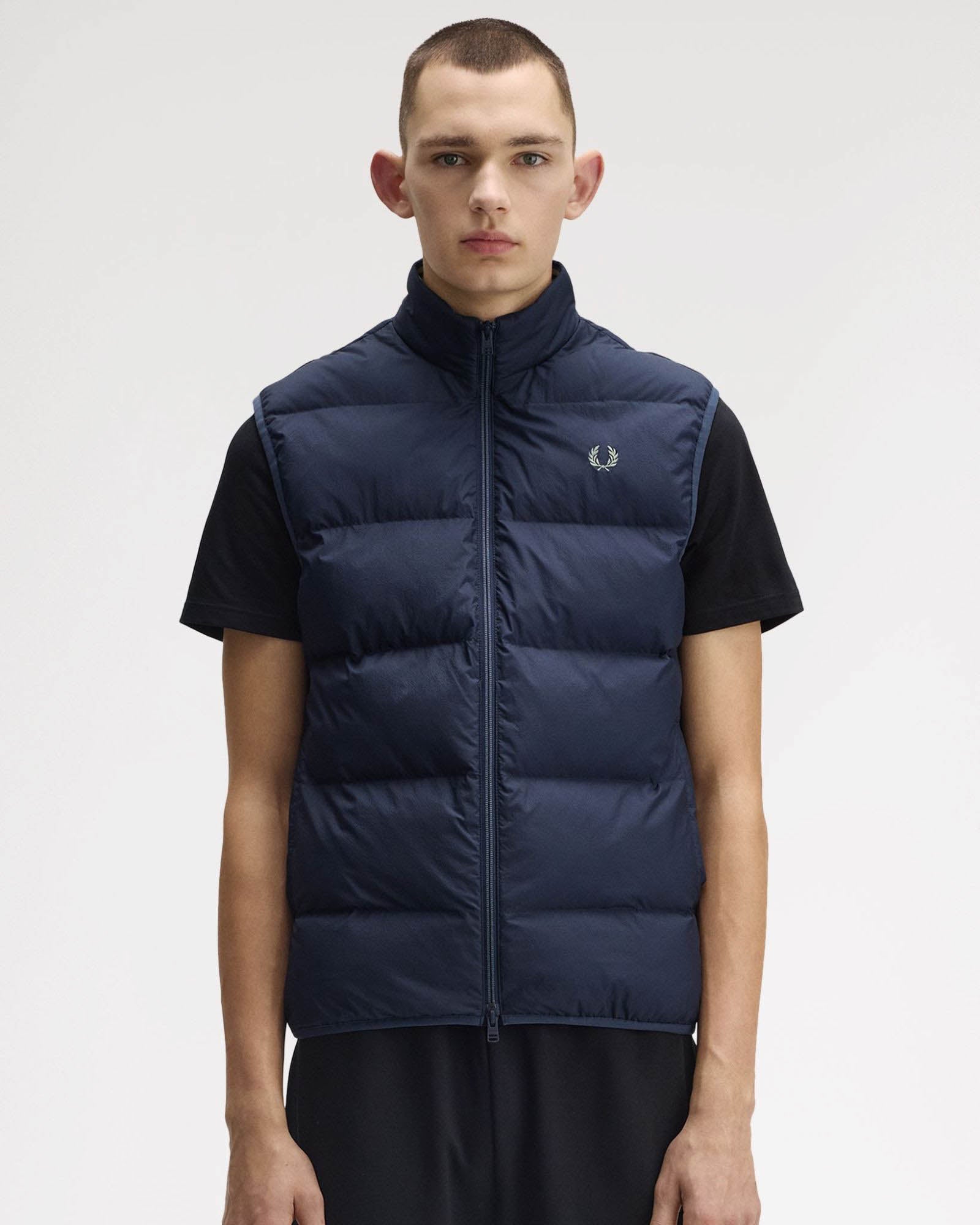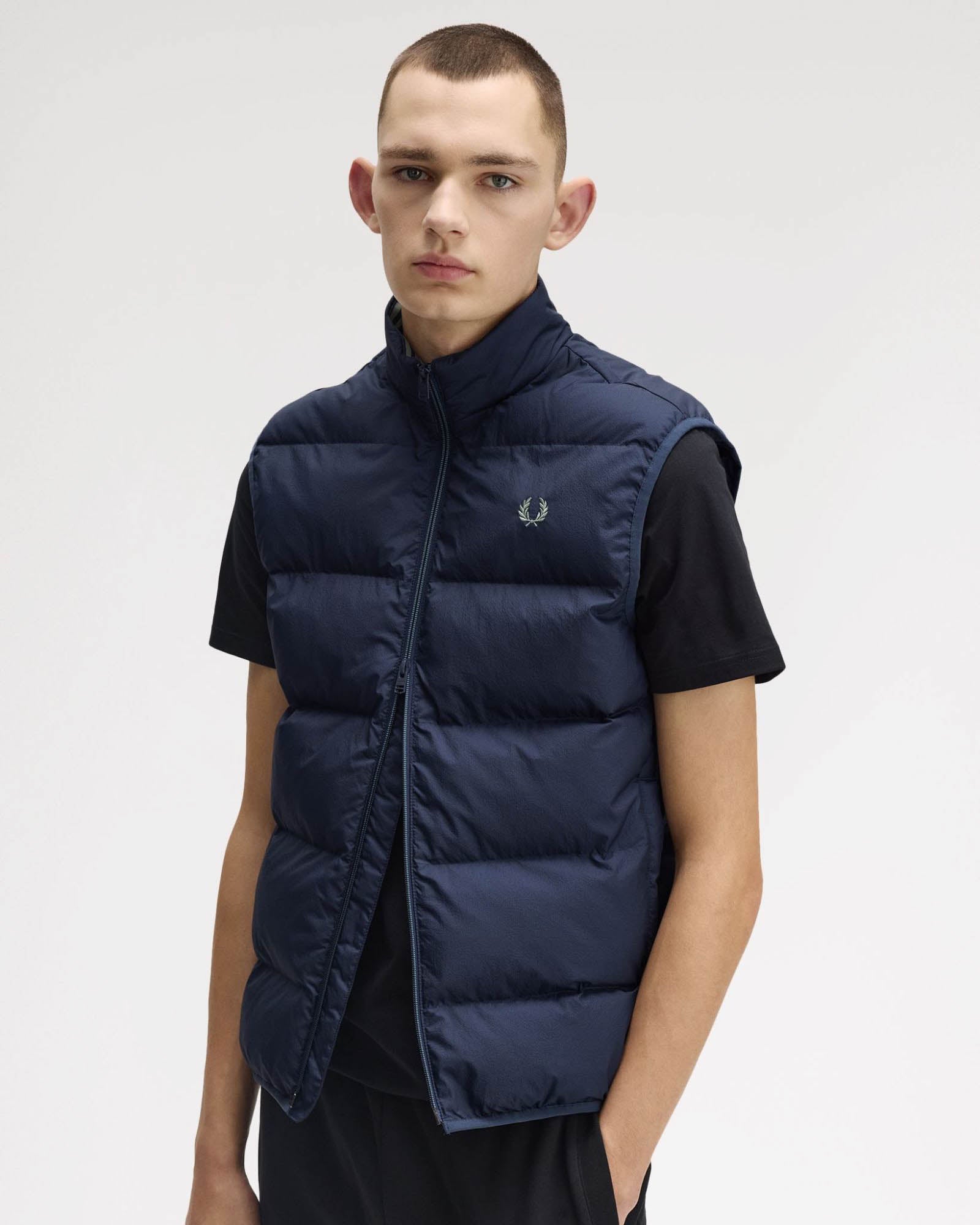 A sleeveless overlayer in the familiar quilted style of the British puffer.