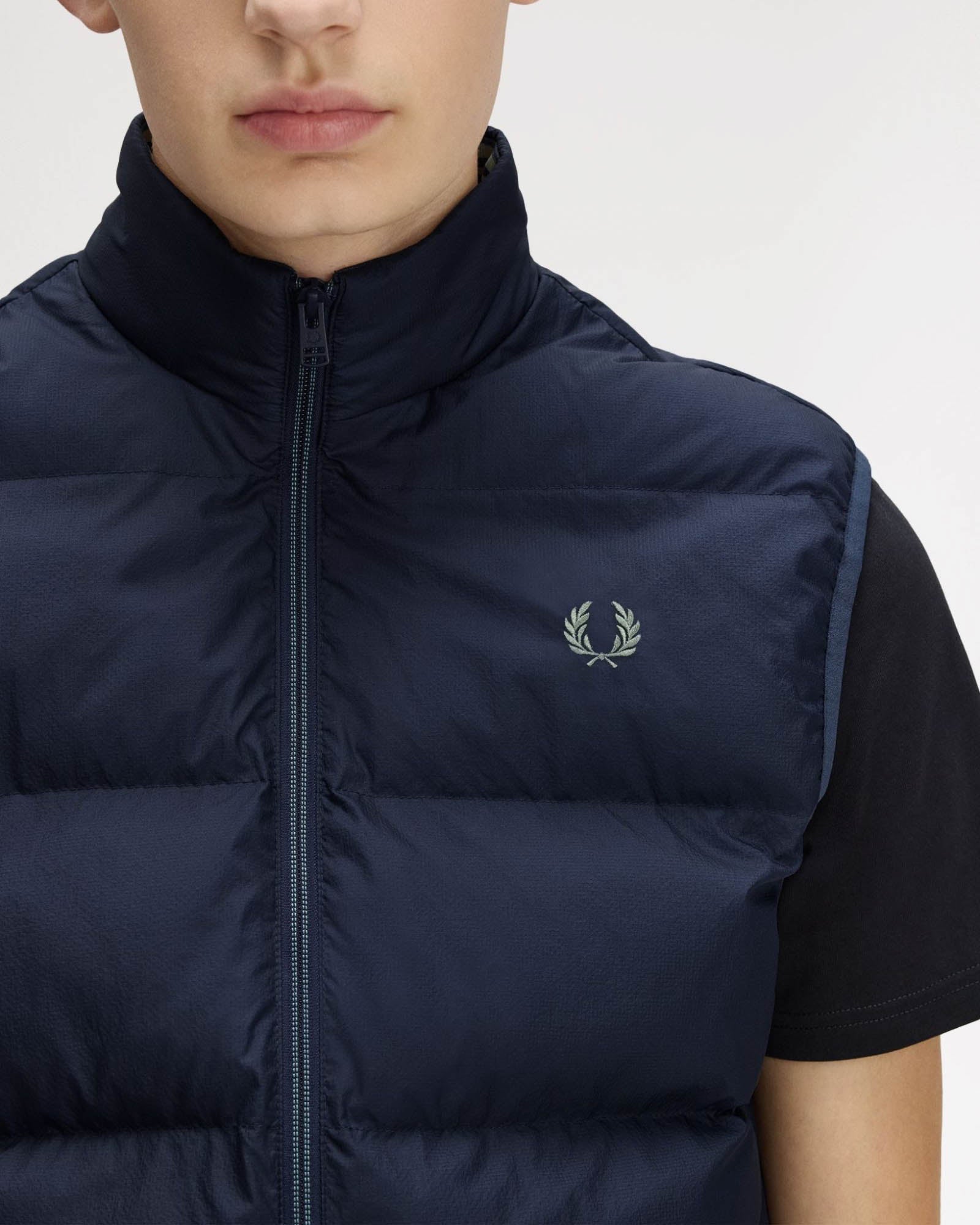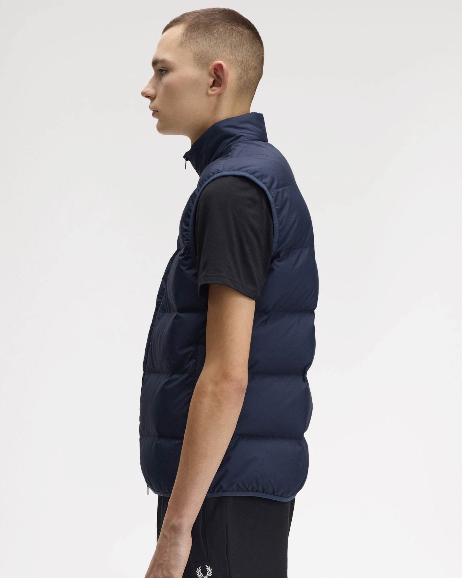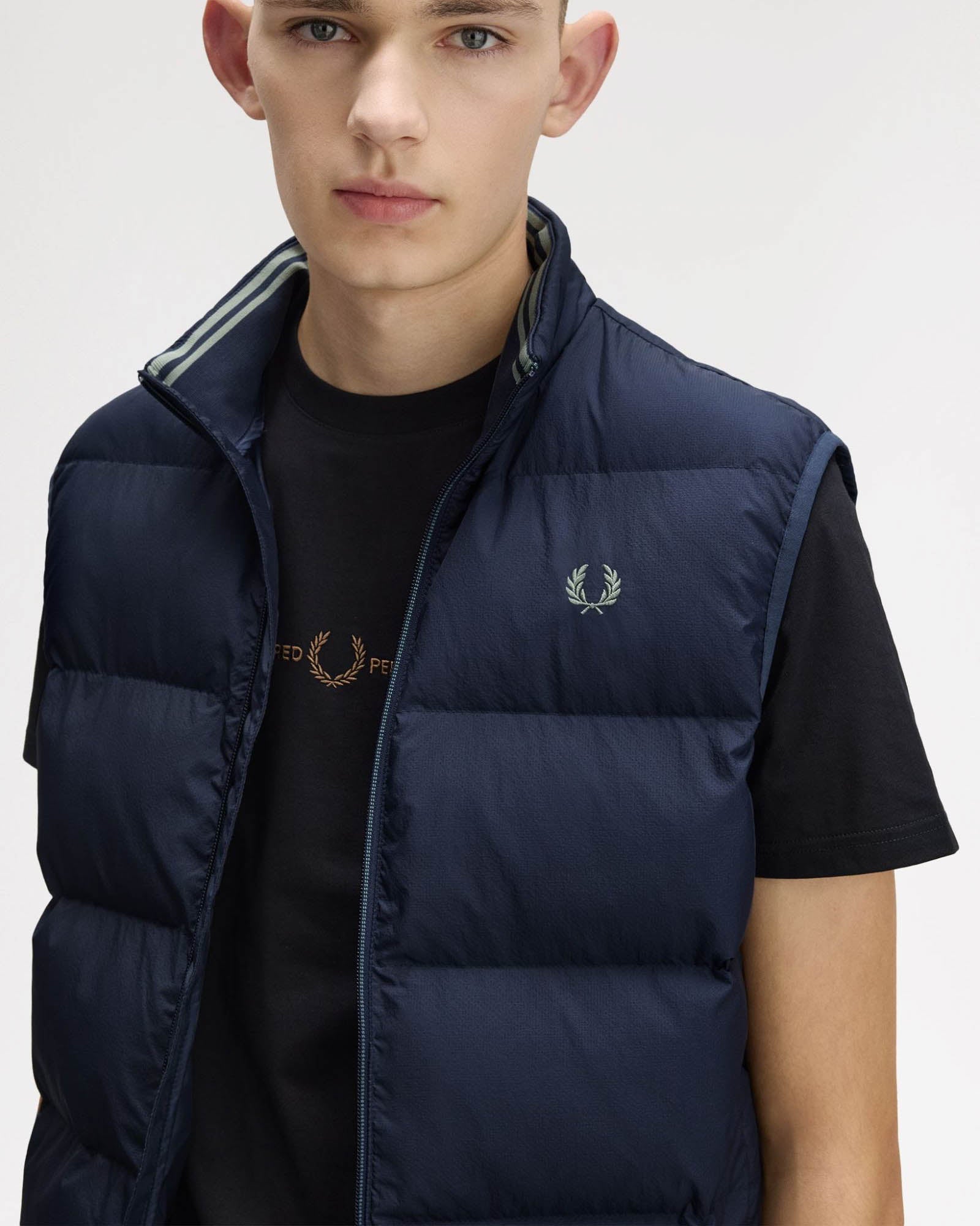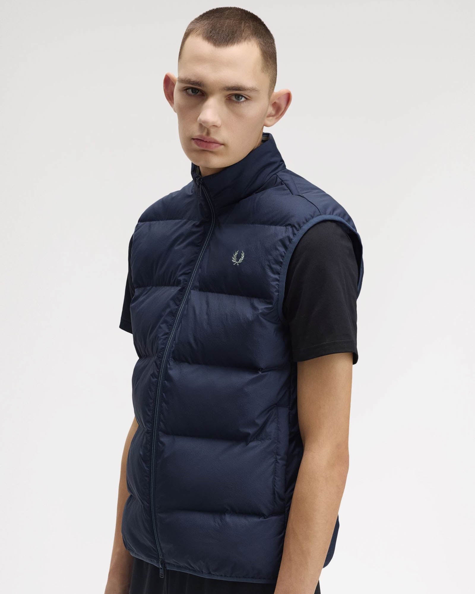 A sleeveless overlayer in the familiar quilted style of the British puffer.