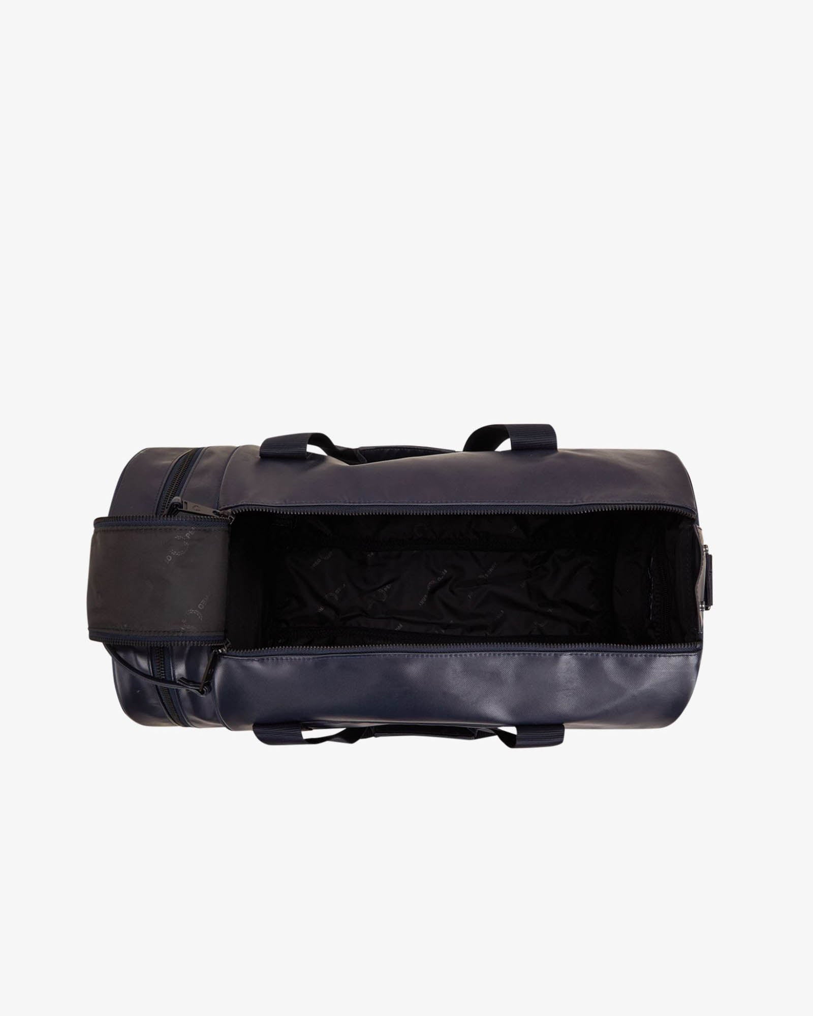 Recycled polyester fabric / Black metal hardware / Dual zip closure and zipped end compartment / Adjustable crossbody webbed straps / Gold printed branding to the barrel ends and Laurel Wreath logo to the front body