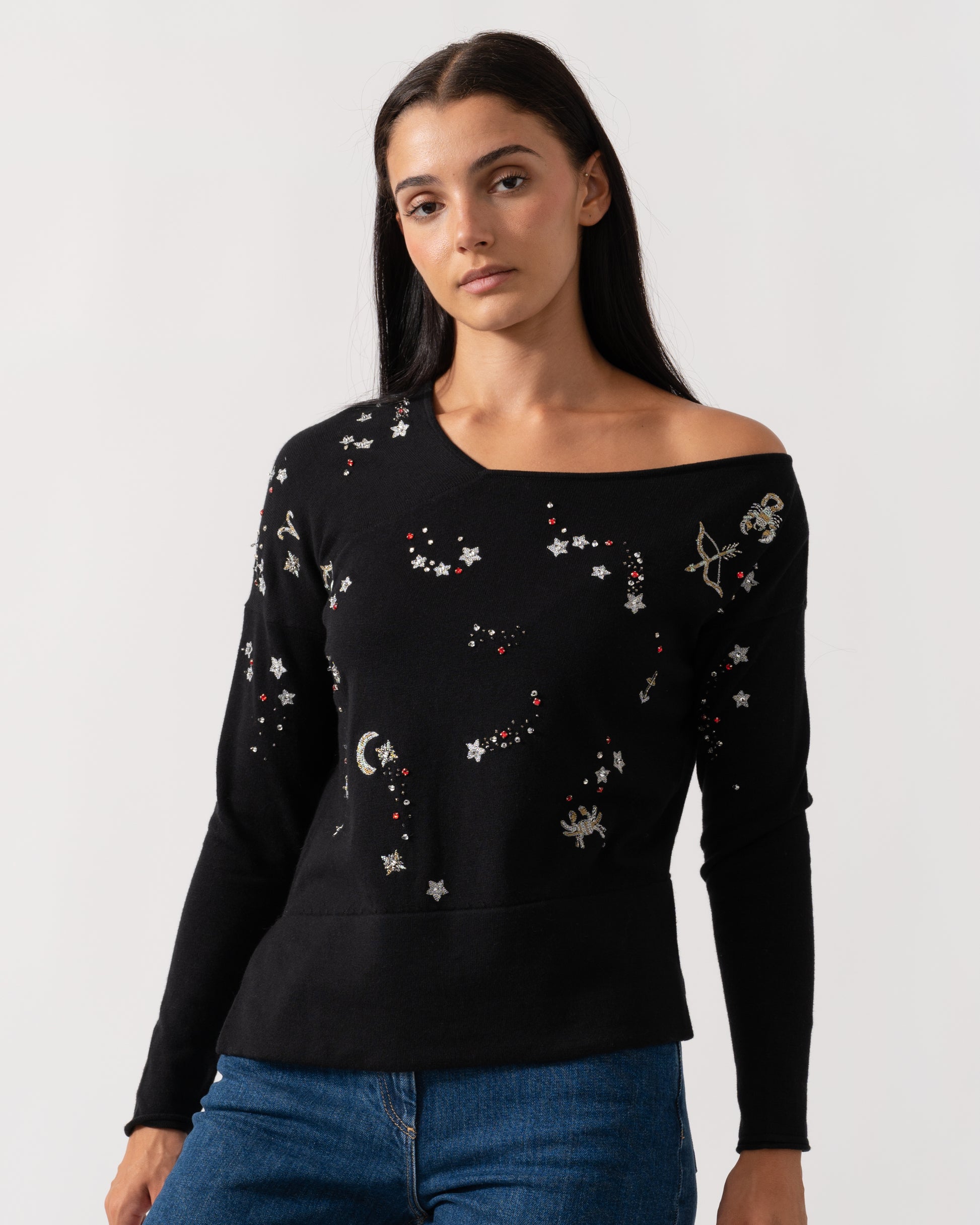 Long sleeved slash neck lightweight jumper with asymmetrical hem and astrological embroidery with sequin detailing.