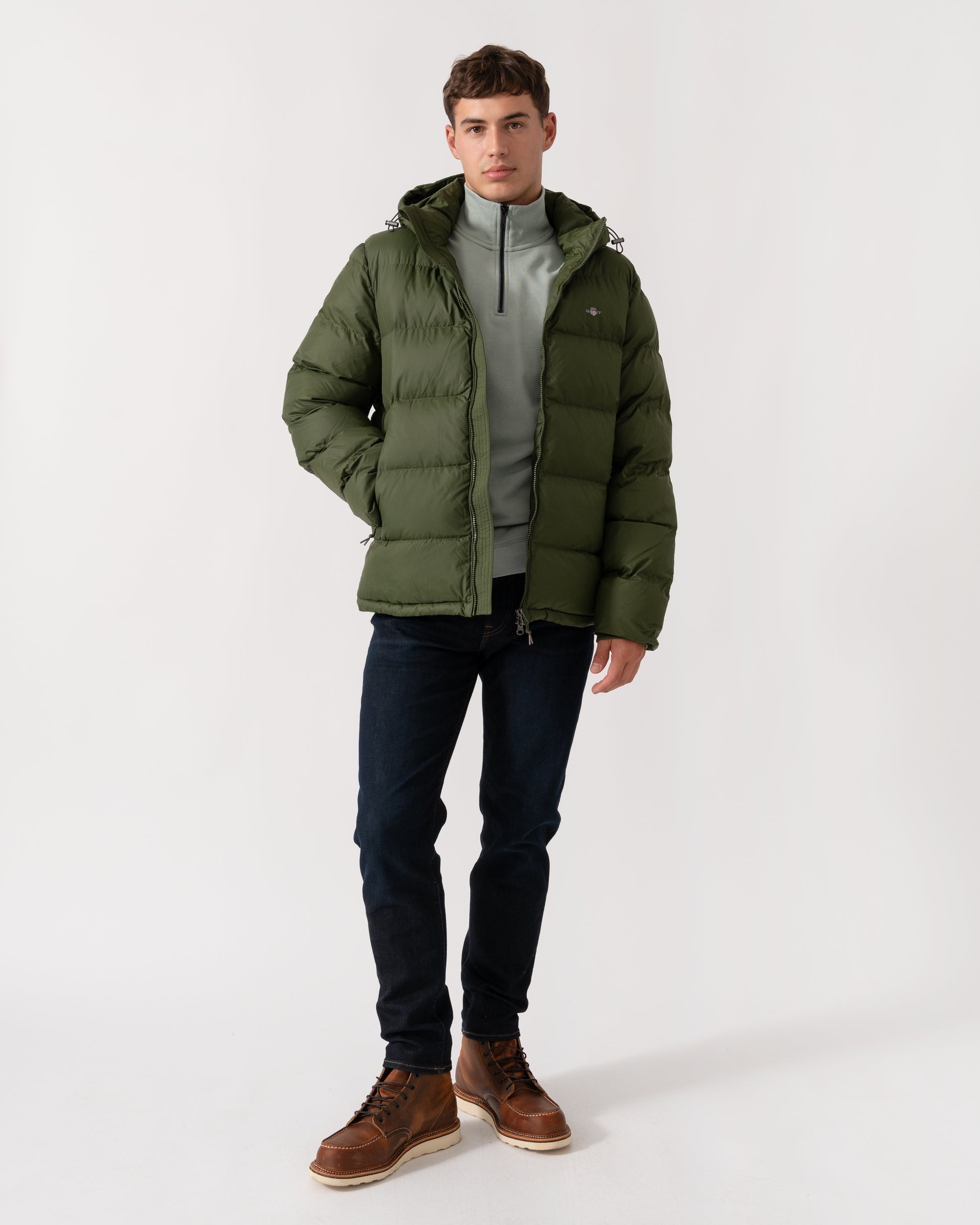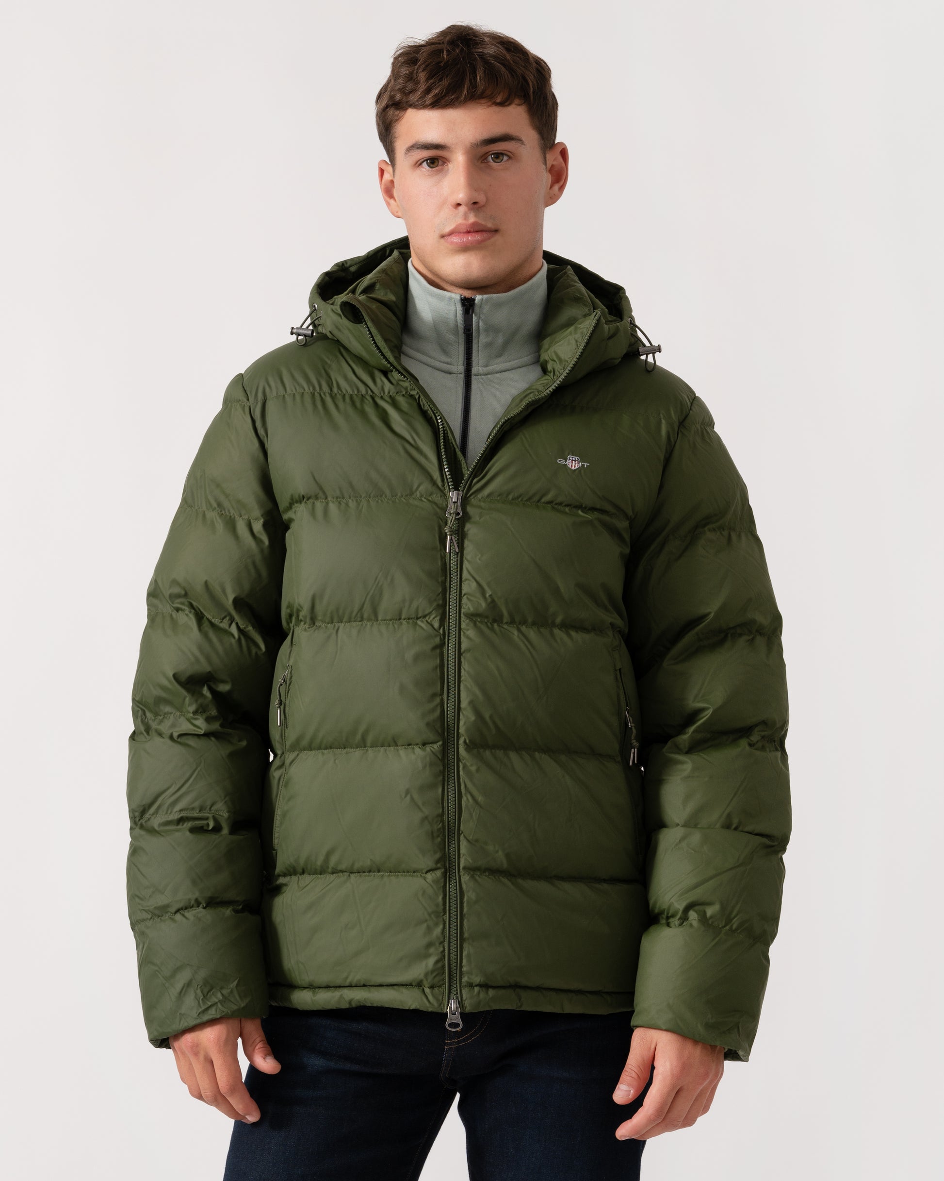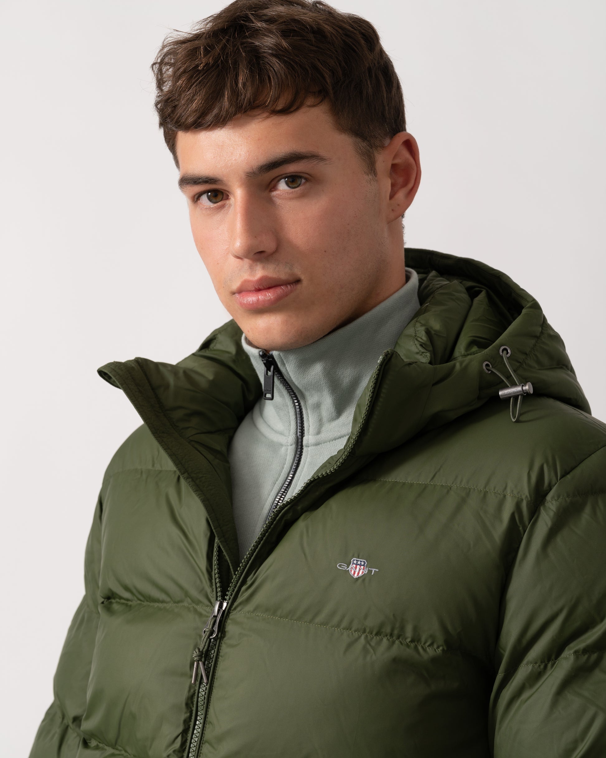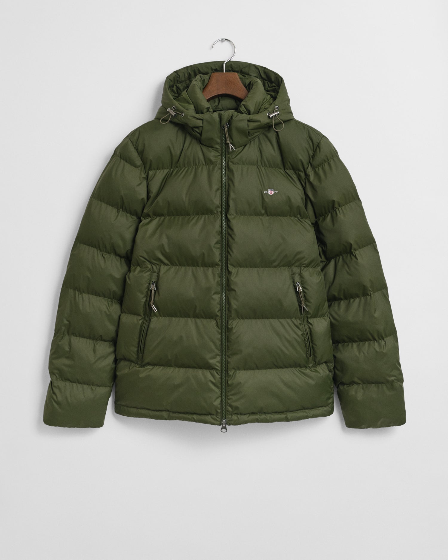 Ideal for days spent outdoors, the Active Cloud Jacket is crafted to hip length and tailored for a regular fit, ensuring comfort and functionality. Treated with a water-repellent finish, it provides protection from the elements. The jacket boasts a puffer design with a fully lined padded interior, a detachable hood, and convenient slanted side zip pockets for storage. It is accented with a sleek front zip closure, storm cuffs, and adorned with a GANT shield graphic at the chest, adding a touch of style to its practicality. This product is made with recycled polyester, aligned with GANT's sustainability strategy to support circularity.