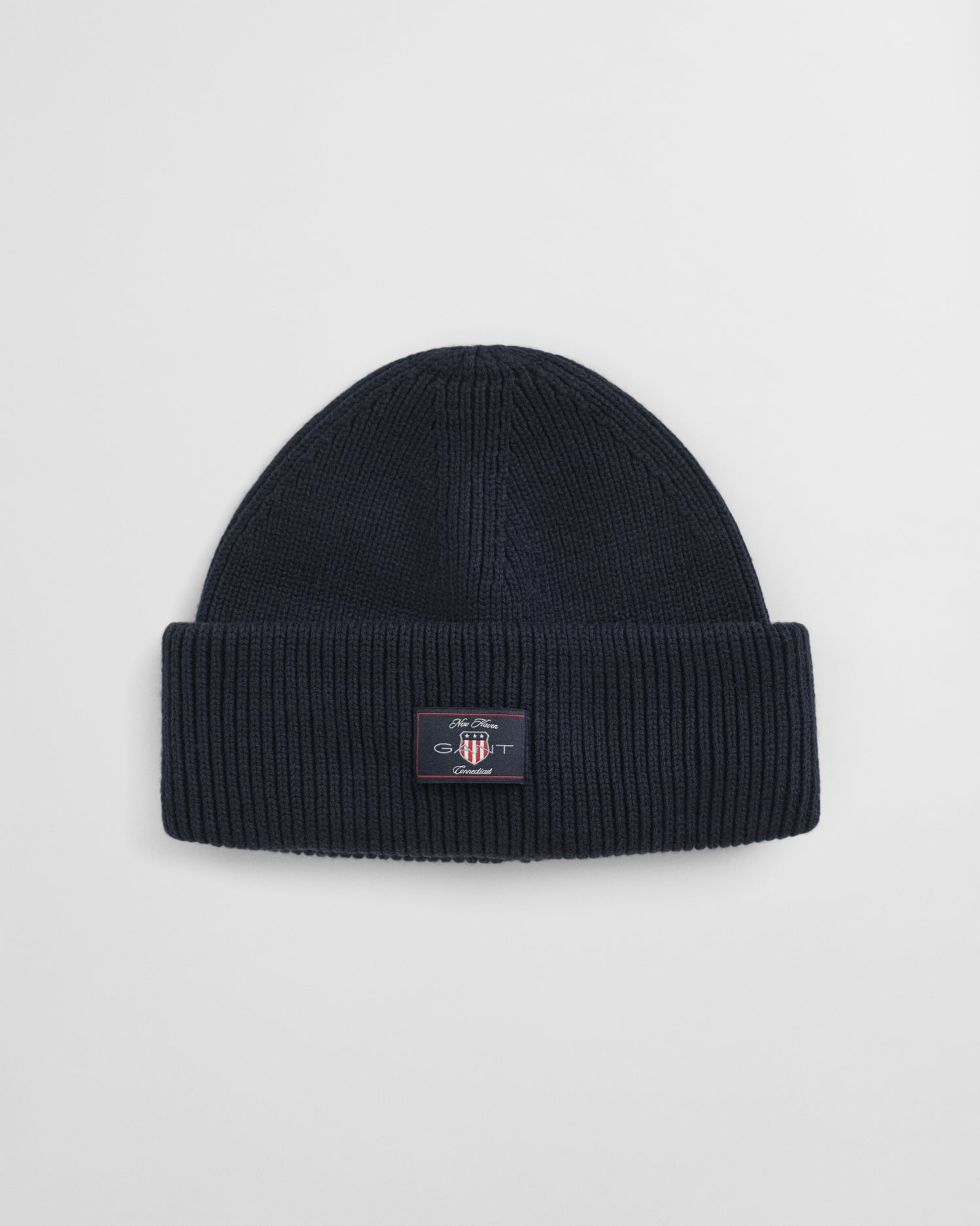 This GANT beanie is crafted from a soft organic cotton blend in a rib knit structure. An essential for winter, it is highlighted by a seasonal Archive Shield label stitched onto the front fold-up. This product is made with a majority of organic cotton. Organic cotton reduces the environmental footprint and promotes safe work and better livelihoods.