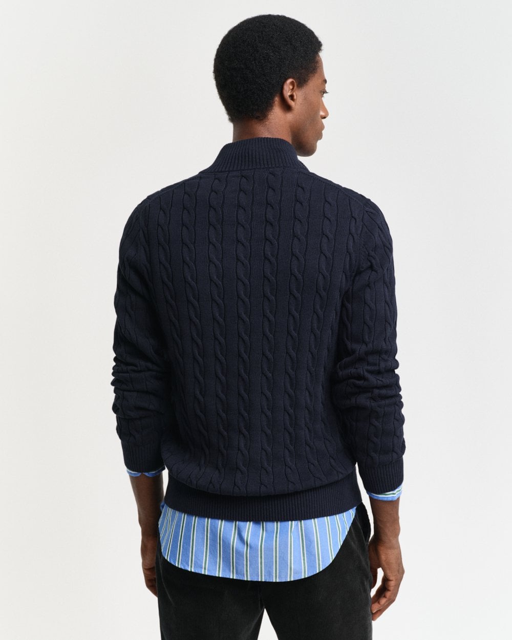 Designed in cotton with an all-over cable knit structure, this soft sweater has a regular fit and a half-zip collar. A preppy essential, it is detailed with our iconic GANT Archive shield graphic embroidered at the chest and features ribbed endings at the neck, hem and cuffs.