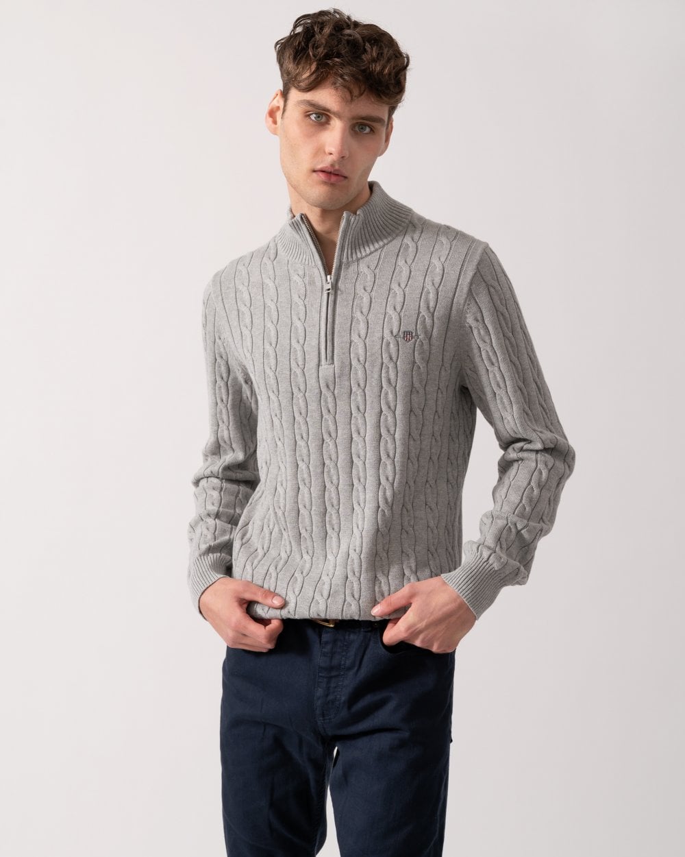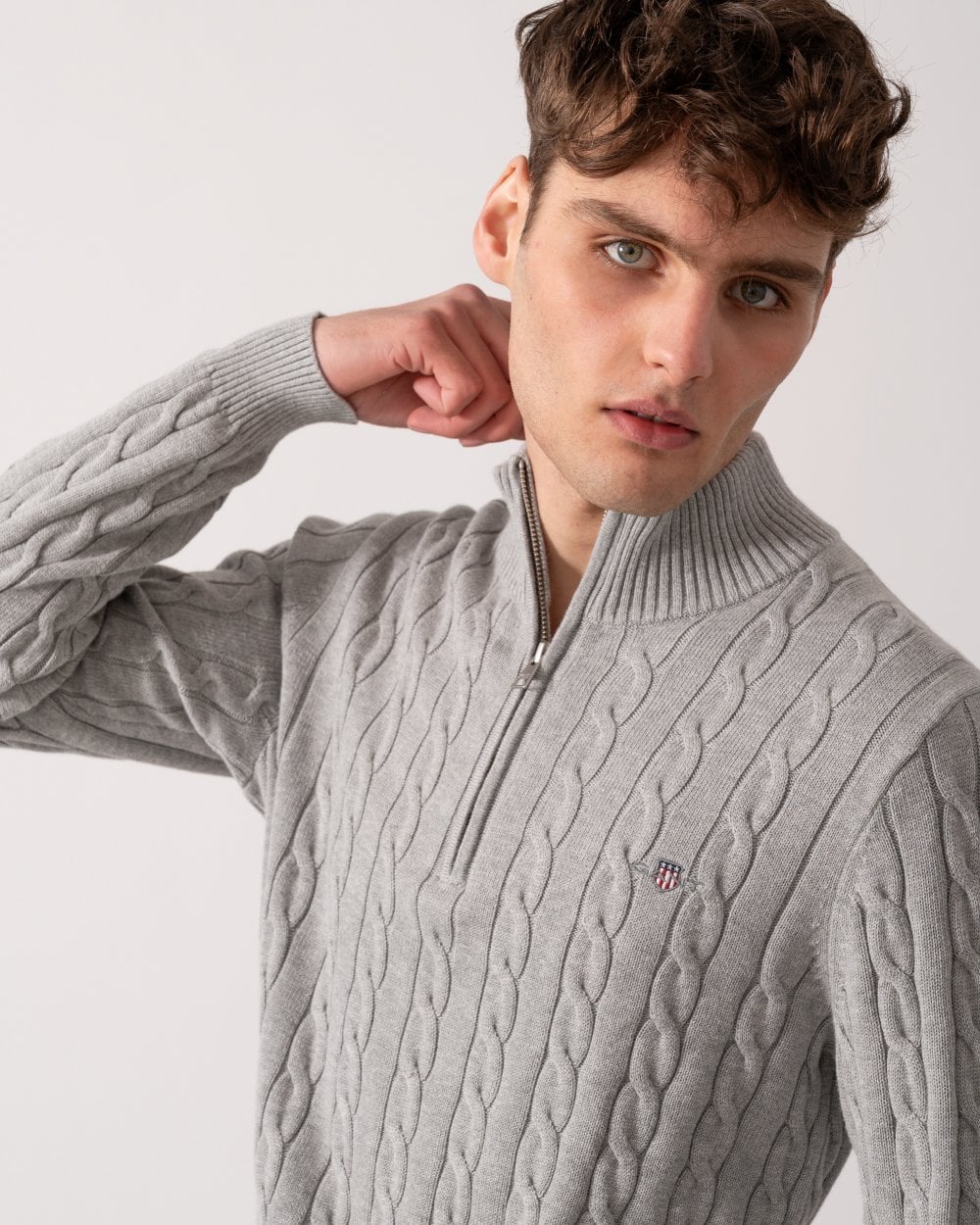 GANT Mens Cotton Cable Half Zip Jumper in 93 Grey Melange