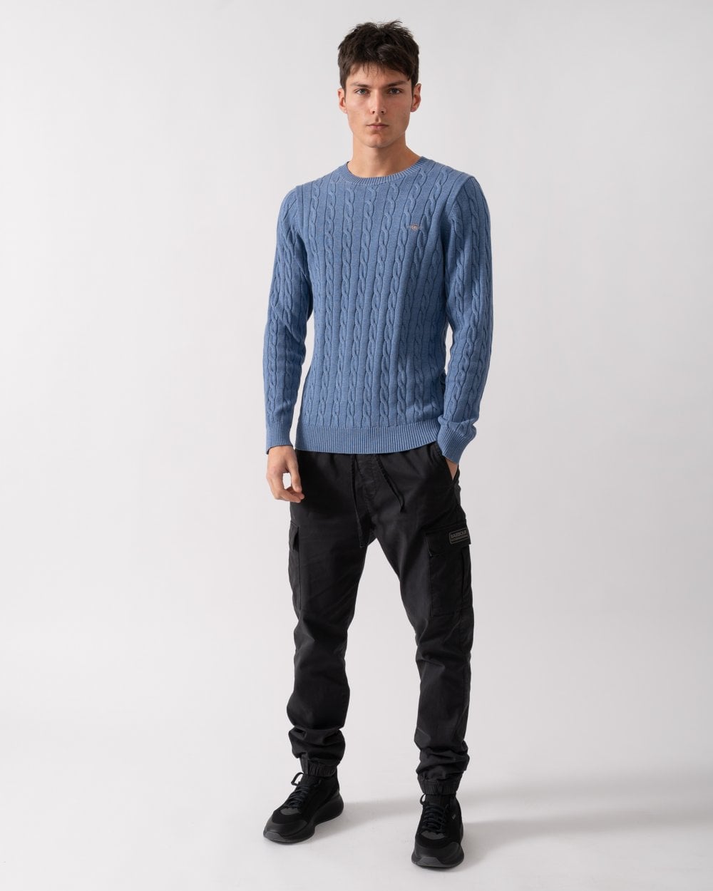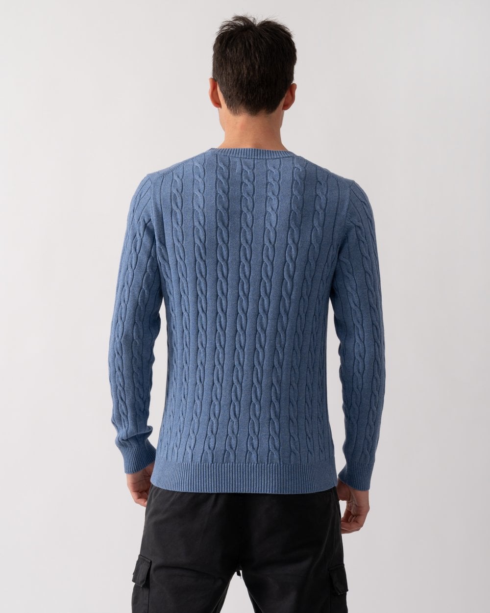 Mens Cotton Cable Knit Crew Neck Jumper - 906 Denim Blue Melange