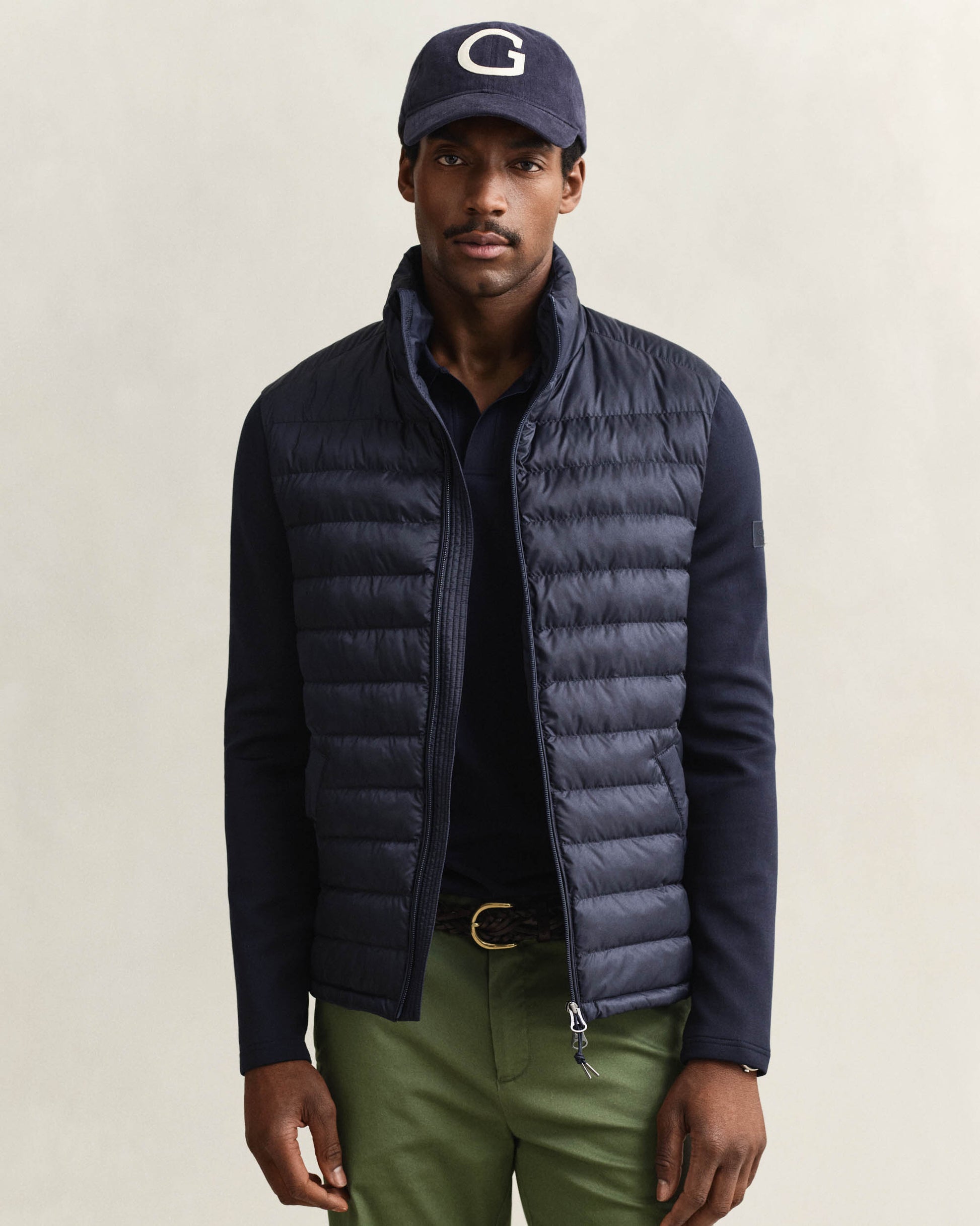 This hybrid jacket from Gant combines a quilted body made from recycled polyester with soft jersey cotton sleeves. Fully lined and lightly padded, it’s designed in a regular fit for added comfort and insulation. Key details include a stand collar, zip closure, elasticated cuffs, and a drawstring hem. It’s finished with two zipped front pockets, one interior pocket, a rubber badge at the sleeve, and Gant’s signature locker loop at the back.