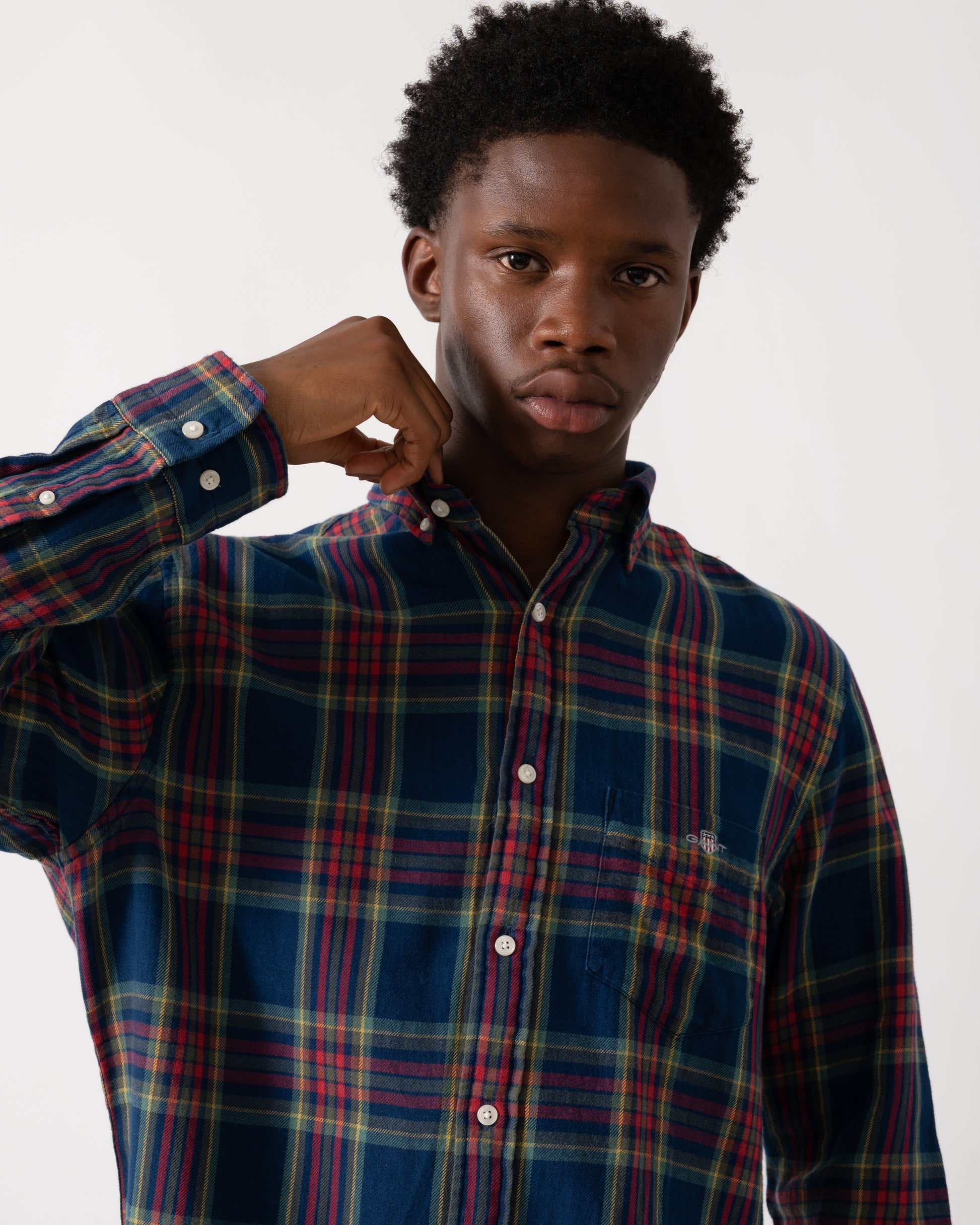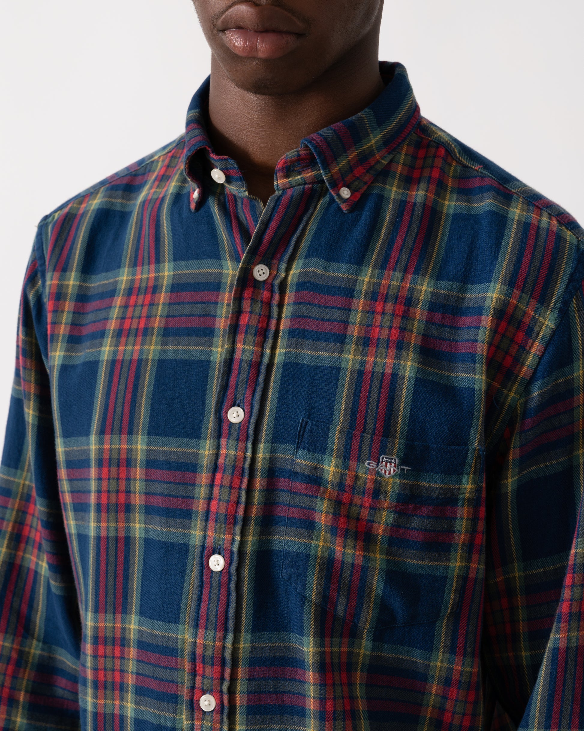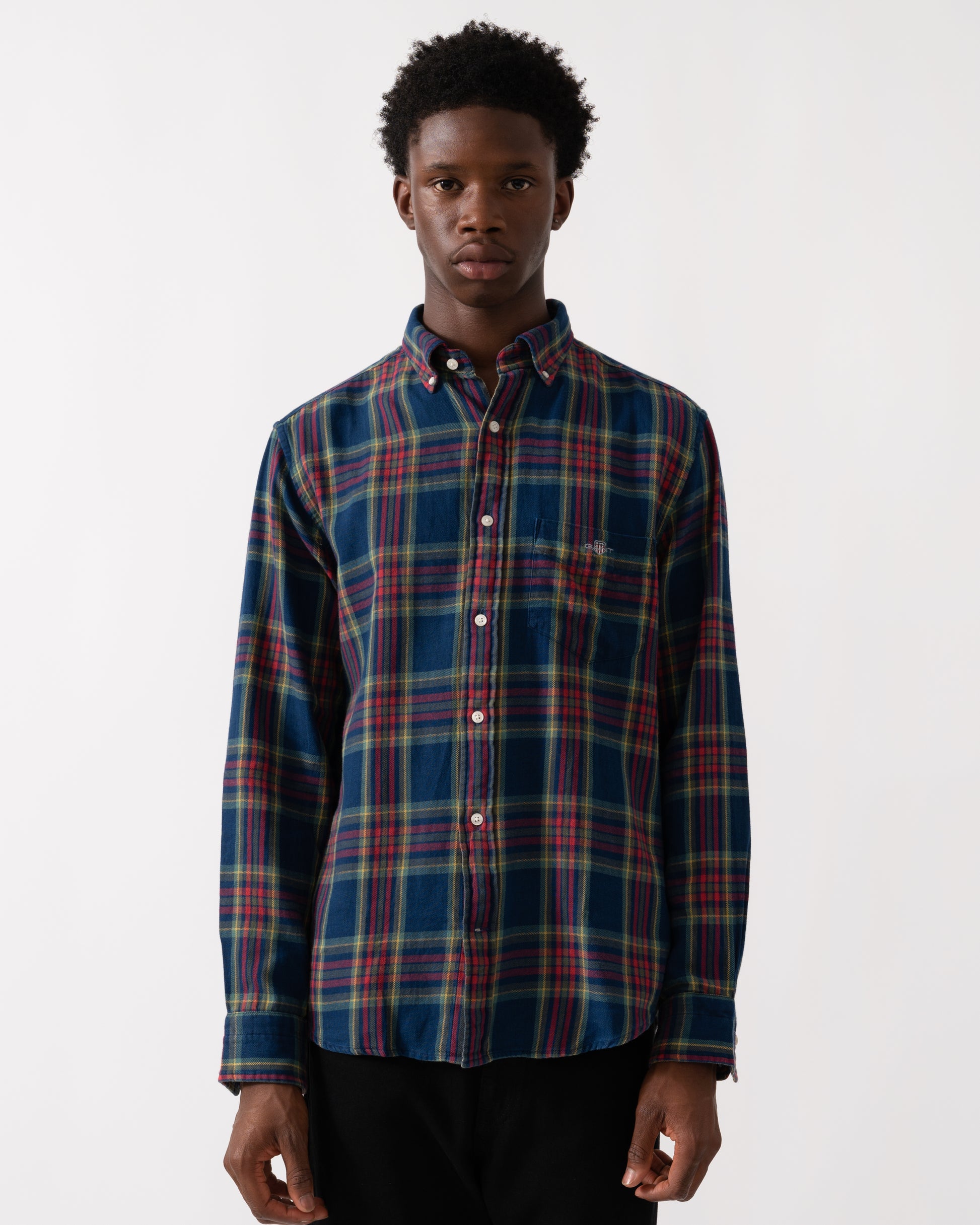 This shirt, made from classic twill fabric, showcases a yarn-dyed indigo check pattern and a regular fit. It includes a traditional button-down collar, adjustable cuffs, a curved hem, recycled polyester buttons, and an embroidered GANT shield graphic on the chest pocket.
