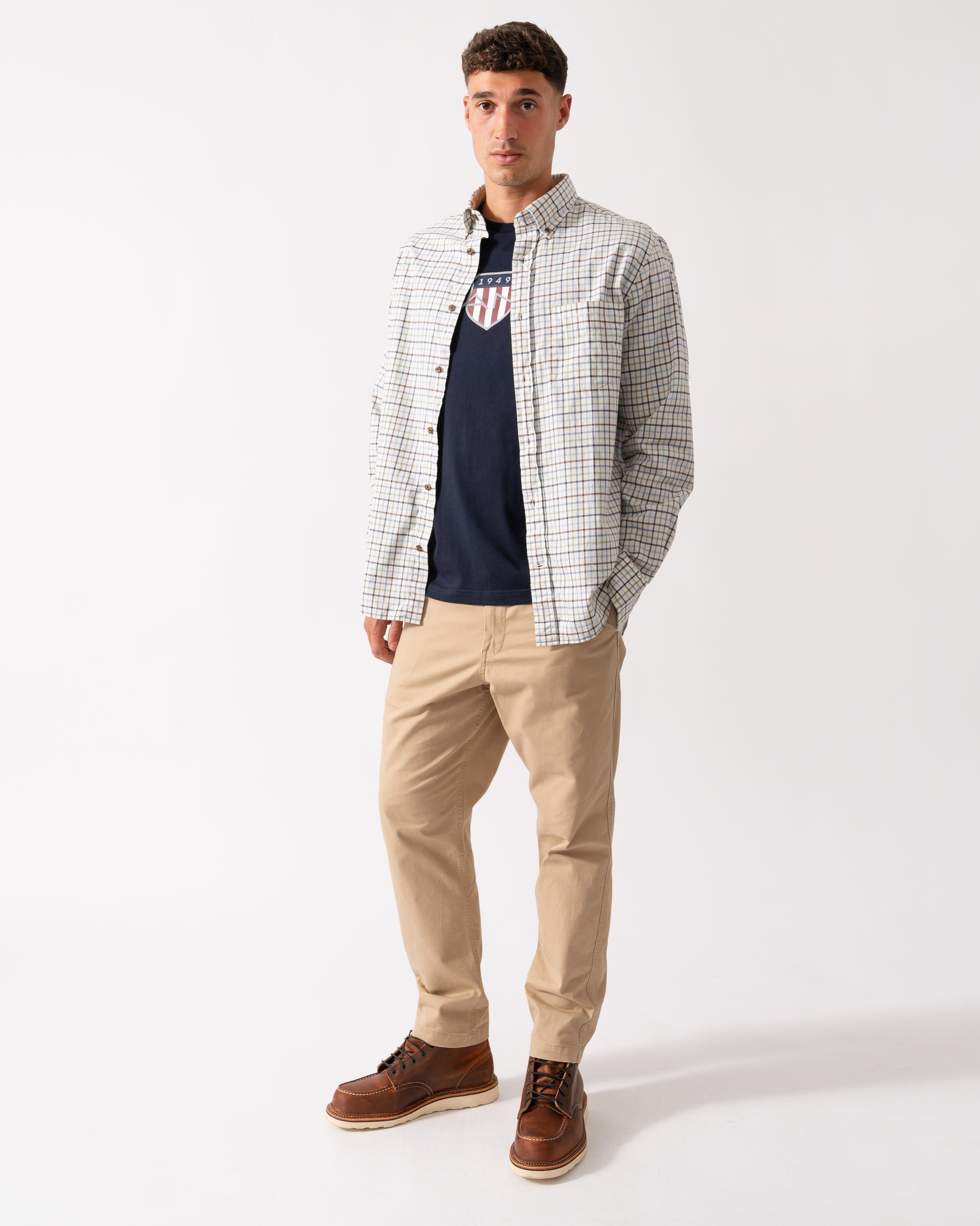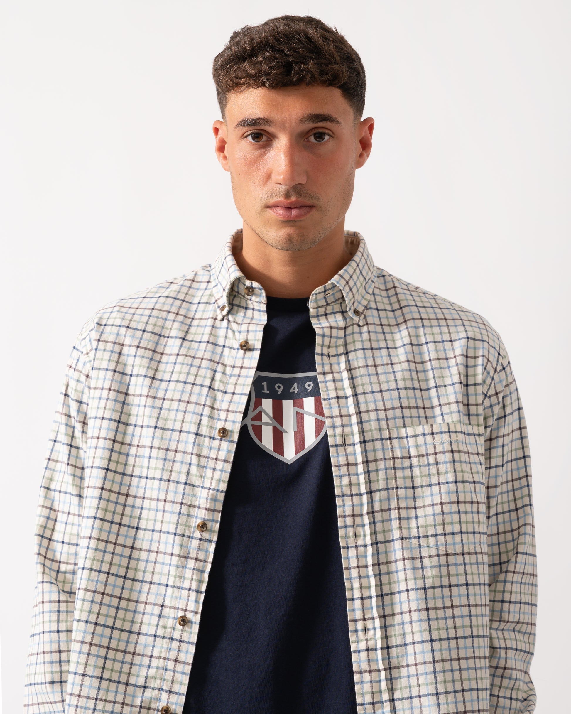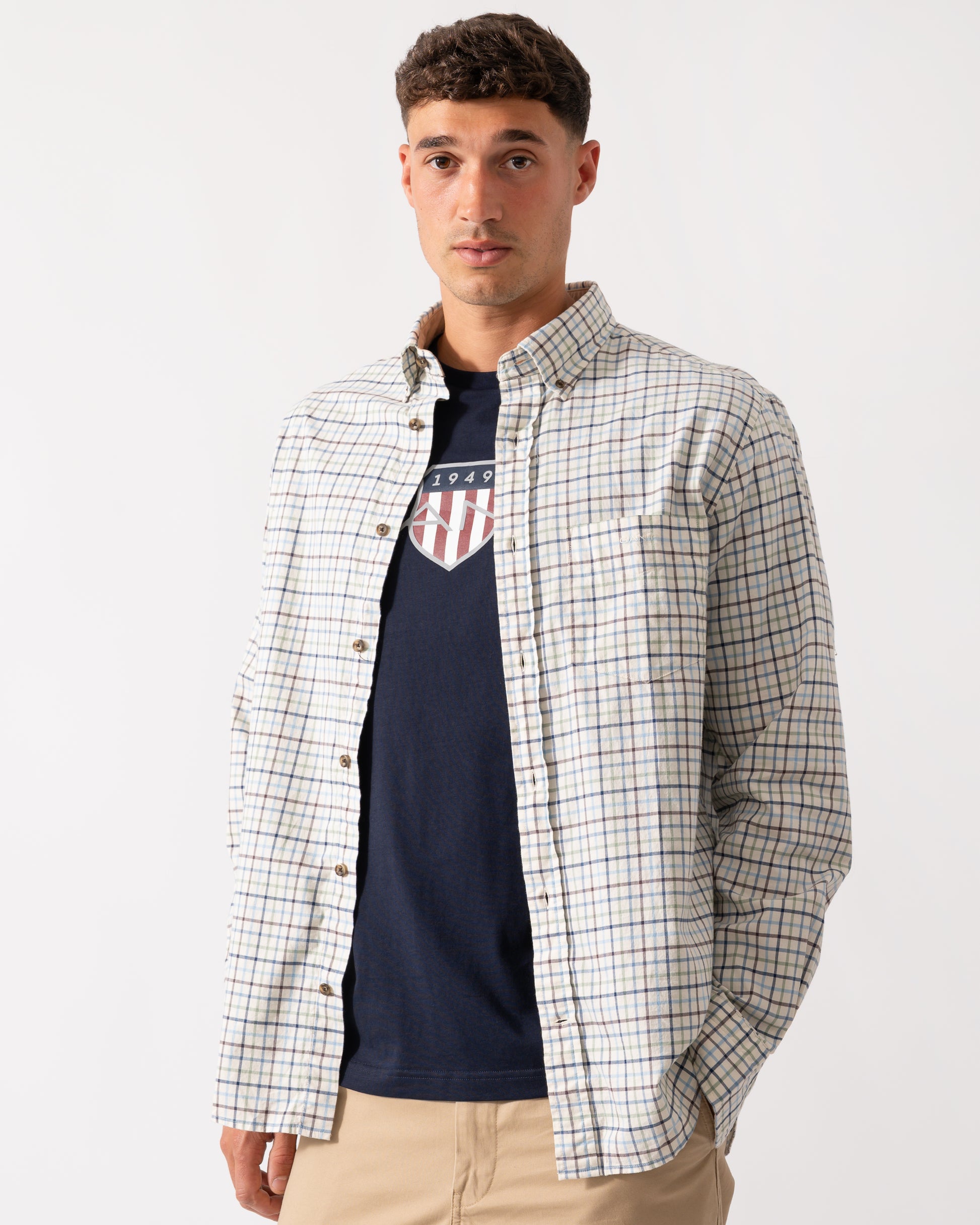 Crafted from a heavy twill fabric, this shirt is designed with a regular fit and showcases an all-over tattersall checked pattern. It features the GANT logo embroidered on the chest pocket and includes a button-down collar, adjustable cuffs, a curved hem, imitation horn buttons, and a box pleat with the signature locker loop at the back.