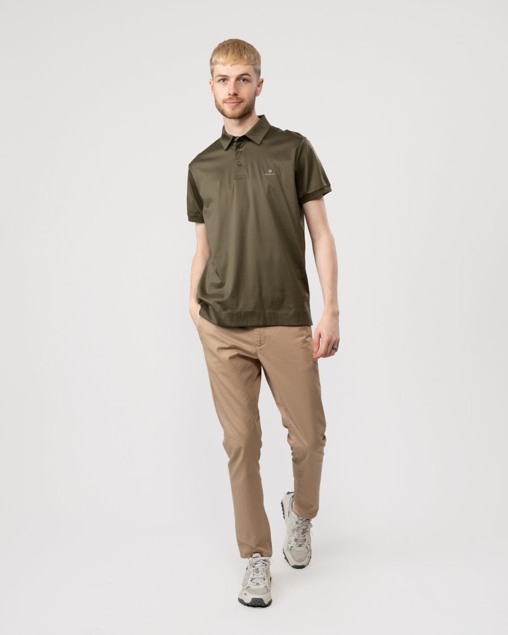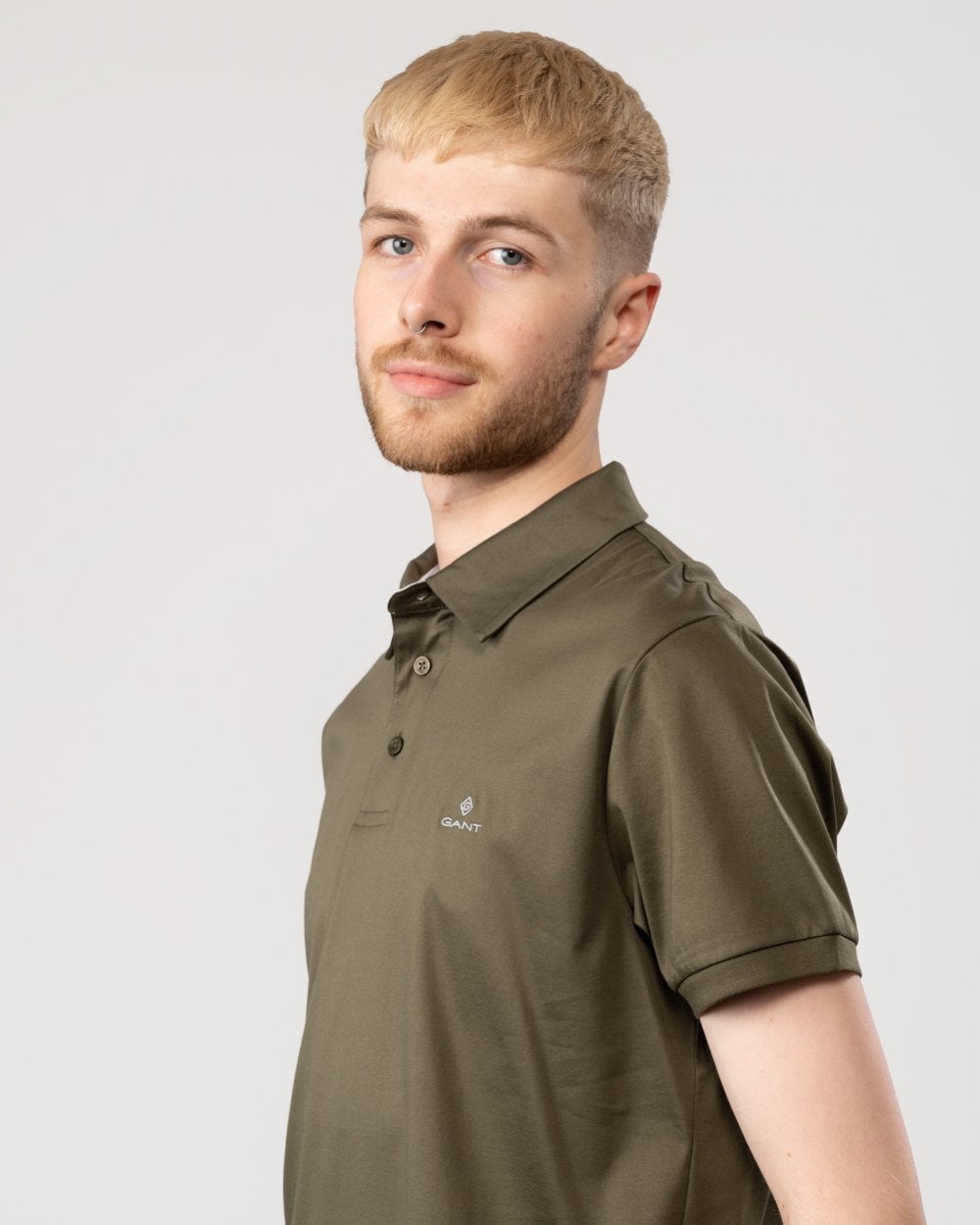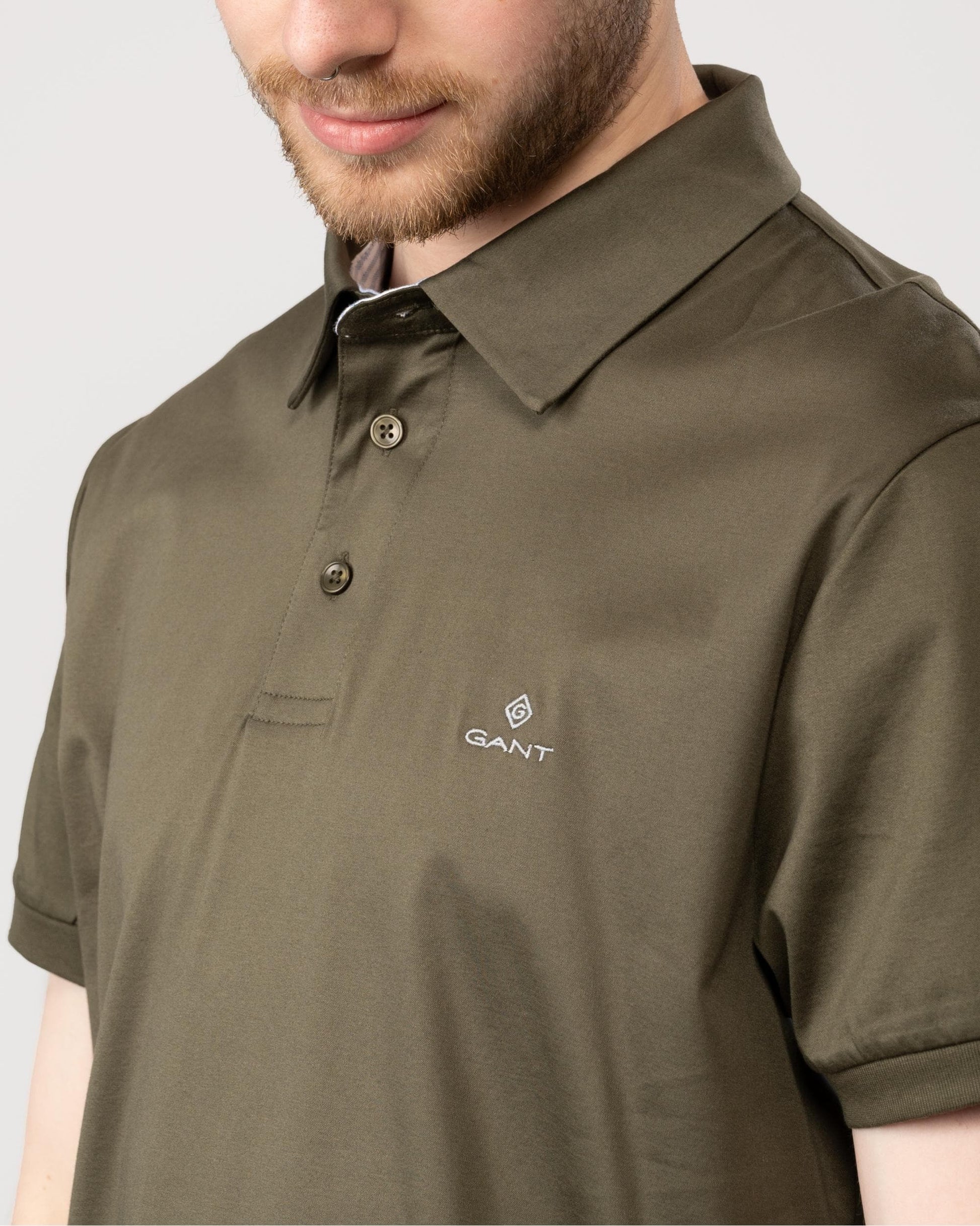 Mercerized Jersey SS Rugger with woven oxford detailing on inner collar, Gant lock up embroidery on chest, Neckpad, and Sideslits.