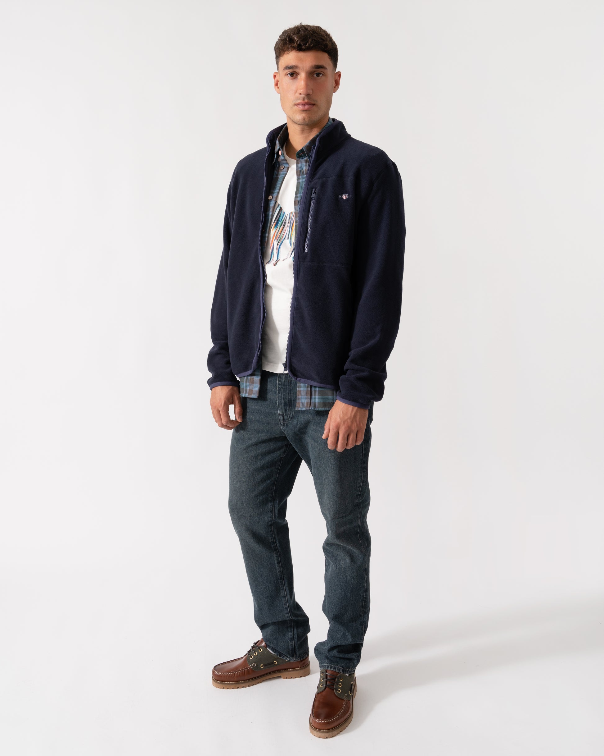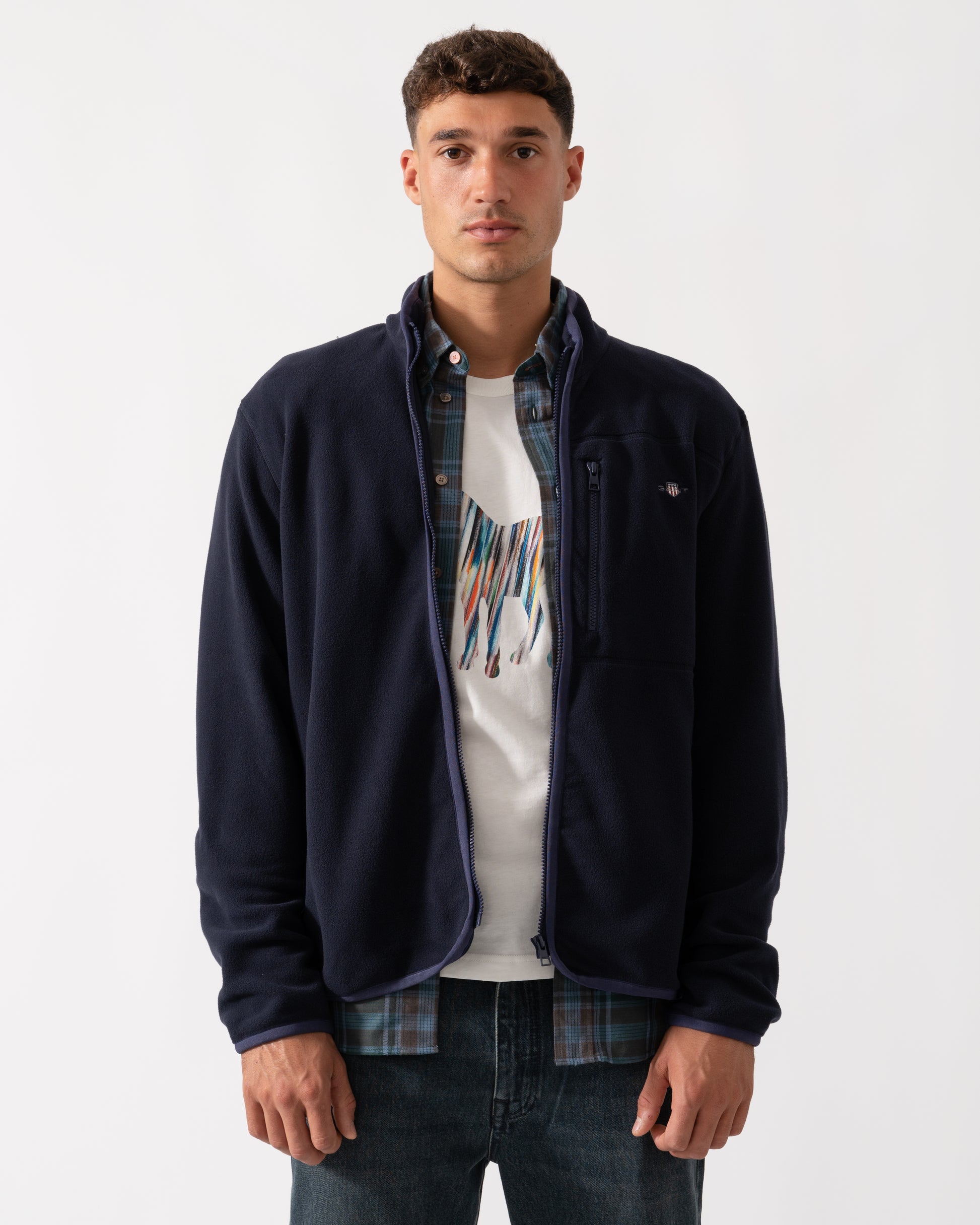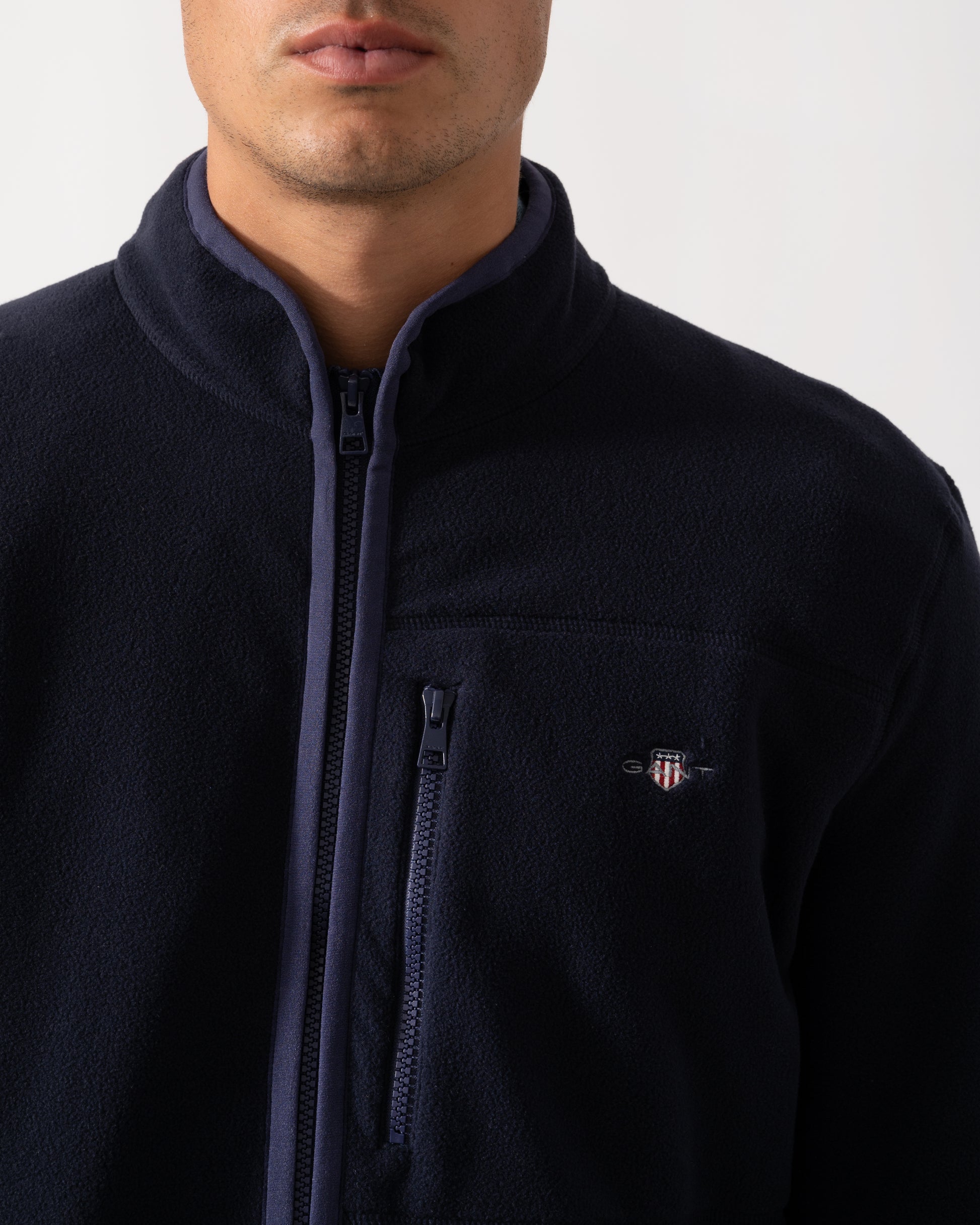 This fleece jacket is a must-have for the upcoming seasons. Made from 100% recycled polyester with a regular fit, it includes a contrast color bindings and zip pullers and two front pockets as well as one chest pocket for extra convenience. The design is finished with a GANT shield graphic embroidered at the chest. This product is made with recycled polyester, aligned with our sustainability strategy to support circularity.