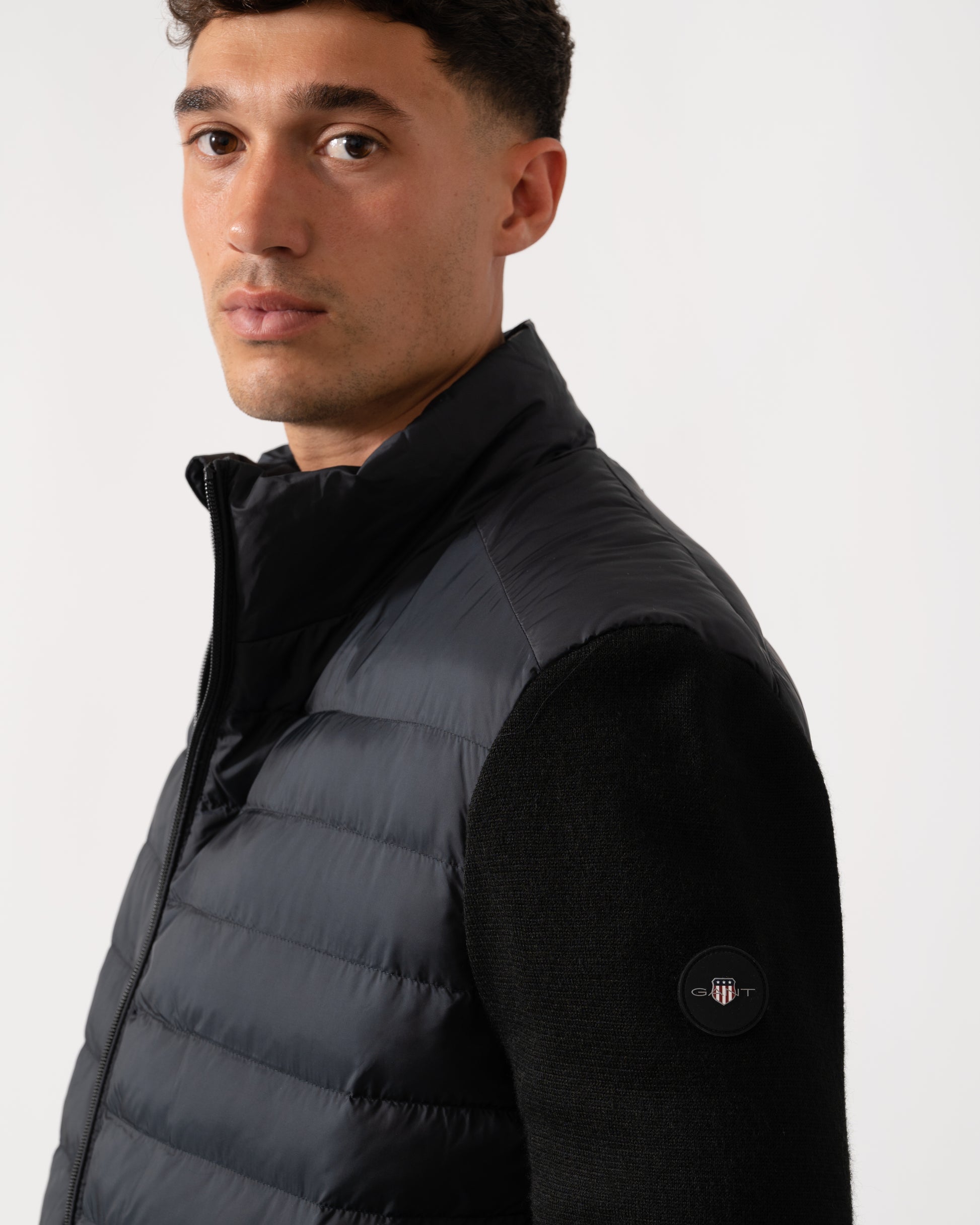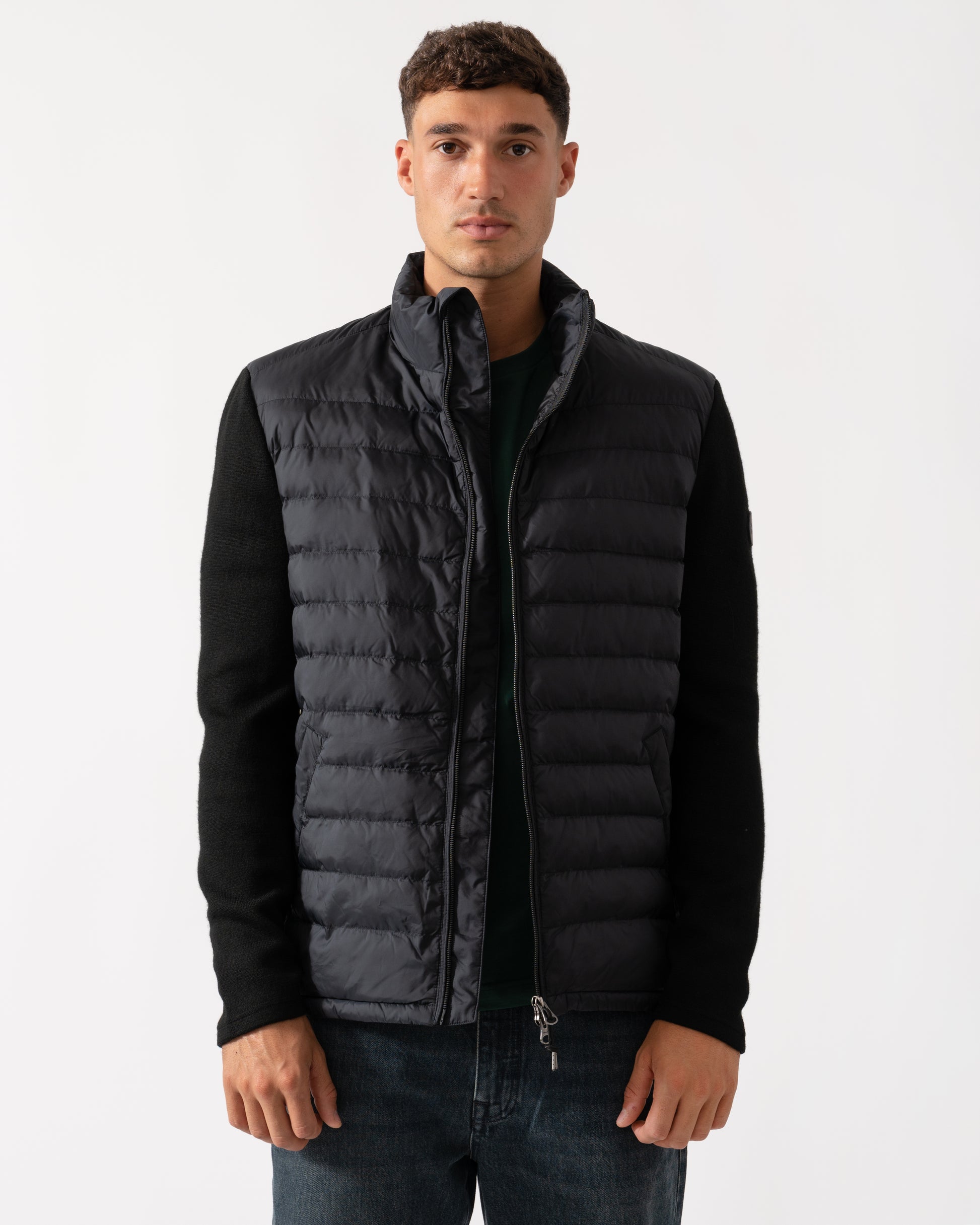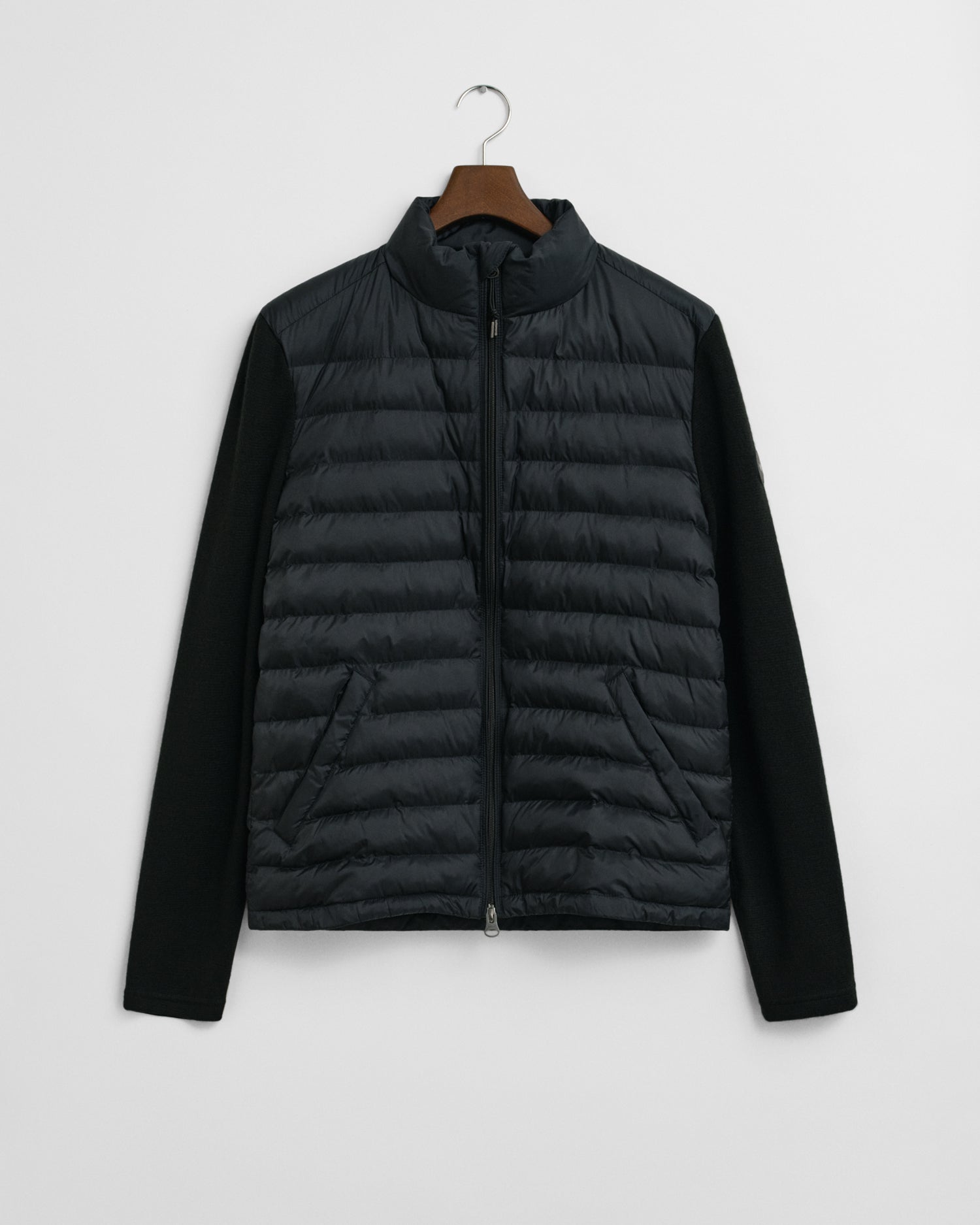 This jacket, designed with a mixed media approach, combines channel quilting on the body with knitted wool-blend sleeves for a contemporary look. Tailored for a regular fit, it includes a front zip closure, side zip pockets, a drawstring hem, and a silicone badge on the sleeve. The jacket is fully lined, featuring a lightly insulated interior and an additional pocket for extra convenience. This product is made with recycled polyester, aligned with our sustainability strategy to support circularity.