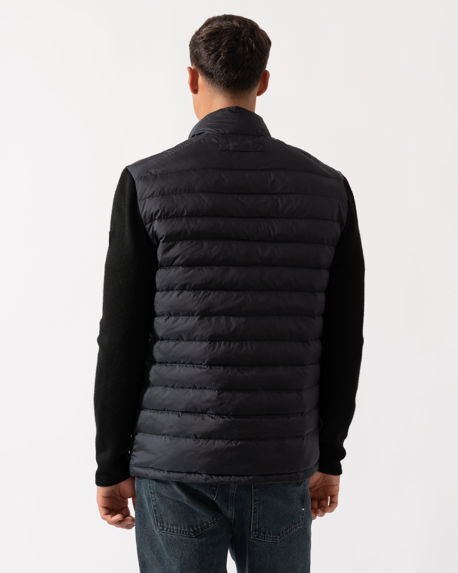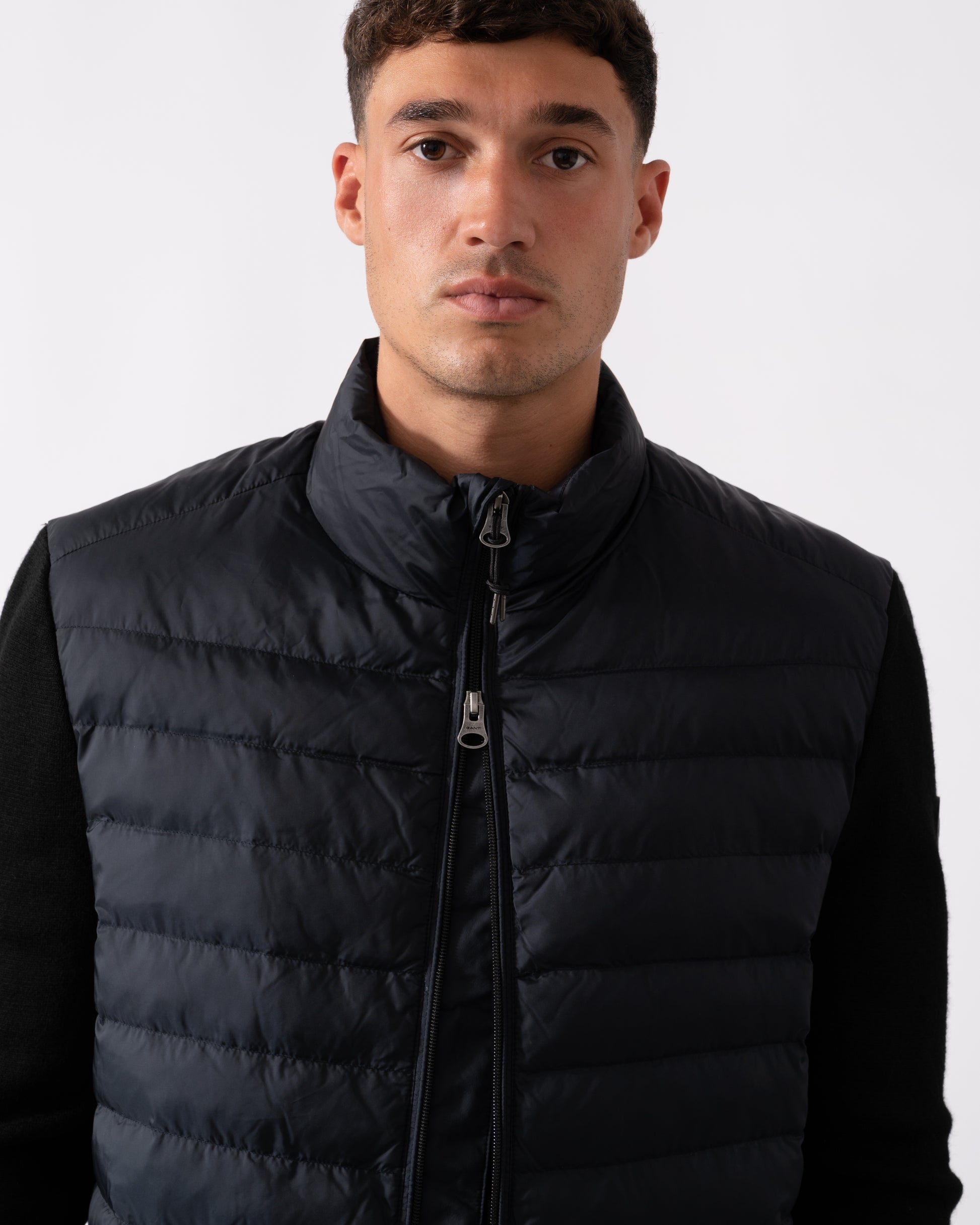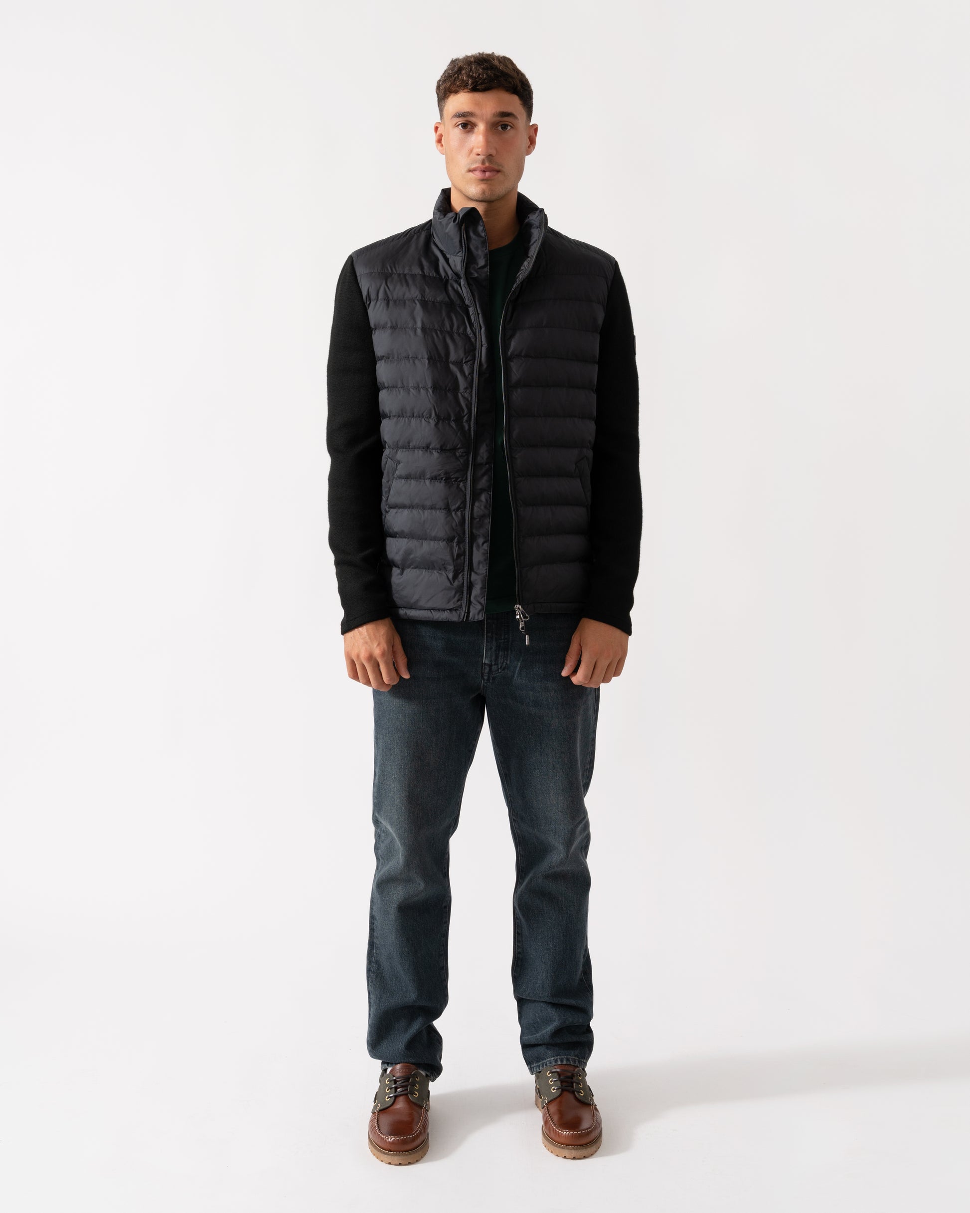 This jacket, designed with a mixed media approach, combines channel quilting on the body with knitted wool-blend sleeves for a contemporary look. Tailored for a regular fit, it includes a front zip closure, side zip pockets, a drawstring hem, and a silicone badge on the sleeve. The jacket is fully lined, featuring a lightly insulated interior and an additional pocket for extra convenience. This product is made with recycled polyester, aligned with our sustainability strategy to support circularity.