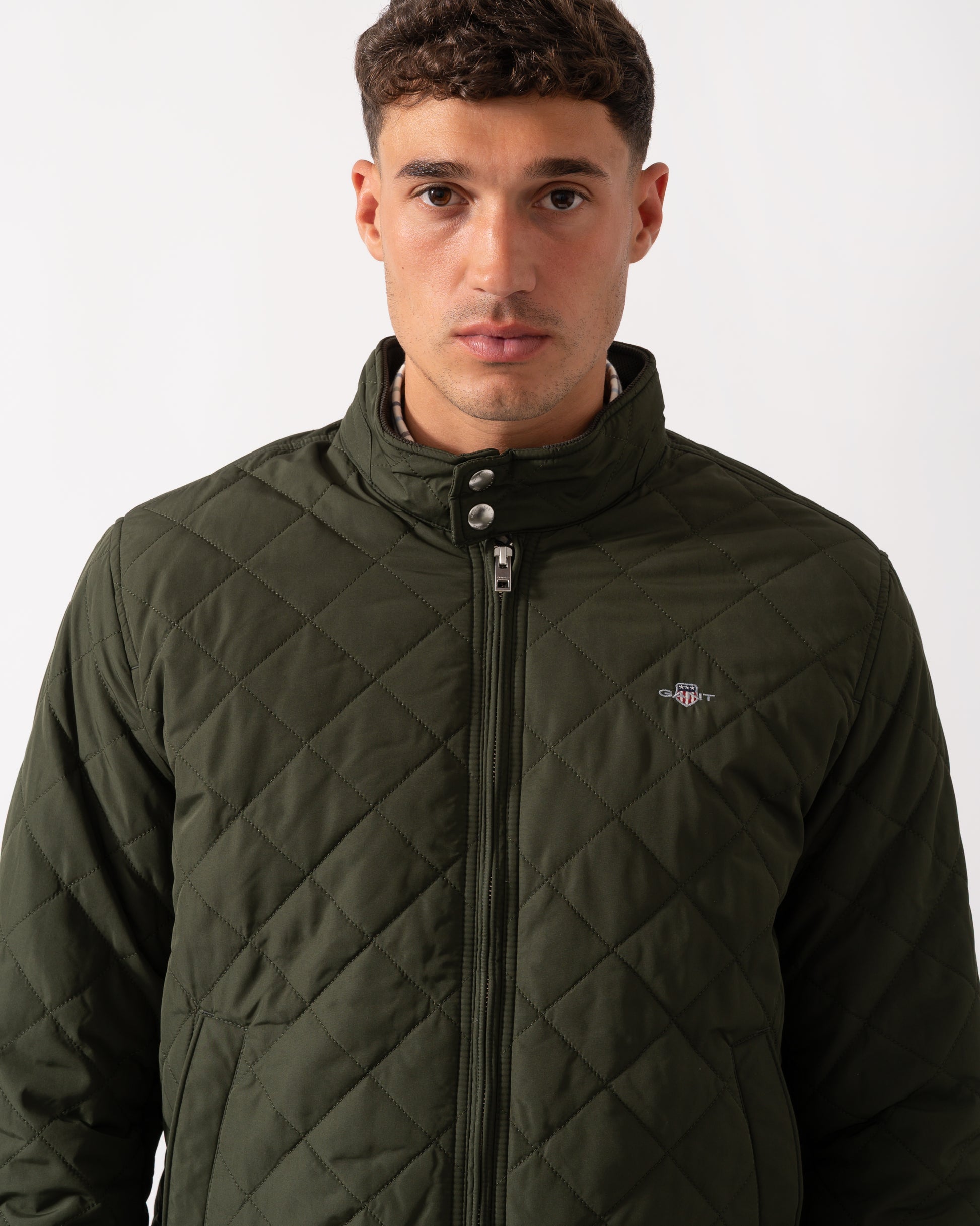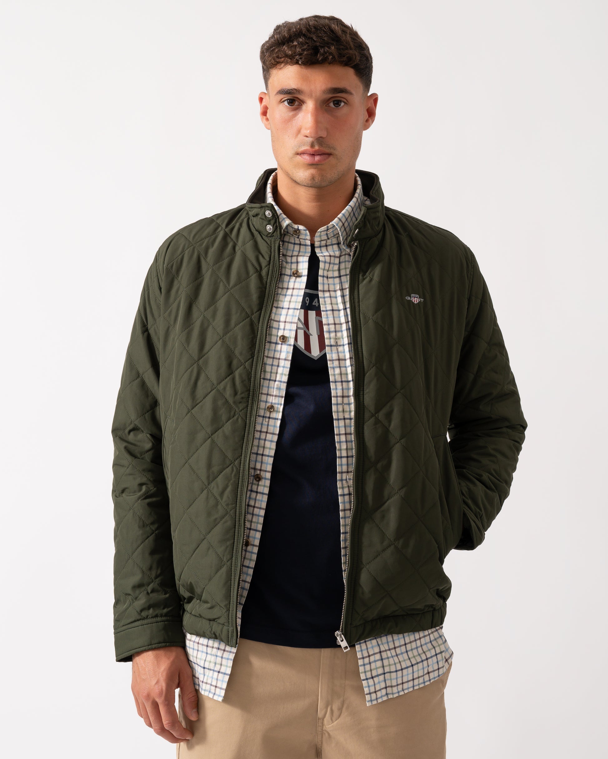 Made with 100% recycled polyester filling, this quilted windcheater jacket from GANT is an outerwear essential. Designed to be water-repellent, it features diamond quilting, slanted welt side pockets, a stand collar and an elasticated hem and cuffs with press buttons at the sleeves for an adjustable fit. This jacket is accented with a GANT graphic embroidered at the chest and their signature brand logo embroidered at the back locker loop. The fit is regular and sits just above the hips.