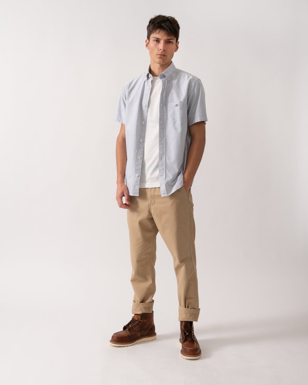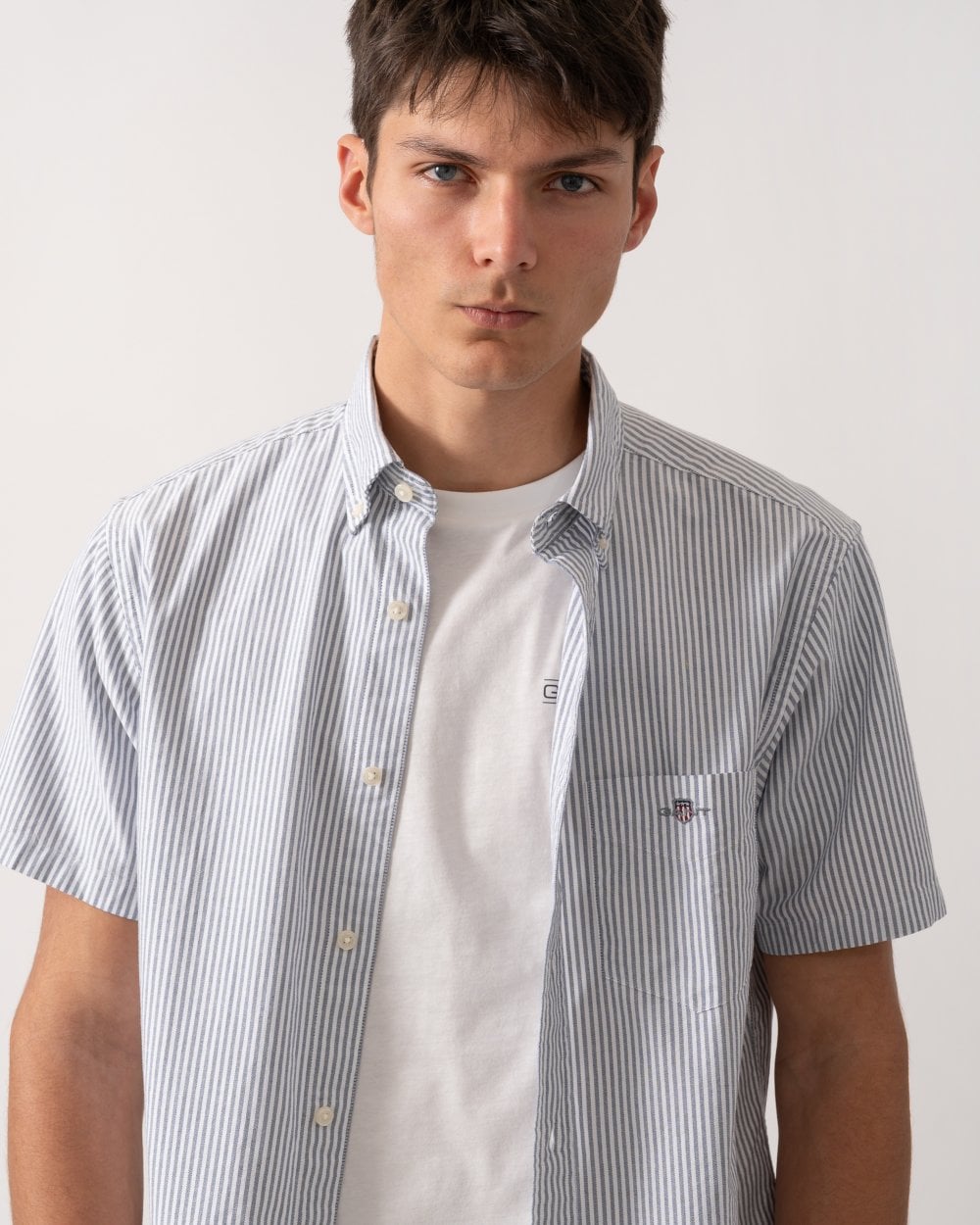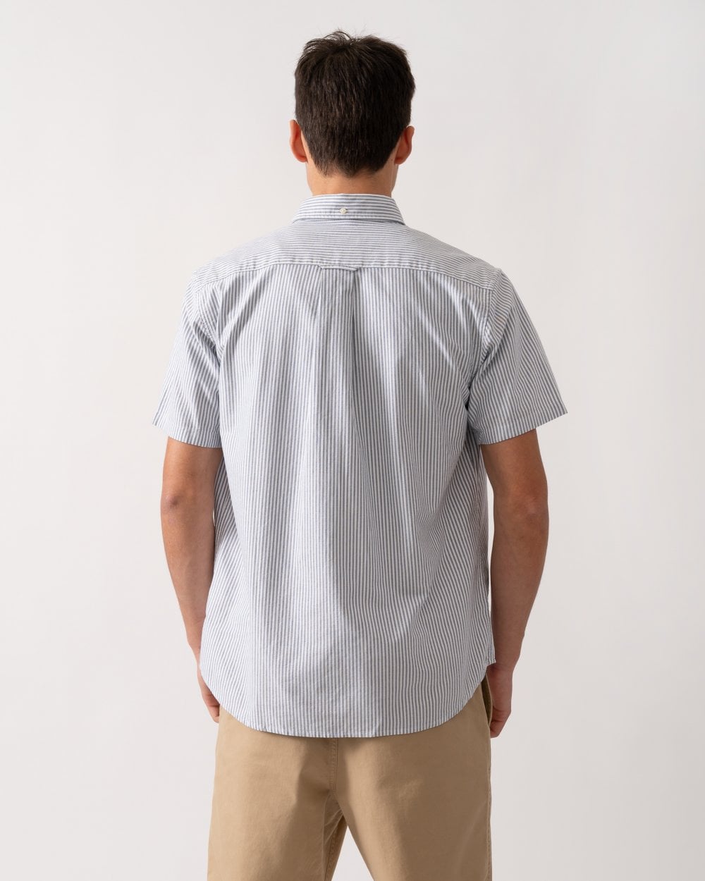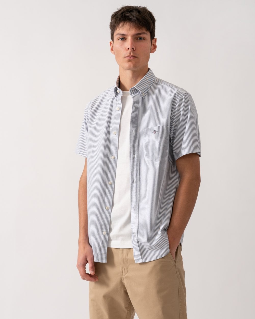 Versatile, foundational, and perfect for smart-casual occasions, this Classic Oxford Shirt is tailored for a regular fit and features yarn-dyed stripes. Designed with short sleeves for warmer summer days, it is made from cotton using a soft Oxford weave fabric drawn from GANT's shirting archives. The shirt includes a button-down collar and a box pleat with the signature locker loop at the back. It is finished with a subtle GANT shield graphic embroidered on the chest pocket.