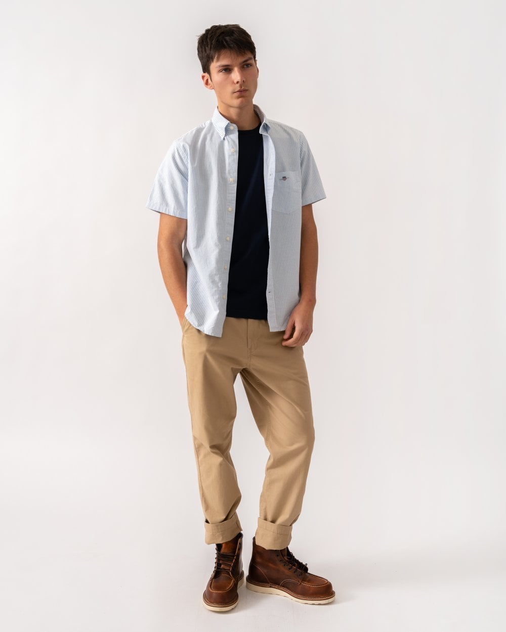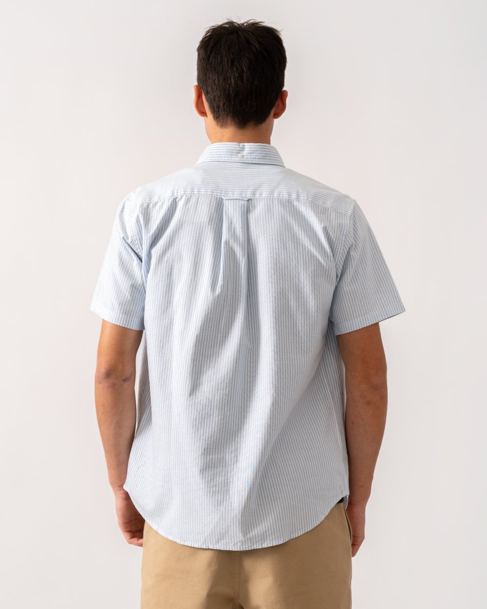 Versatile, foundational, and perfect for smart-casual occasions, this Classic Oxford Shirt is tailored for a regular fit and features yarn-dyed stripes. Designed with short sleeves for warmer summer days, it is made from cotton using a soft Oxford weave fabric drawn from GANT's shirting archives. The shirt includes a button-down collar and a box pleat with the signature locker loop at the back. It is finished with a subtle GANT shield graphic embroidered on the chest pocket.