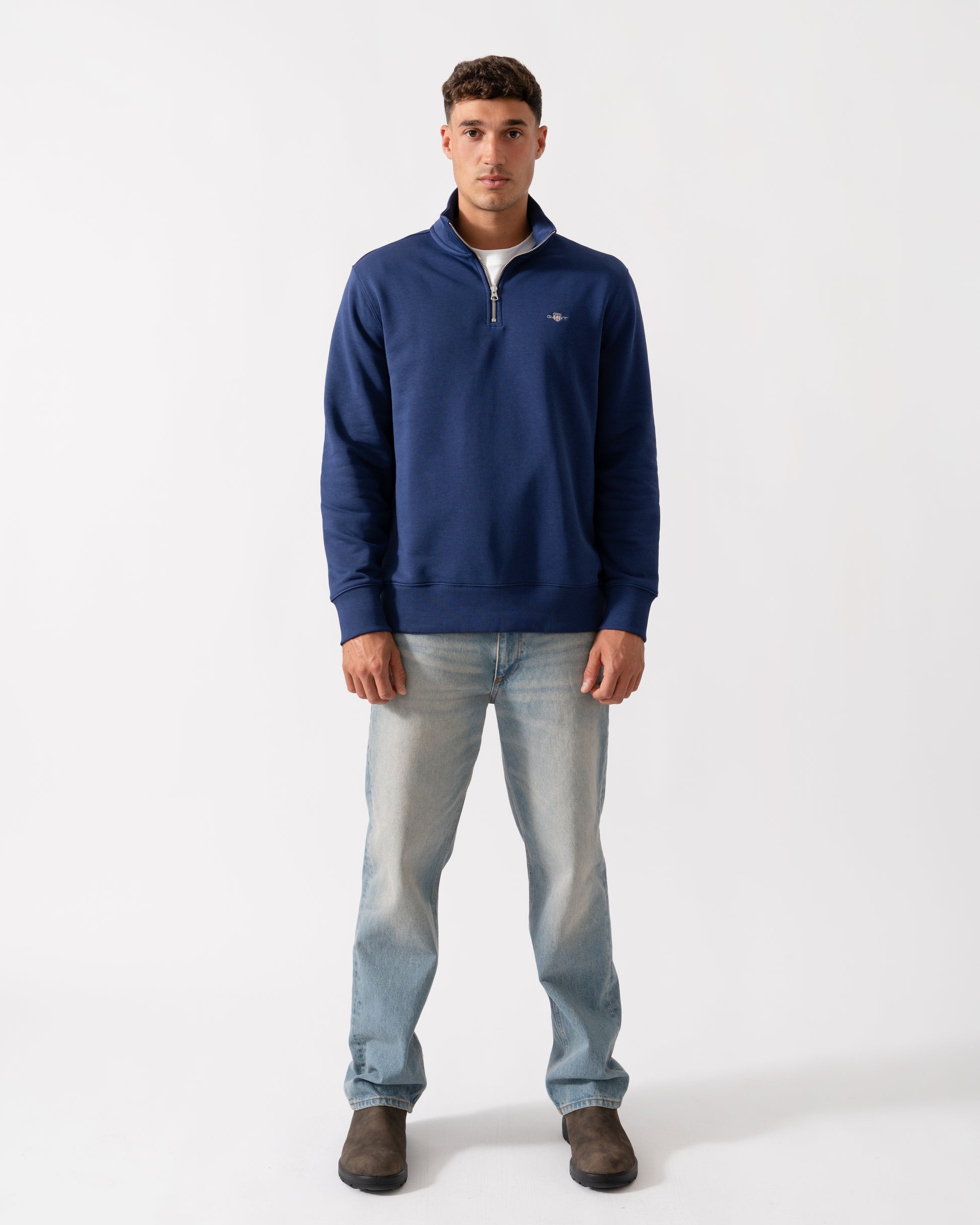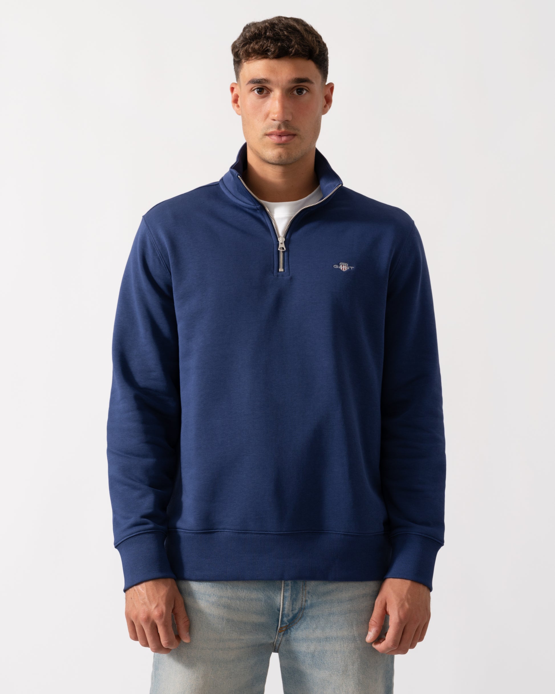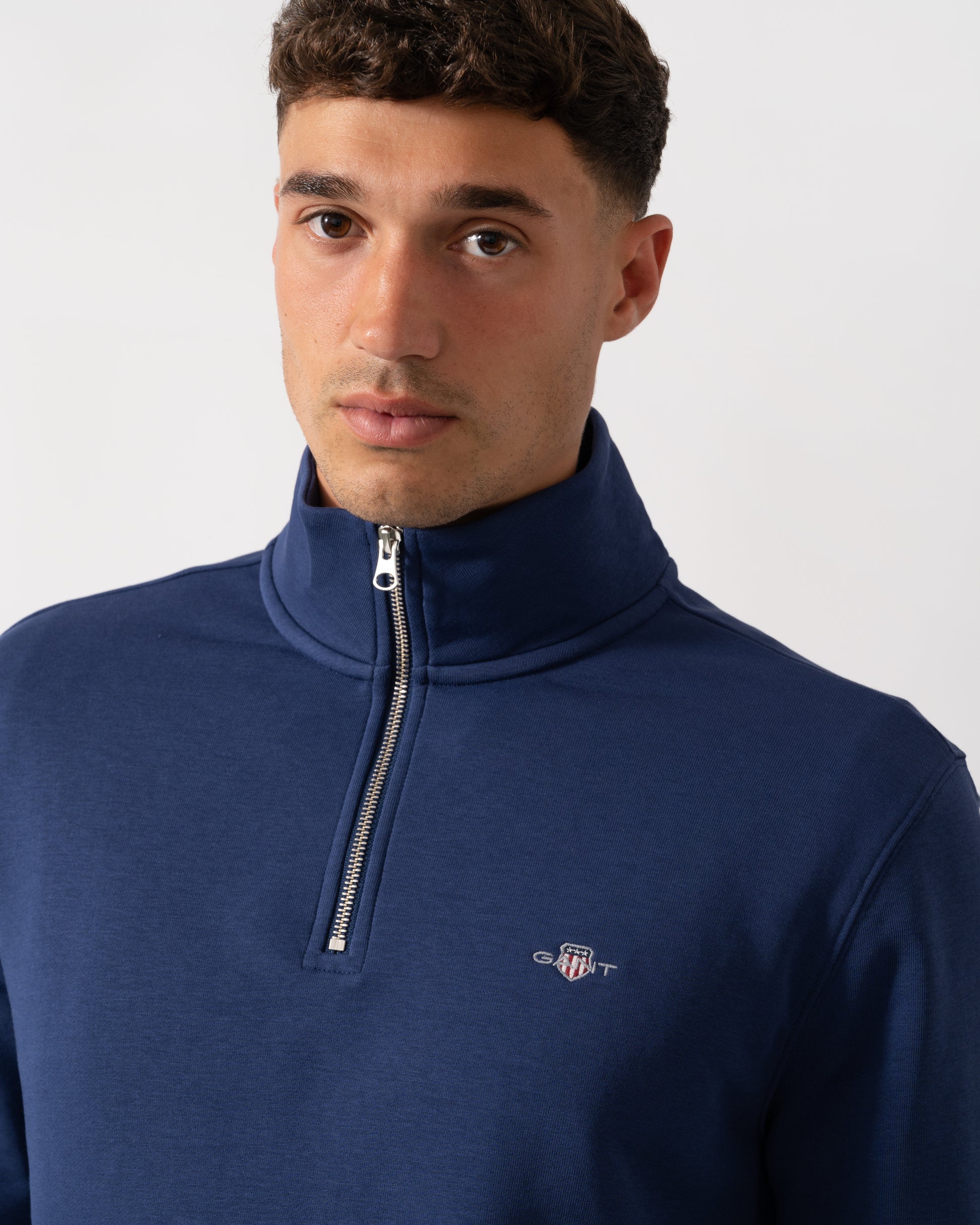 Crafted in a soft cotton blend, this GANT sweatshirt is designed for a regular fit. It features a half-zip collar, ribbed detailing at the hem and cuffs and a small GANT shield graphic embroidered at the chest. Style with the matching GANT sweatpants for a cozy, coordinated set.