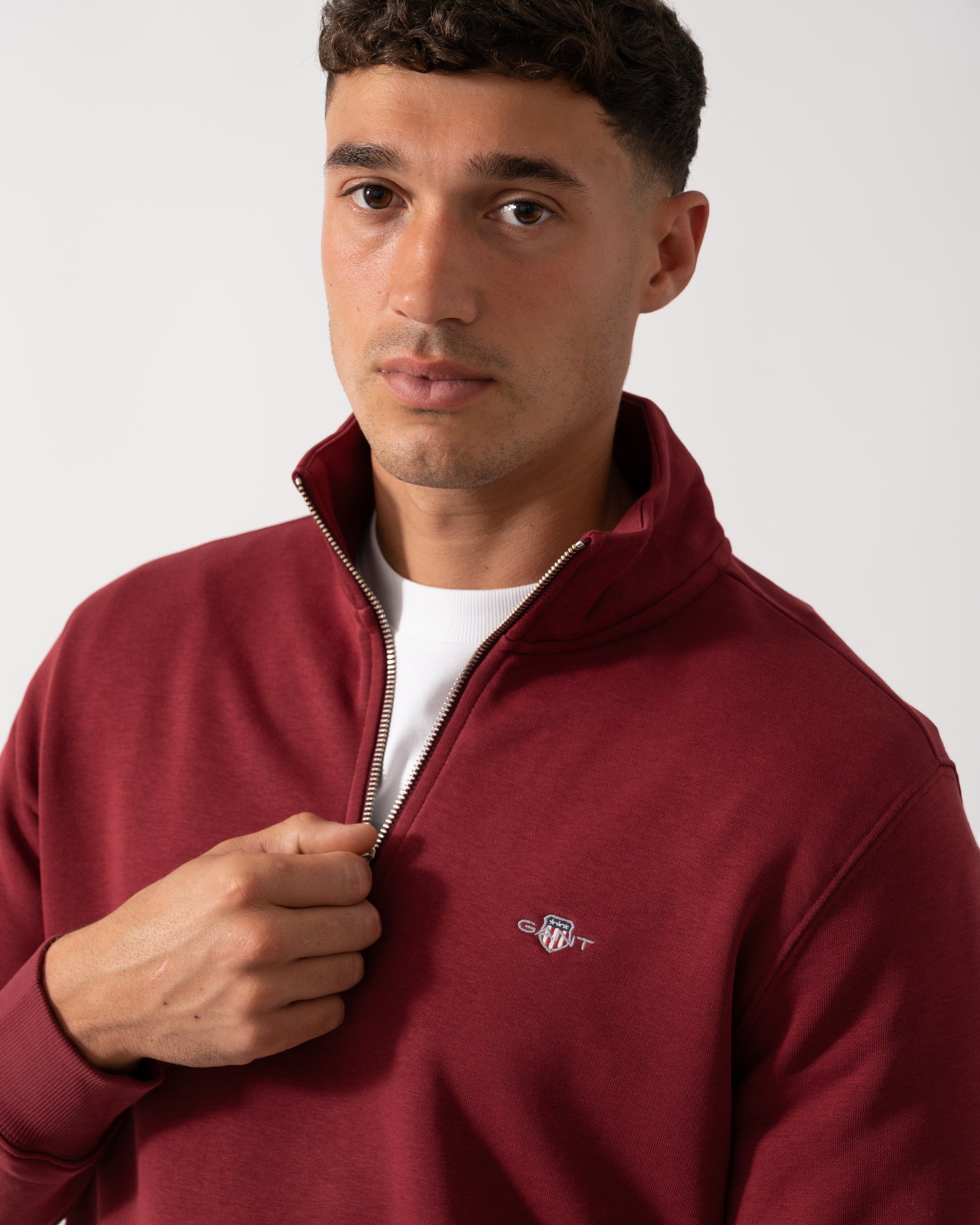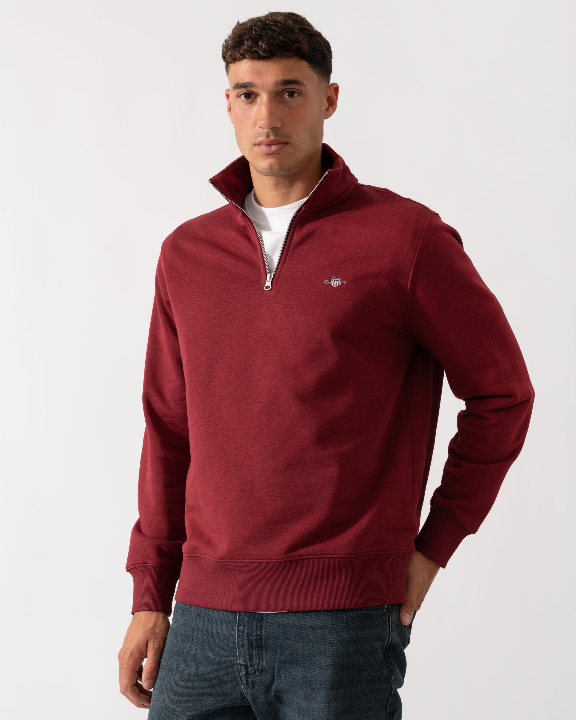 Crafted in a soft cotton blend, this GANT sweatshirt is designed for a regular fit. It features a half-zip collar, ribbed detailing at the hem and cuffs and a small GANT shield graphic embroidered at the chest. Style with the matching GANT sweatpants for a cozy, coordinated set.