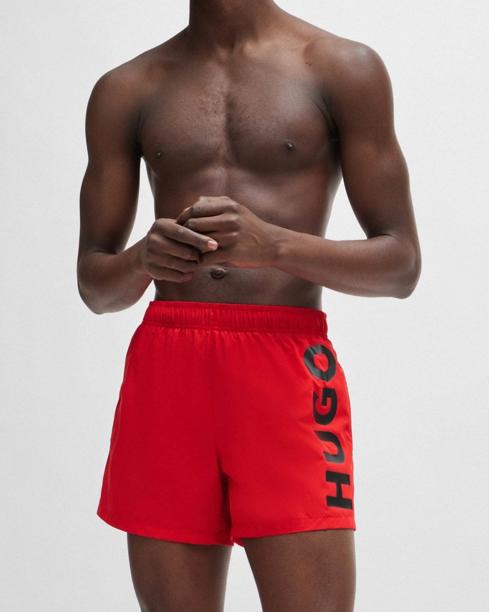 Modern swim shorts by HUGO. Designed in quick-drying fabric with full lining, this beach-ready pair features a vertical logo printed in contrast.