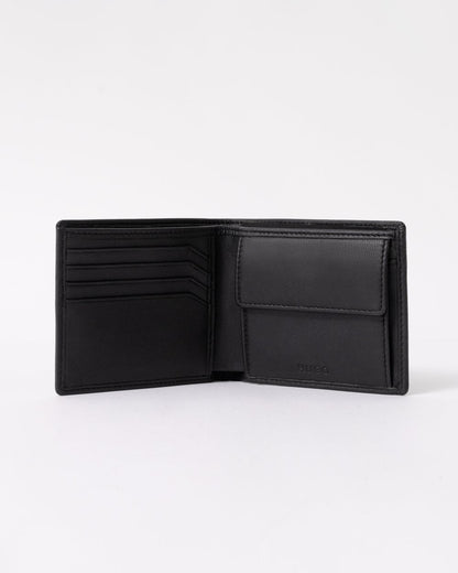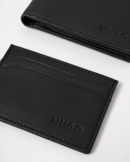 A leather bifold wallet and leather card holder with embossed HUGO logos, presented in a branded box.