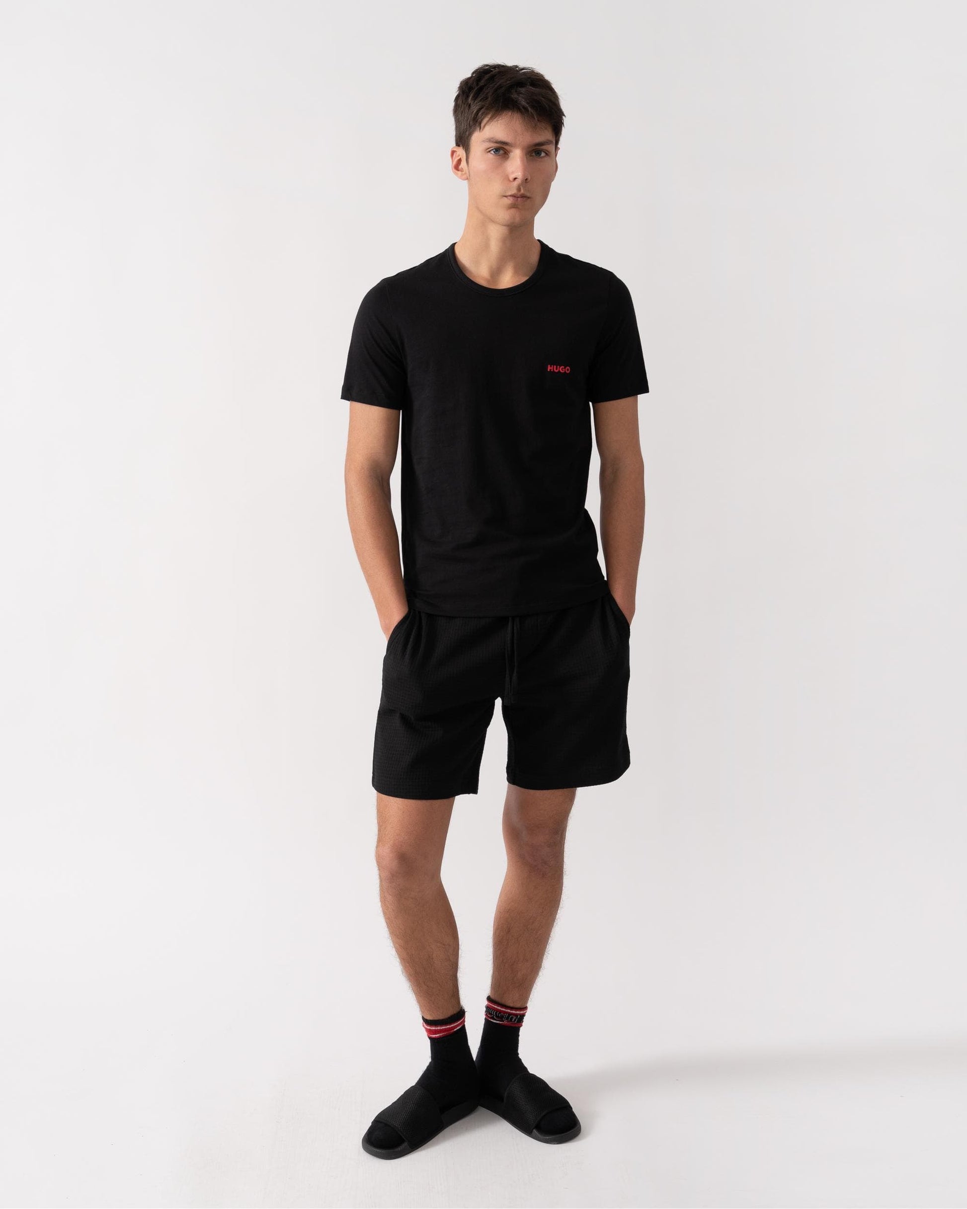Three underwear T-shirts cut to a regular fit in single jersey by HUGO Menswear. Each top has a logo print at the left chest.