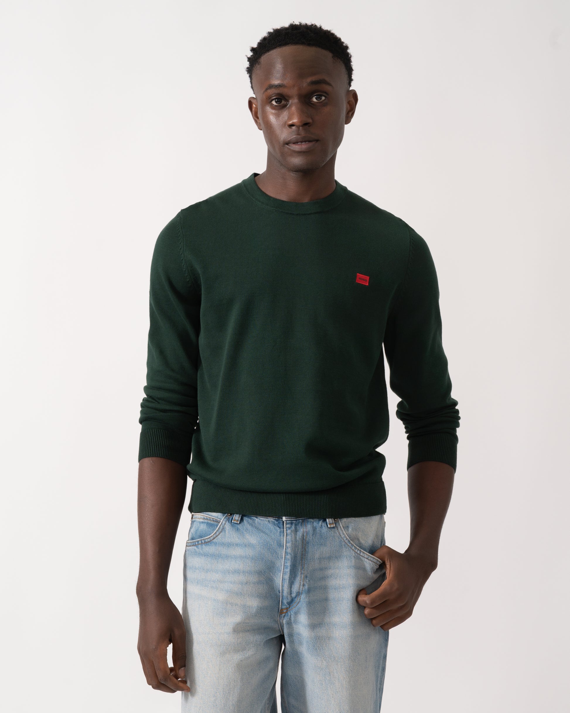 Featuring a woven logo label in signature red at the left chest, this super-soft sweater by HUGO Menswear is cut to a regular fit.