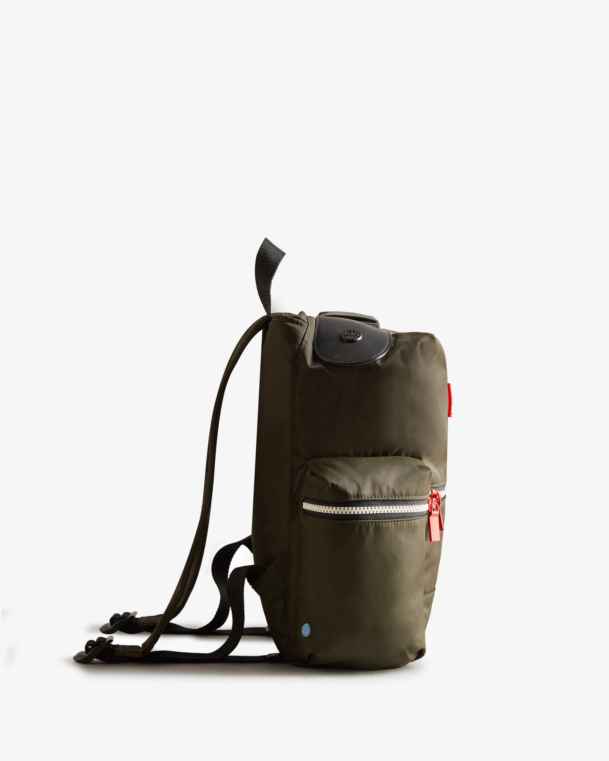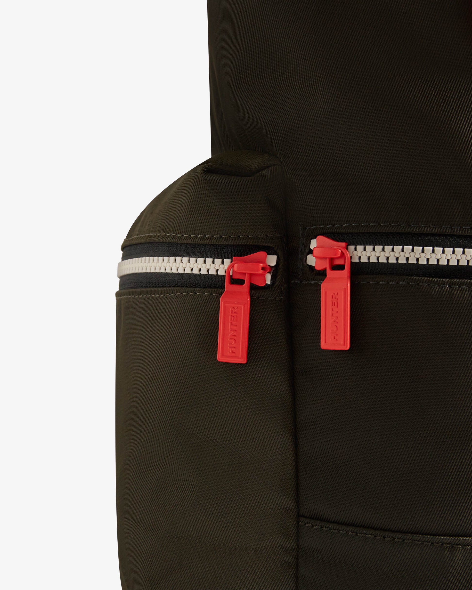 The Hunter Original Mini Nylon Top Clip is weatherproof and perfect for daily commutes and weekends away. Crafted from water-resistant nylon with a leather trim, it has a spacious interior with a 13L capacity. For extra security, it’s fitted with a parachute clip and zip closure at the top. The main body provides storage for a 12.5" laptop while the side pockets offer easy access to everyday necessities. This mini navy backpack is inspired by our iconic Original Tall Wellington boot with elements like the Hunter Tri-coloured zips and padded adjustable straps, which feature our signature quilting, integrated into the design. In a classic shade, it is undeniably distinctive and true to Hunter’s DNA.
