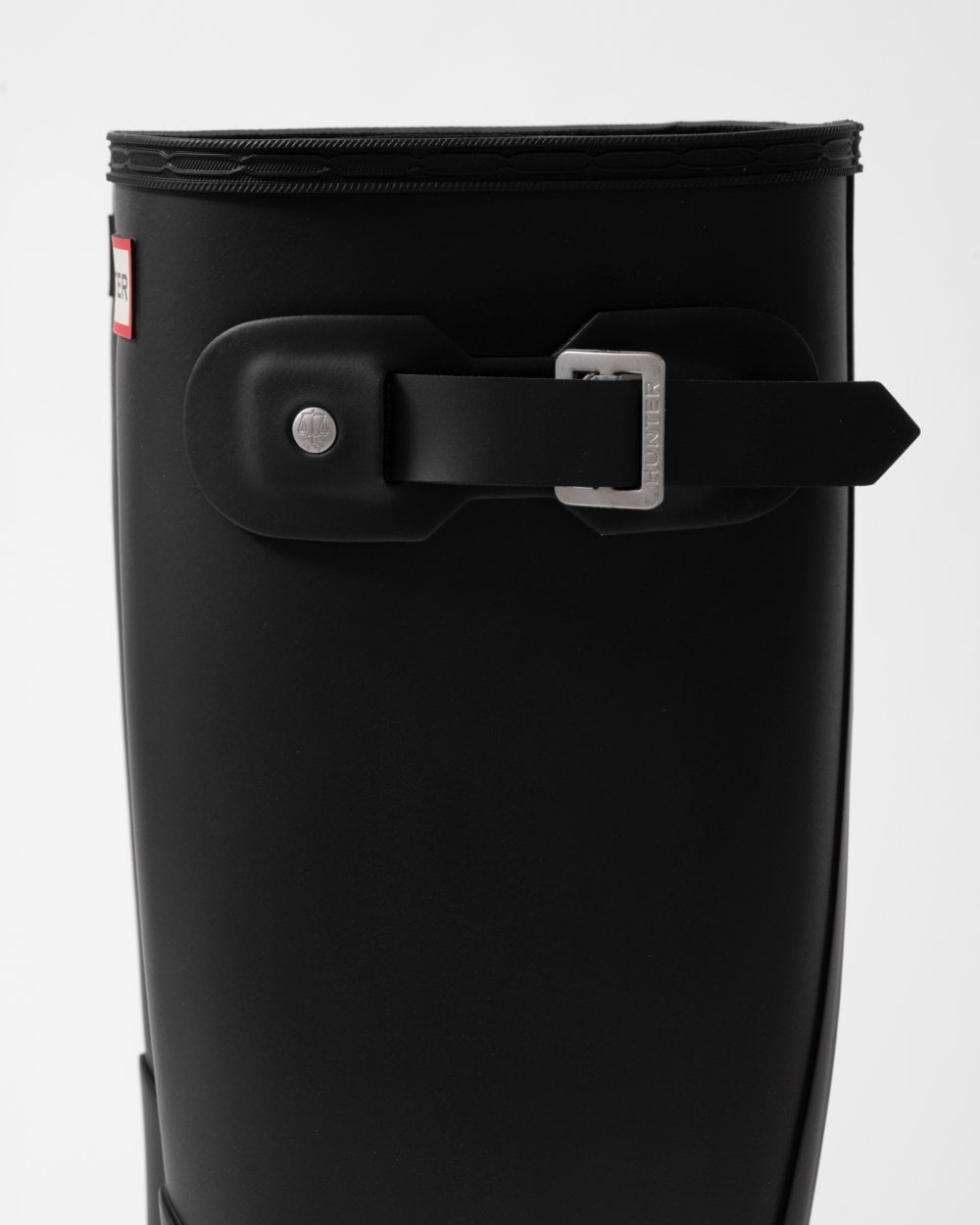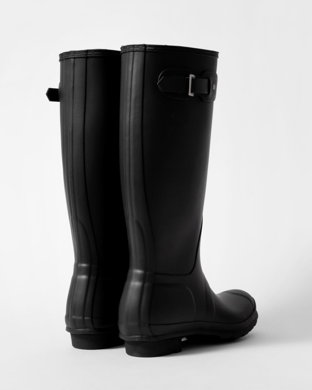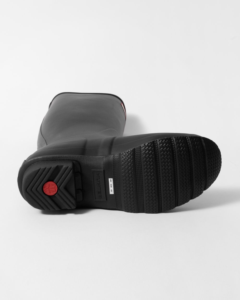 Perfect for wet weather conditions, this women's Wellington Boot has been at the heart of the Hunter Original brand since its introduction in 1956. Formed of natural rubber, each pair is made from 28 hand-cut parts and assembled over three days on an aluminium last bespoke to Hunter, before being vulcanised for superior protection. Featuring the Hunter Original tread pattern, and a comfortable polyester lining, these tall black welly boots are a rainy-day necessity.