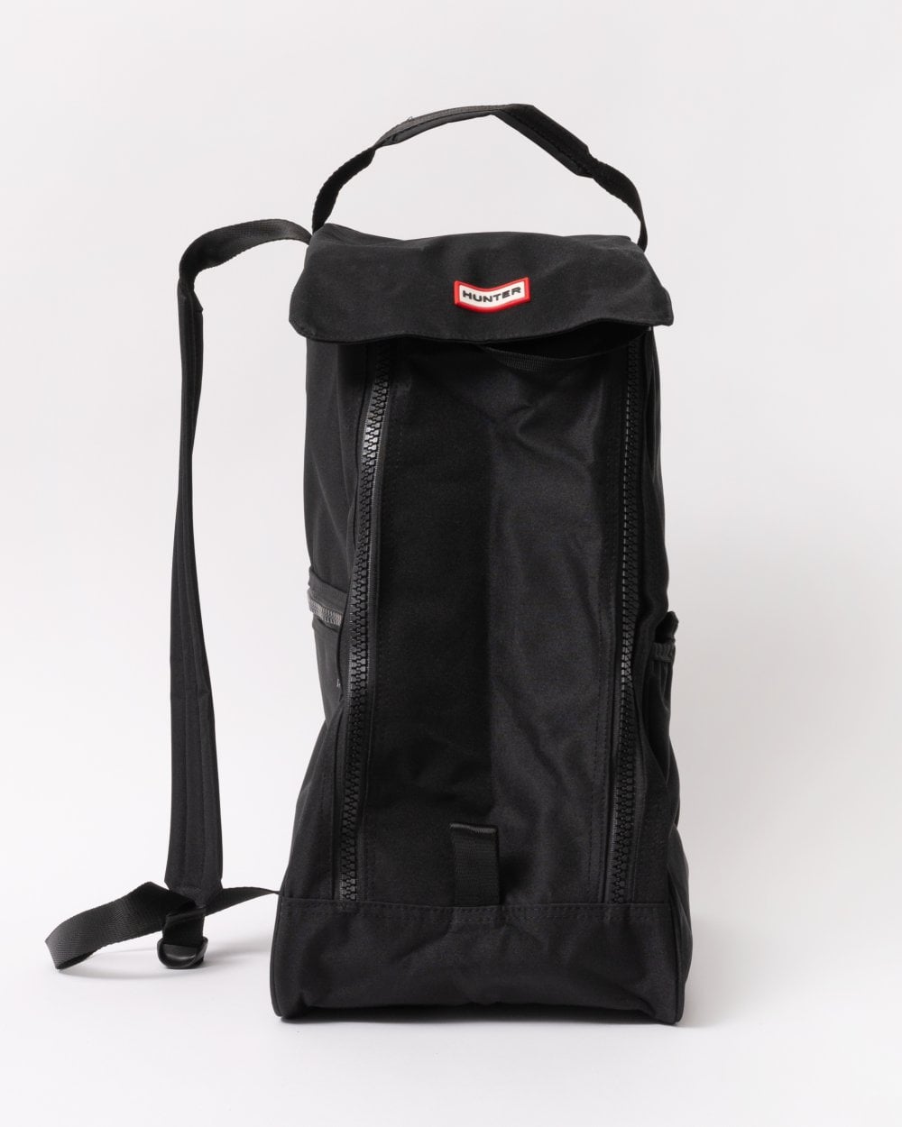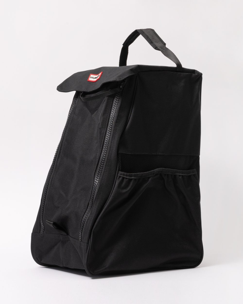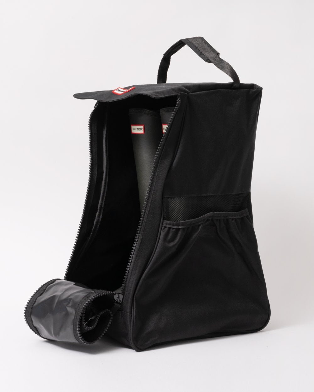 A large-sized boot bag crafted from a durable polyester shell. Designed to carry tall Hunter boots, the travel boot bag features a wide double zip opening, an exterior slip pocket and mesh panel. A practical design, a top handle and adjustable shoulder strap allow it to be easily carried.