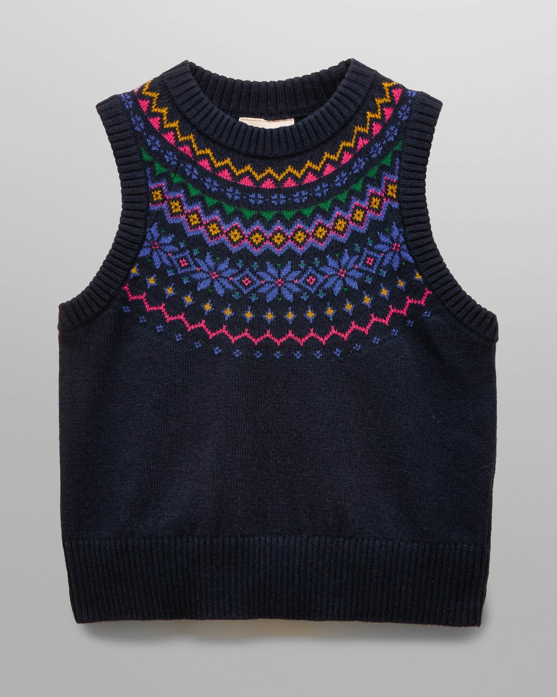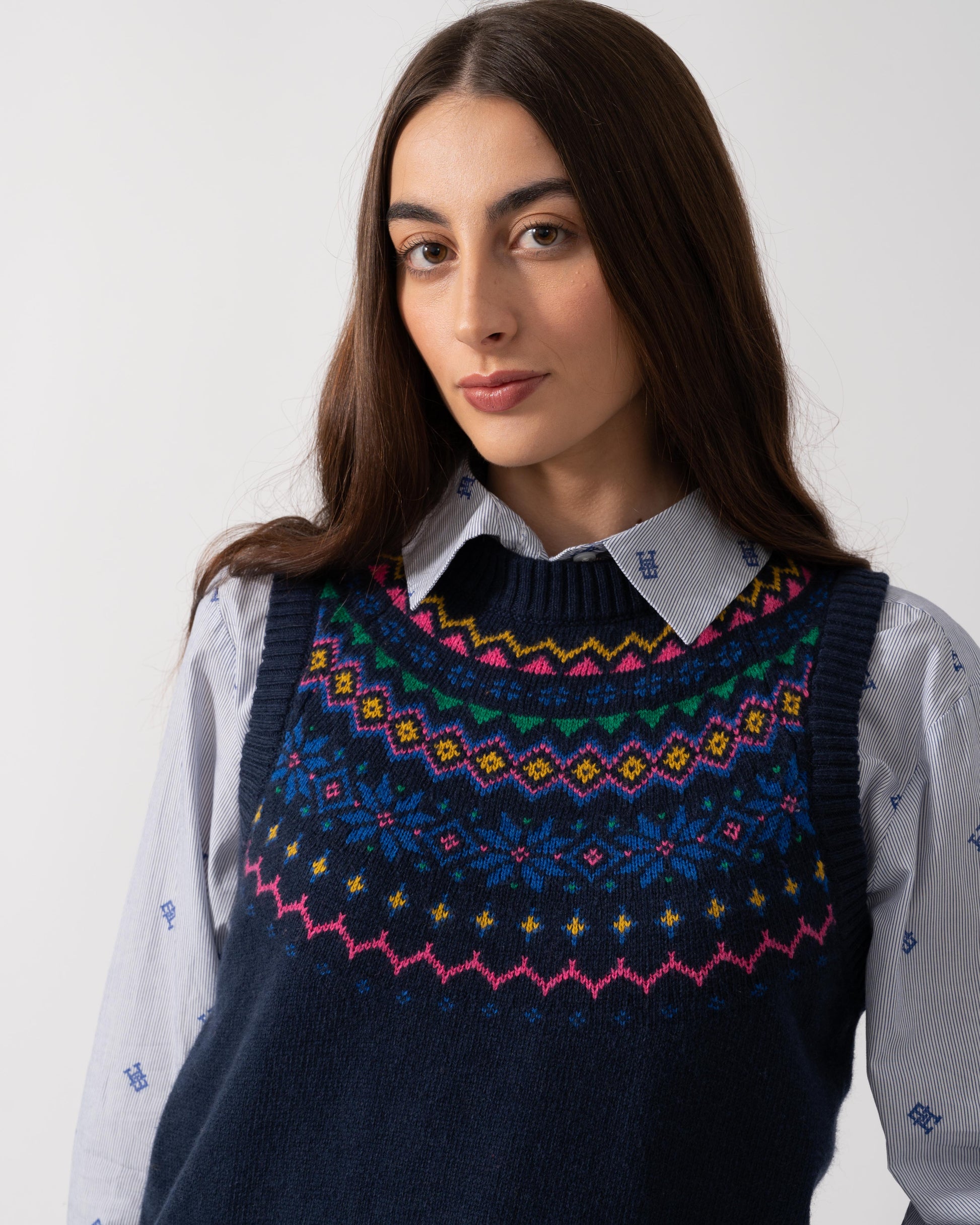 This Alba cotton rich vest is the perfect layering piece and would look great over a shirt or by itself. Crafted to a crew-neck profile, it's sleeveless and is topped with tubular ribbed trims. To finish, the front is adorned with a detailed Fairisle intarsia.