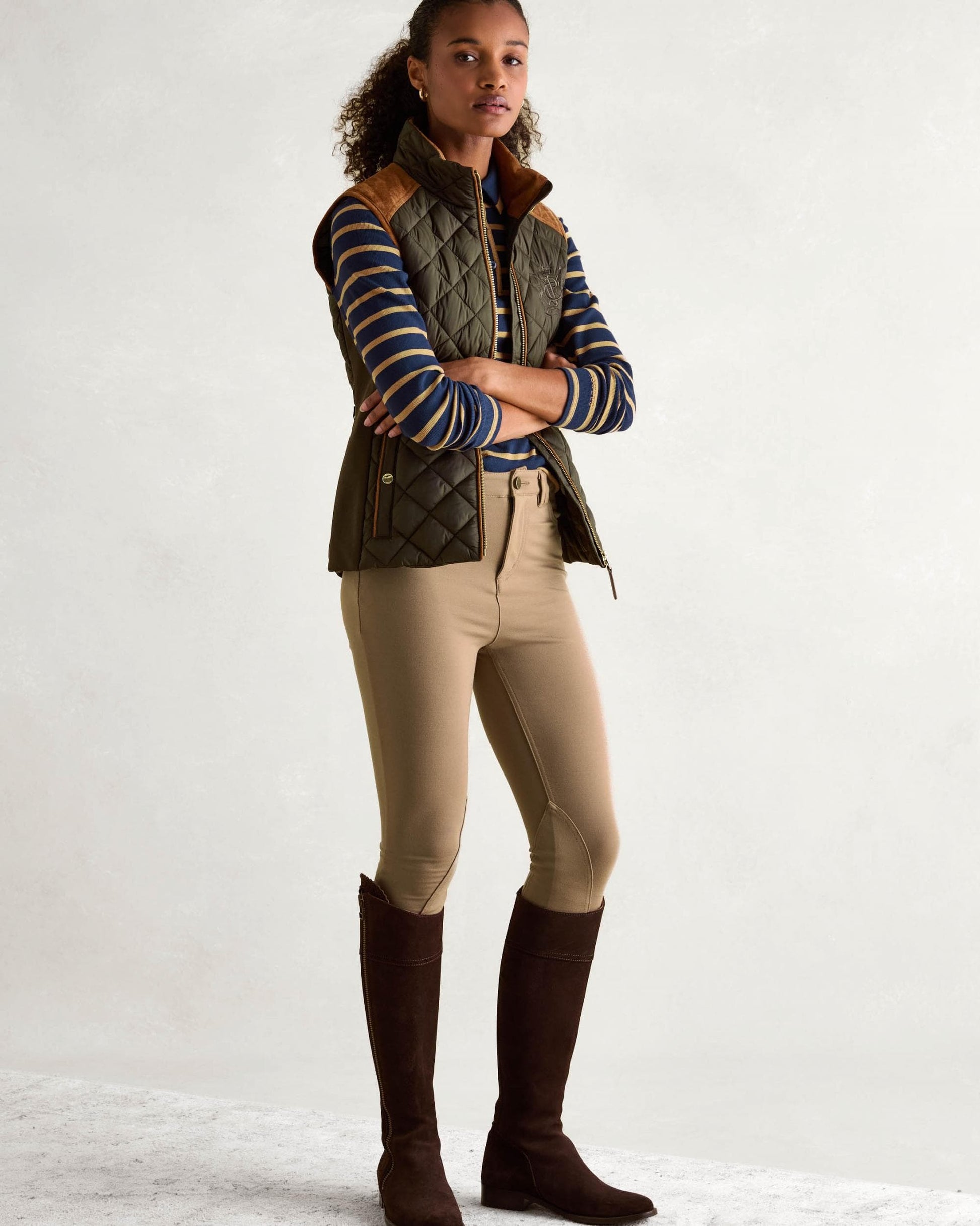 A much-loved Joules classic, now reimagined as a gilet — meet the Braemar, a showerproof layer that blends timeless countryside charm with flattering modern details. Inspired by Joules' heritage outerwear, this gilet features suedette trims, angled functional pockets, and signature Joules branding at the front and back neck. The elasticated side panels and adjustable back belt create a cinched, feminine silhouette, while the Pony Racing jacquard lining adds a playful touch of equestrian spirit. Whether worn over knits or layered under coats, the Braemar is a versatile piece made for crisp country walks and weekend escapes.