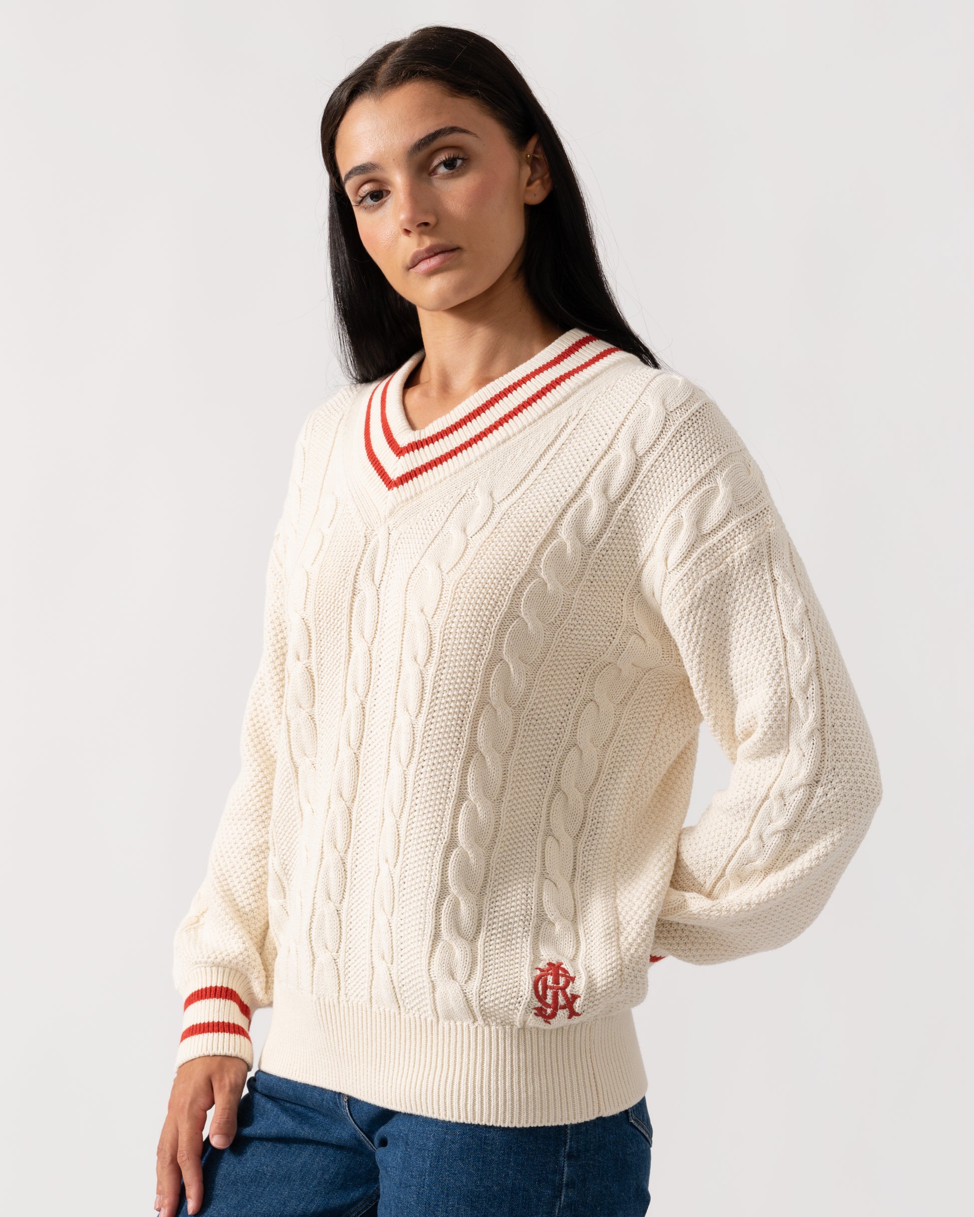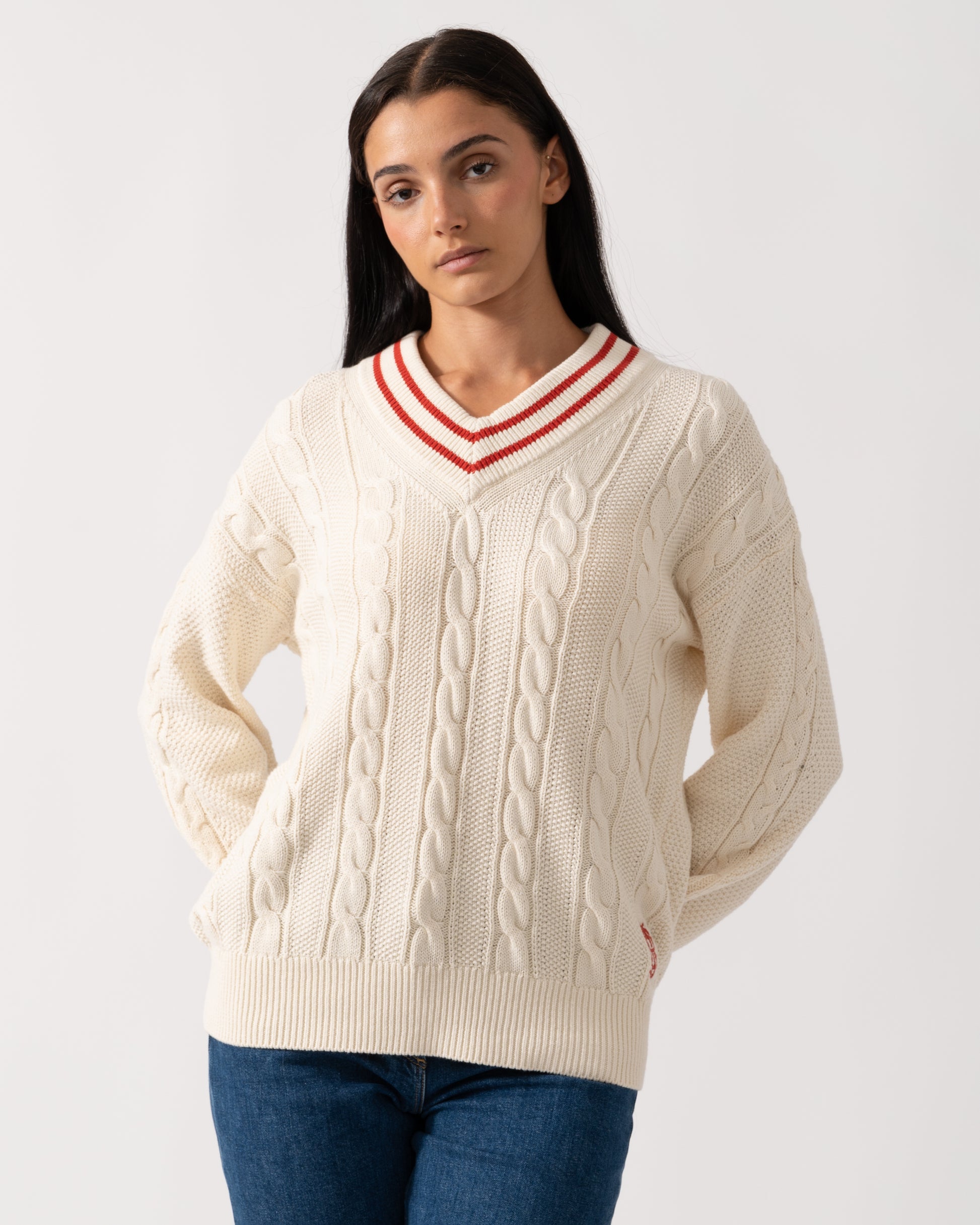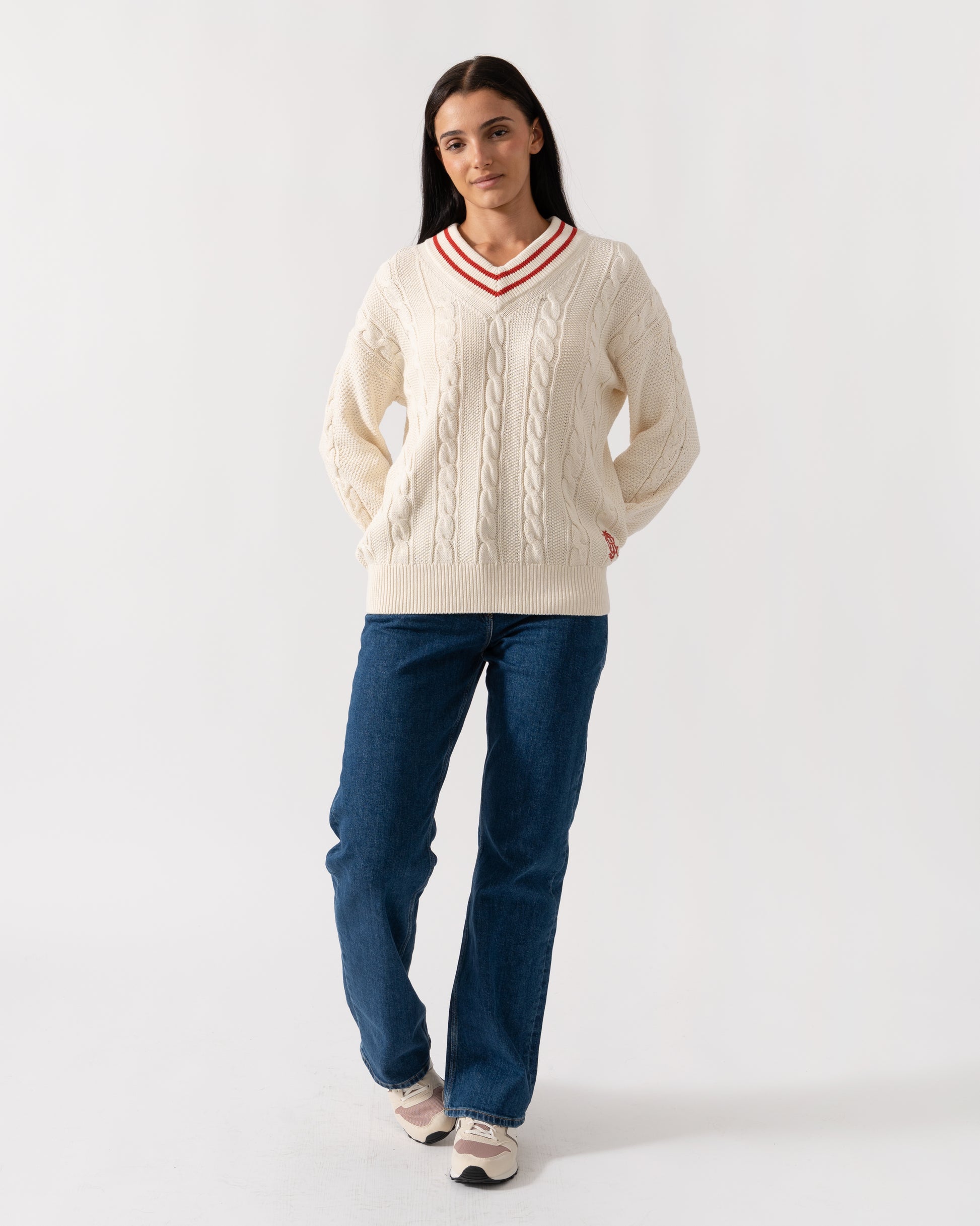Dibly Womens V-Neck Cable Knit Jumper - Cream/Red