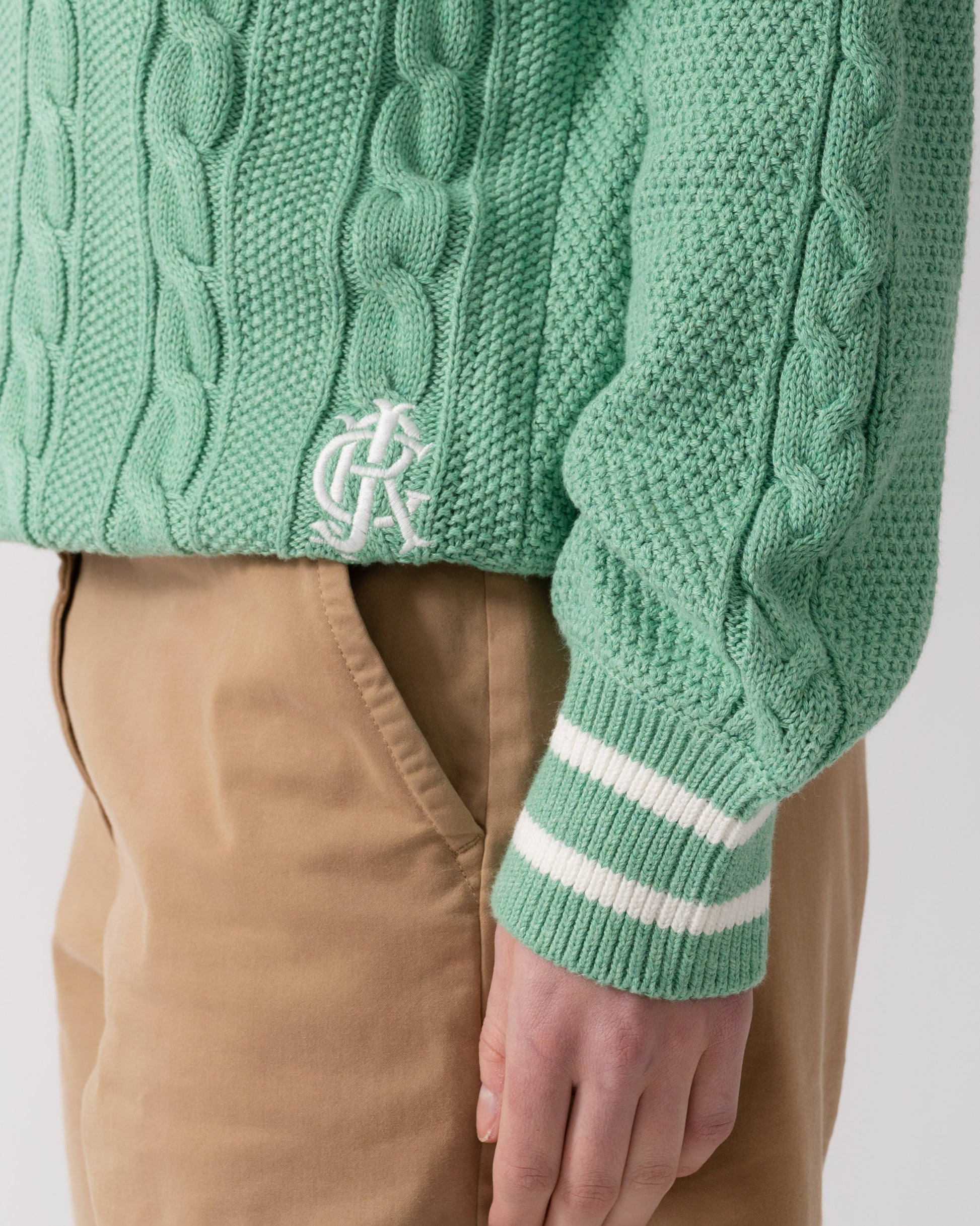Drawing style influence from the world of cricket, the Dibbly relaxed fit knitted jumper will help you achieve a sporty look this season. It carries details synonymous with the sport including a deep ribbed V-neck with contrasting stripes and uses a classic cable knit technique to the body and sleeves along with a textured moss stitch throughout. Its 100% cotton construction makes it an enduring piece that will live long in your wardrobe. It's completed with a ribbed hem and ribbed cuffs with striped detailing.