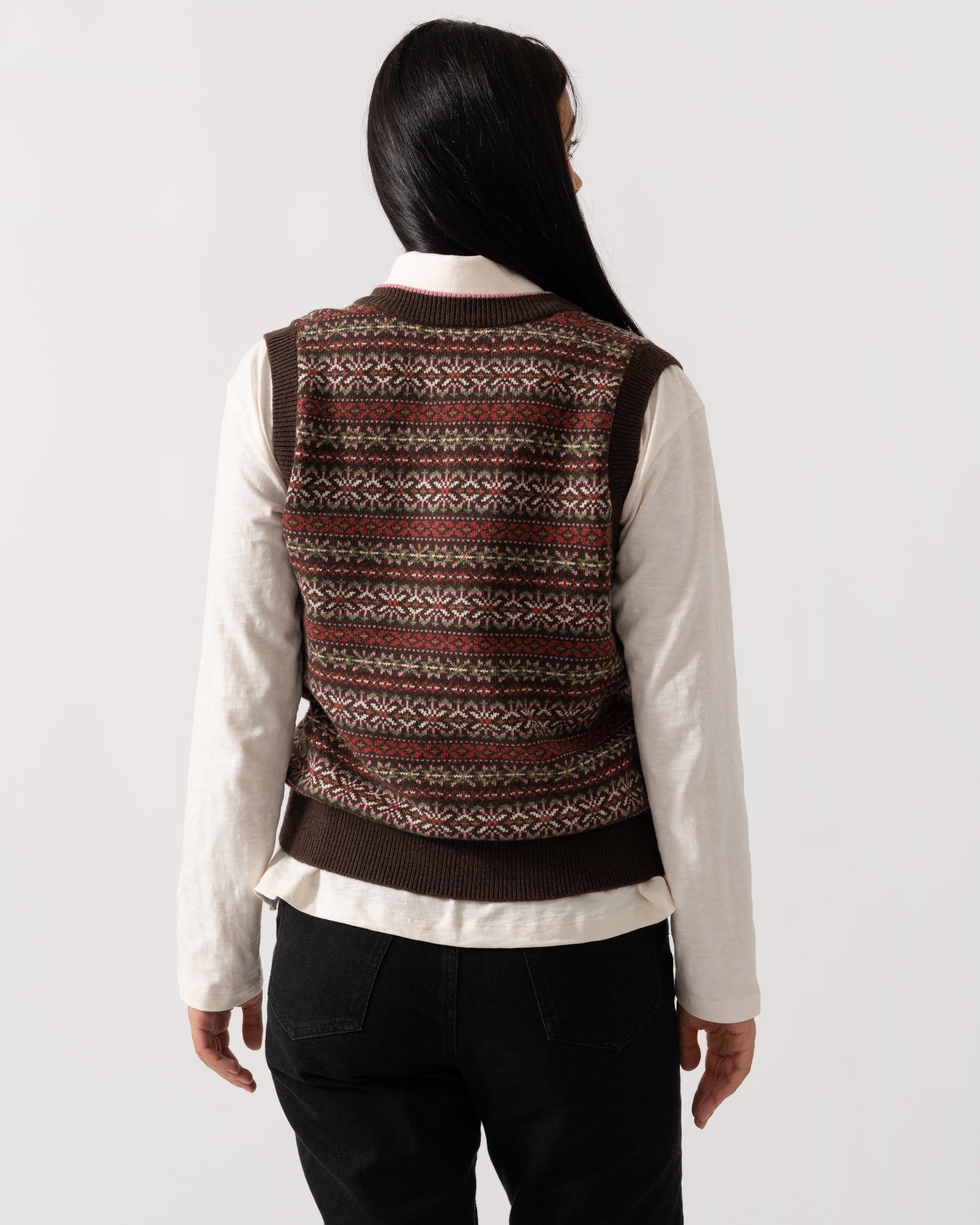 It has been knitted with a deep ribbed V-Neck along with a ribbed hem and armholes and features a heritage-feel Fair Isle pattern from front to back.