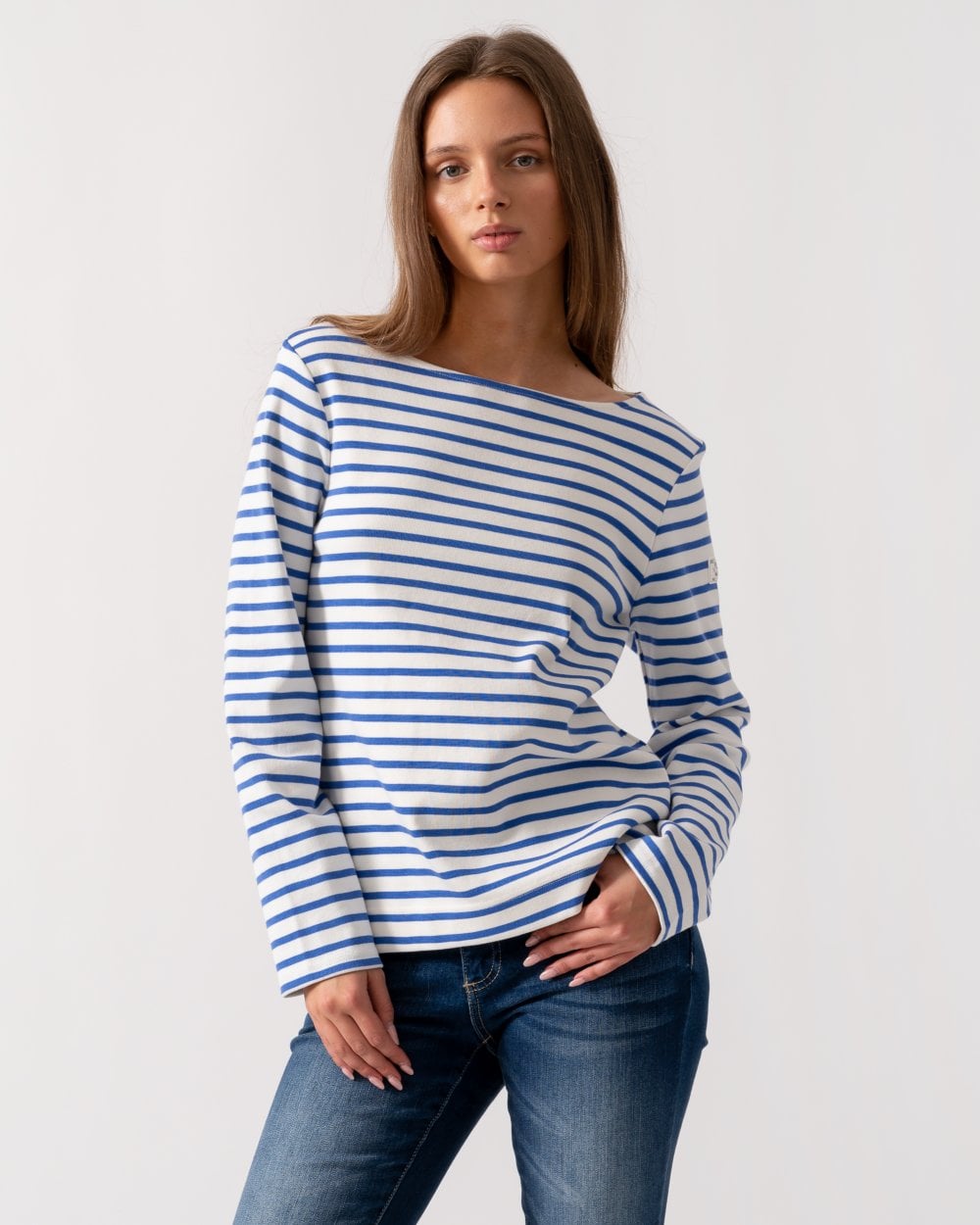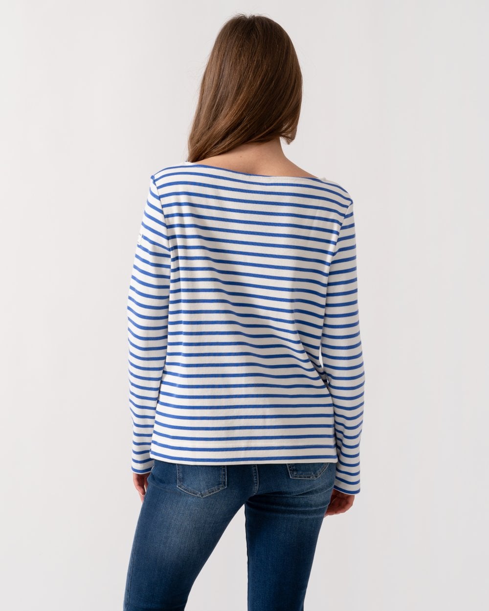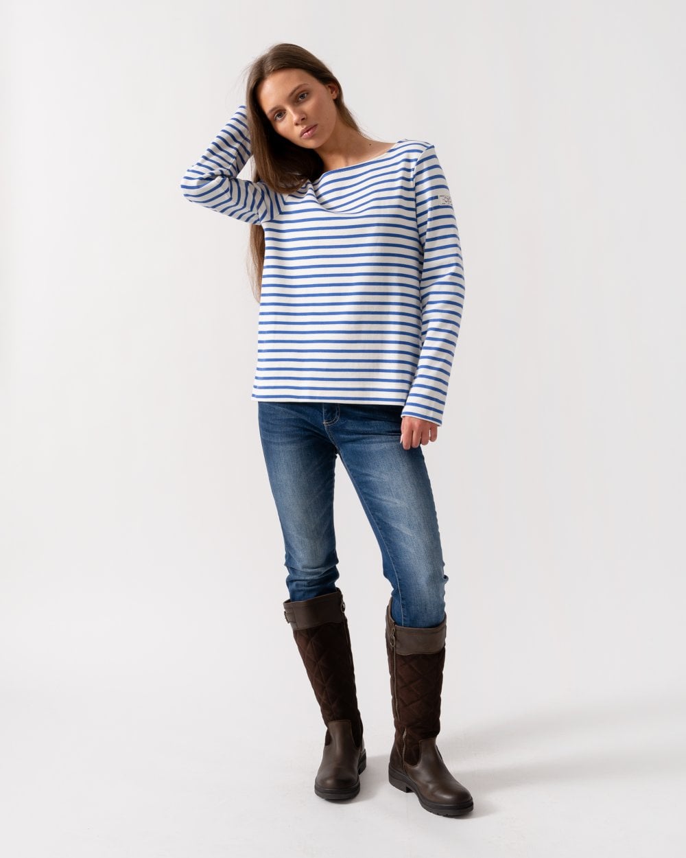 So, what's new? The fabric is now a heavierweight cotton jersey that feels supremely soft to the touch, it has a more relaxed overall fit, a wider boat neck and a shorter fit through the body. It remains distinctive through its horizontal stripes and is completed with a Joules tab to the left sleeve (as worn) as a nod to your favourite brand.