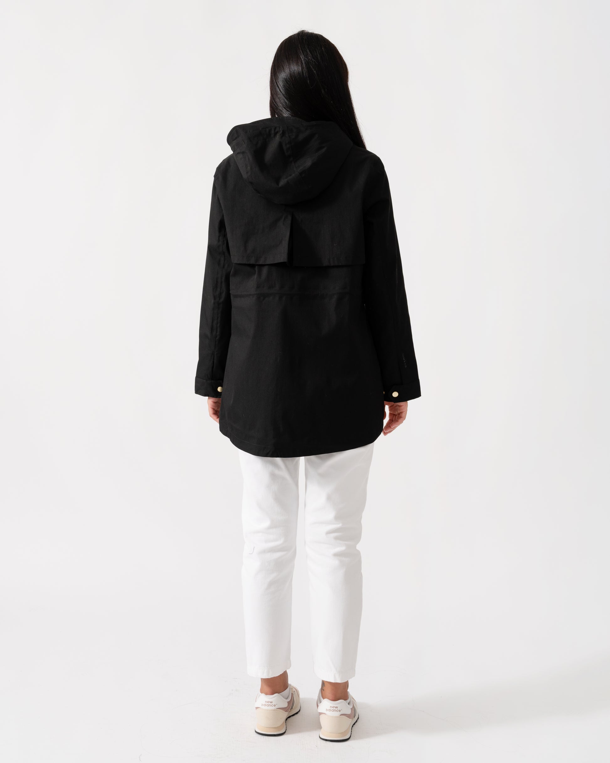 It's completed with front pockets with popper fastenings, adjustable cuffs and a half-body lining.