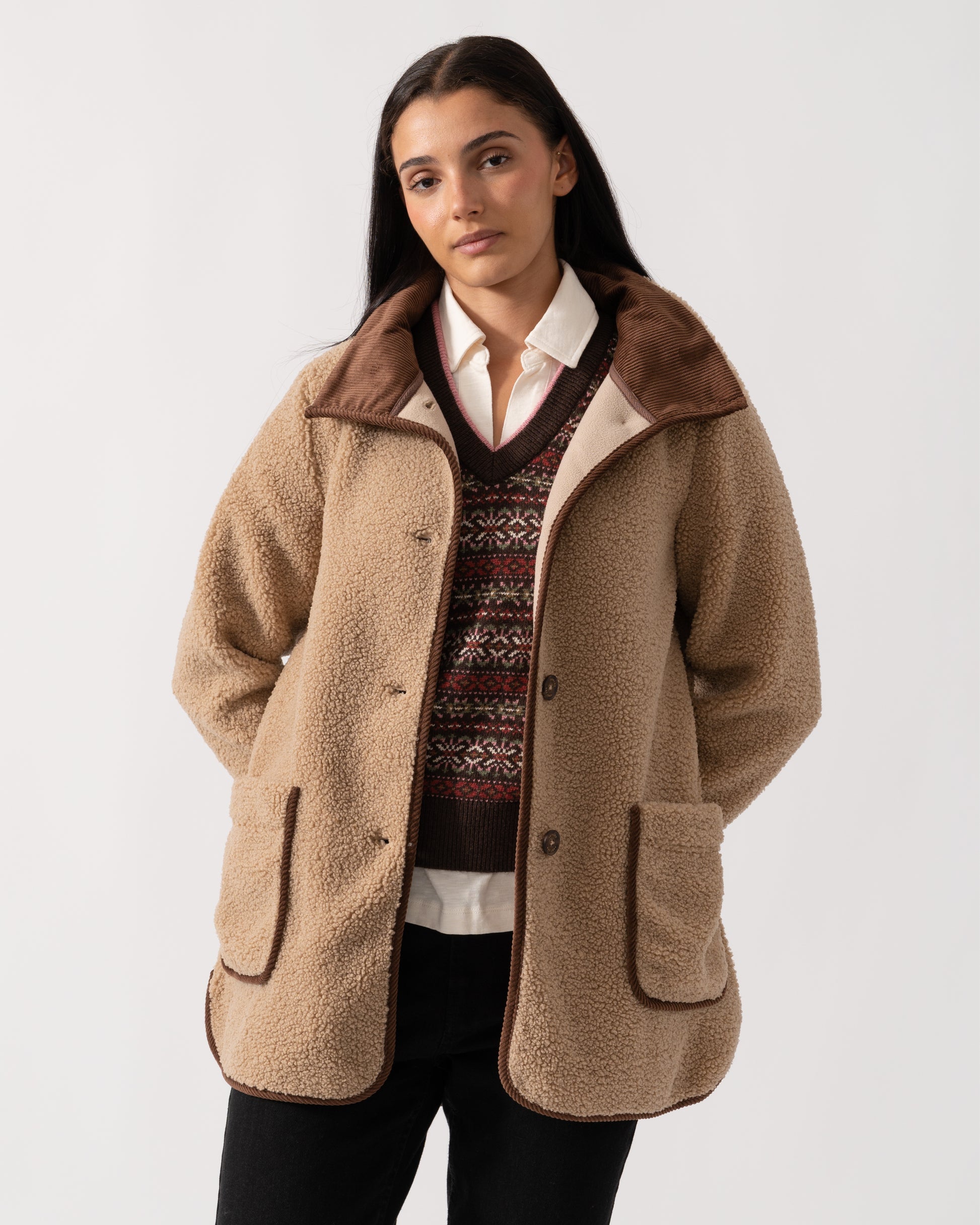 The Sadie is a layer that will easily transition between seasons. It features all the detailing of a traditional fleece, but is elevated through its corduroy collar and longline shape. The outer is crafted from Borg, and the inner consists of a super-warm bonded polar fleece lining. It also has patch pockets, cord trims, button fastenings, and is finished with joules branding. Pair it with your favourite T-Shirt on warmer days or over a jumper to take the chill off. Either way, you'll be looking oh-so lovely.
