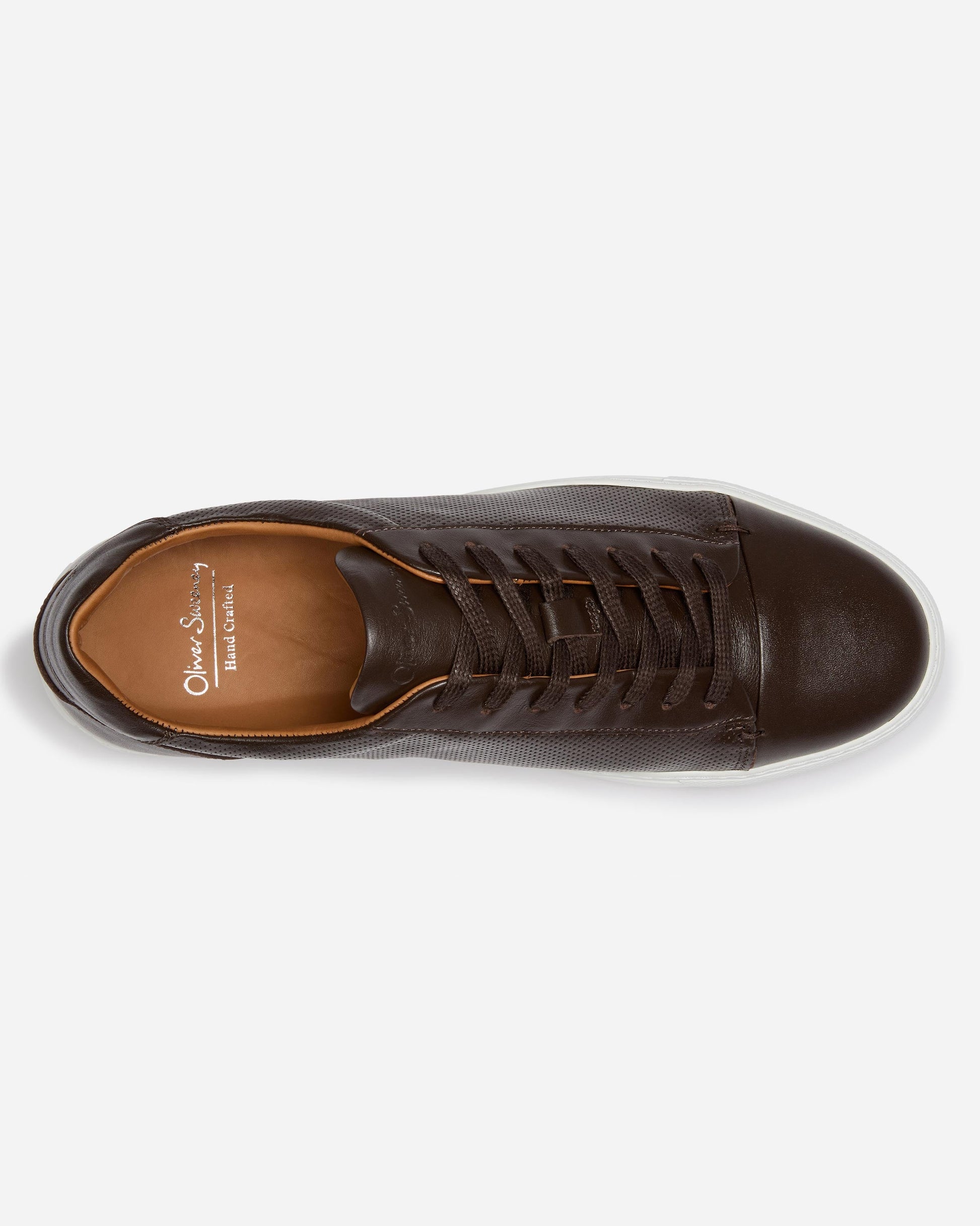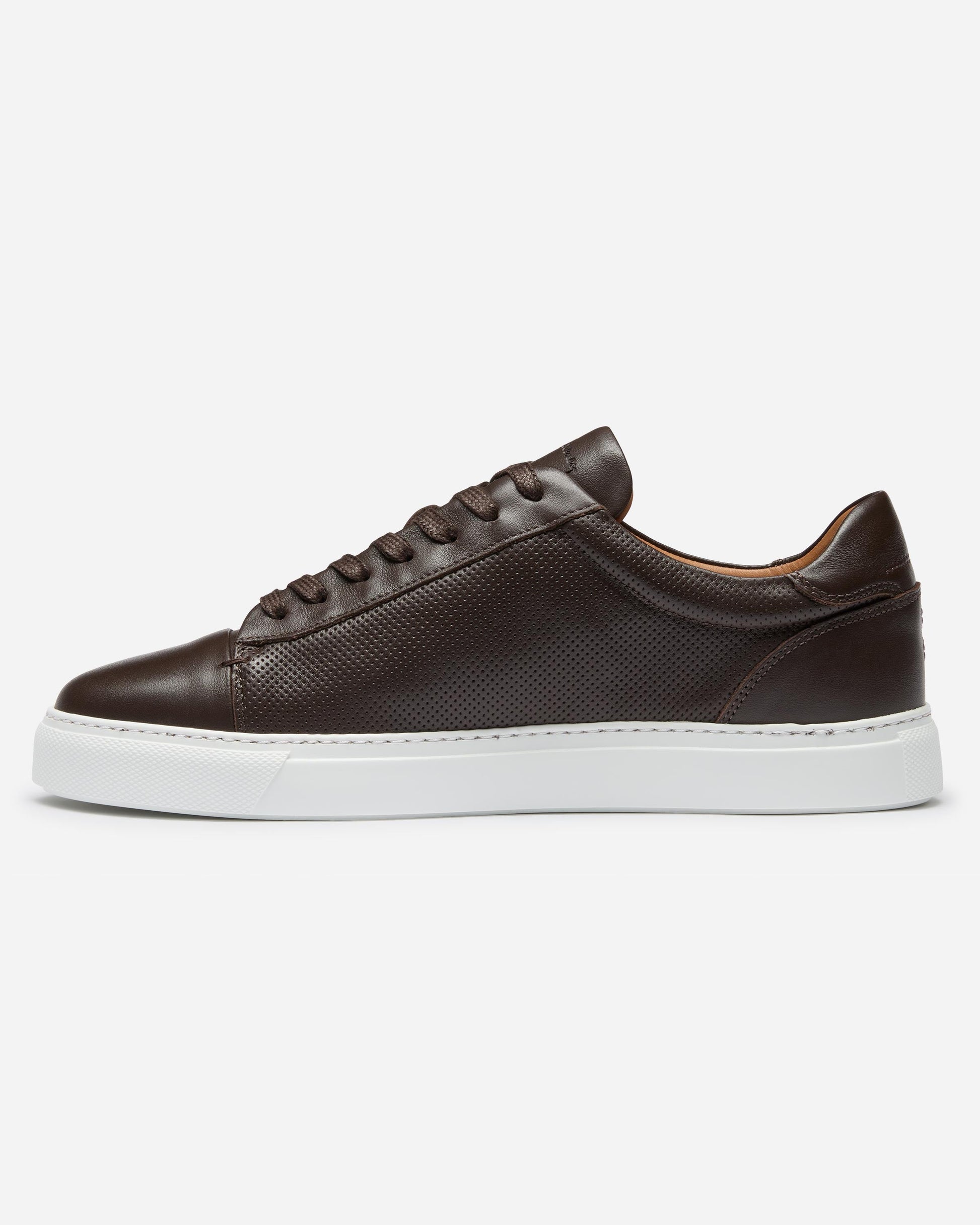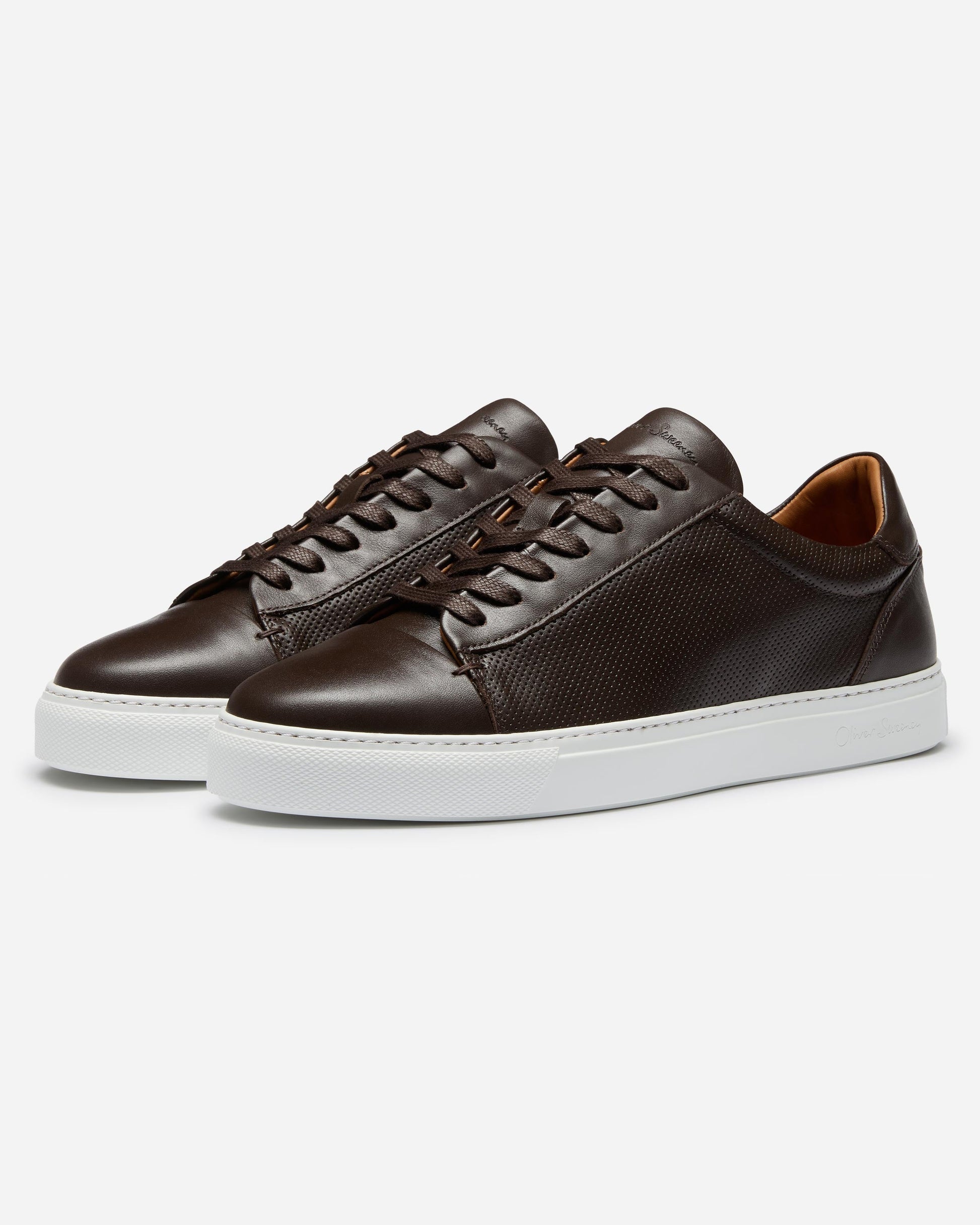 This popular perforated trainer is a combination of smooth and punched brown calf leather. The upper pattern features a toe cap with a neatly folded seam, punched quarter panels, a padded collar and a bagged topline and tongue. Includes a full calf leather lining and deep cushioned leather insole. The trainers are made in the traditional way and cemented to a lightweight cupsole secured with a side stitch.