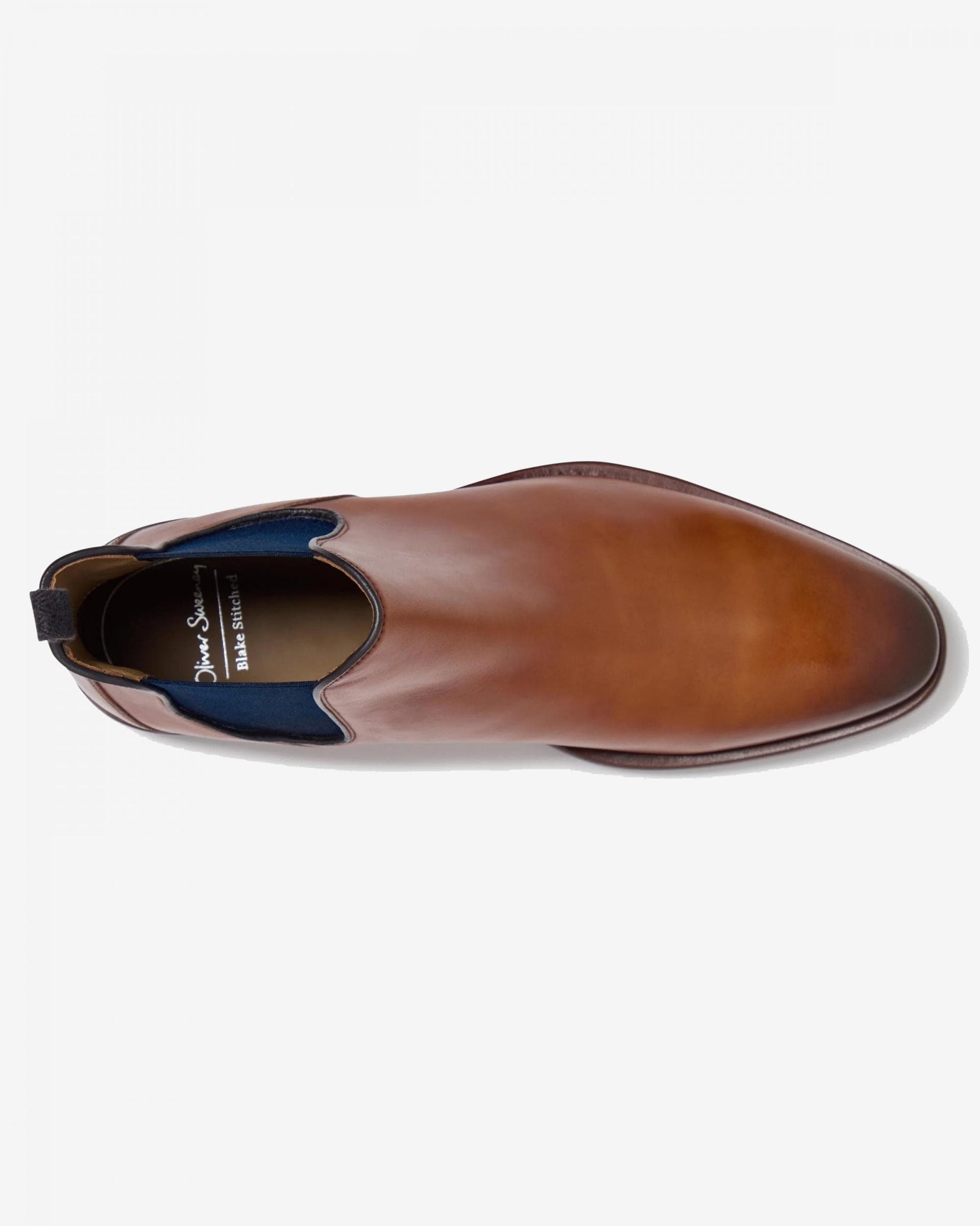 This classic Chelsea boot is made from antique finished, smooth Adigo calf leather with contrasting elastic gussets, a fabric back pull tab and a neatly piped topline. Includes a ½ calf leather lining and cushioned leather heel pad. The upper is Blake stitched to a leather sole with Oliver Sweeney's signature fingerprint rubber top-piece and a rubber insert in the leather stack heel, for extra practicality.