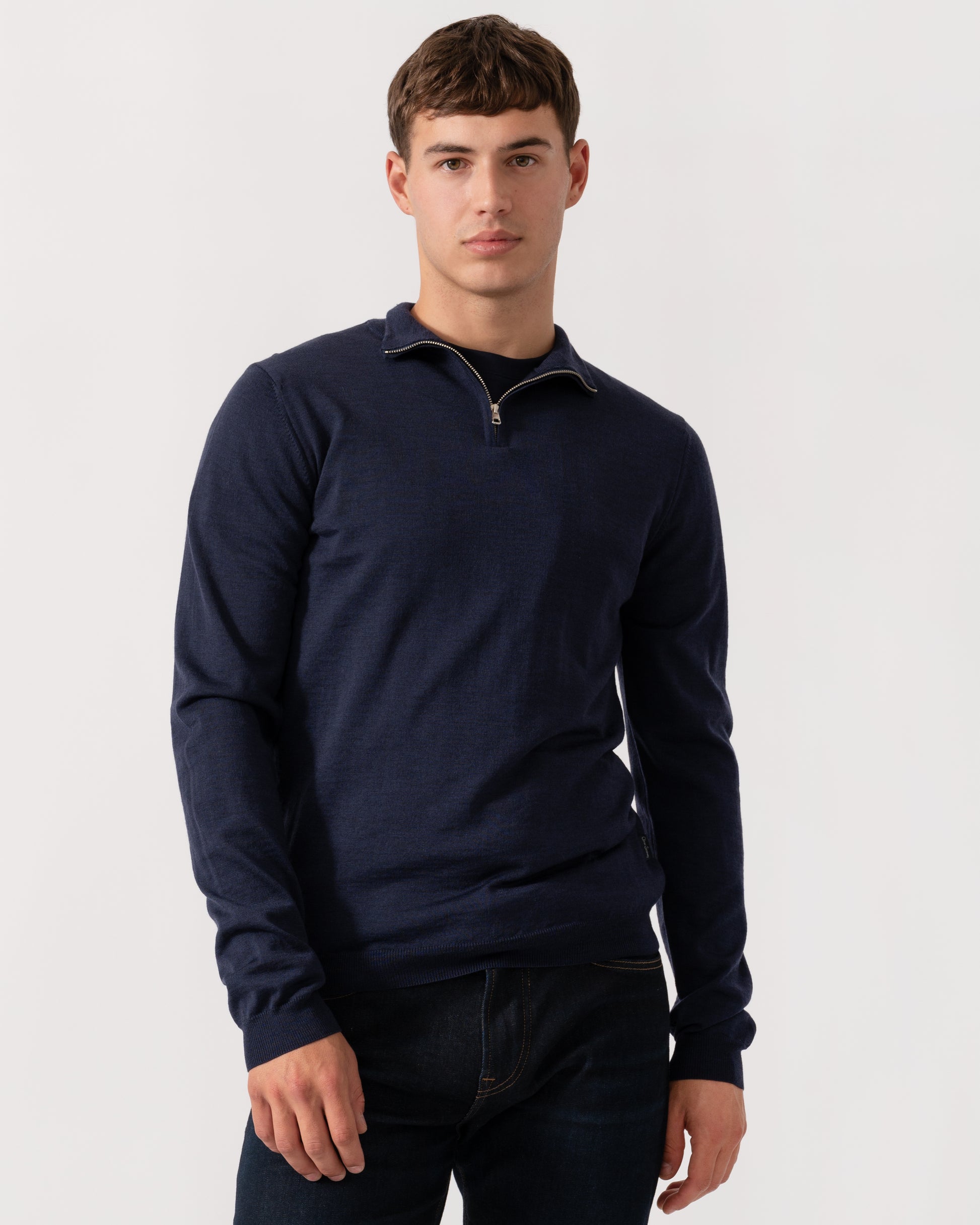 A ¼ zip funnel neck jumper in 100% merino wool from the renowned Zegna Baruffa Mill in Italy. Creafted with a super fine 27 gauge jersey knit in a navy marl, fully fashioned with a dropped back shoulder seam to create a clean profile. The jumper has ribbed cuffs and hem and a sealed, rolled over neck rib with concealed zip placket. Merino wool is ideal for all year round.