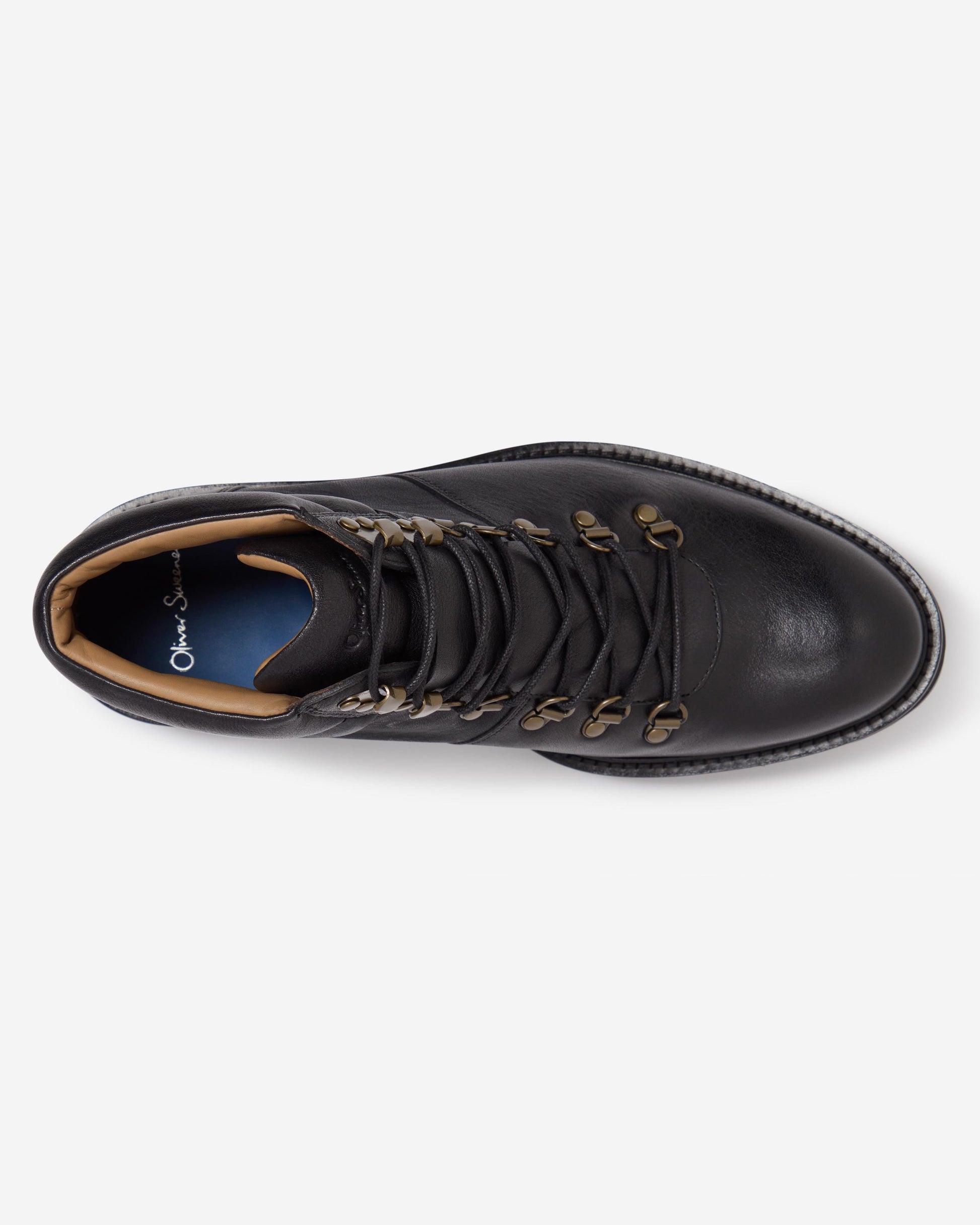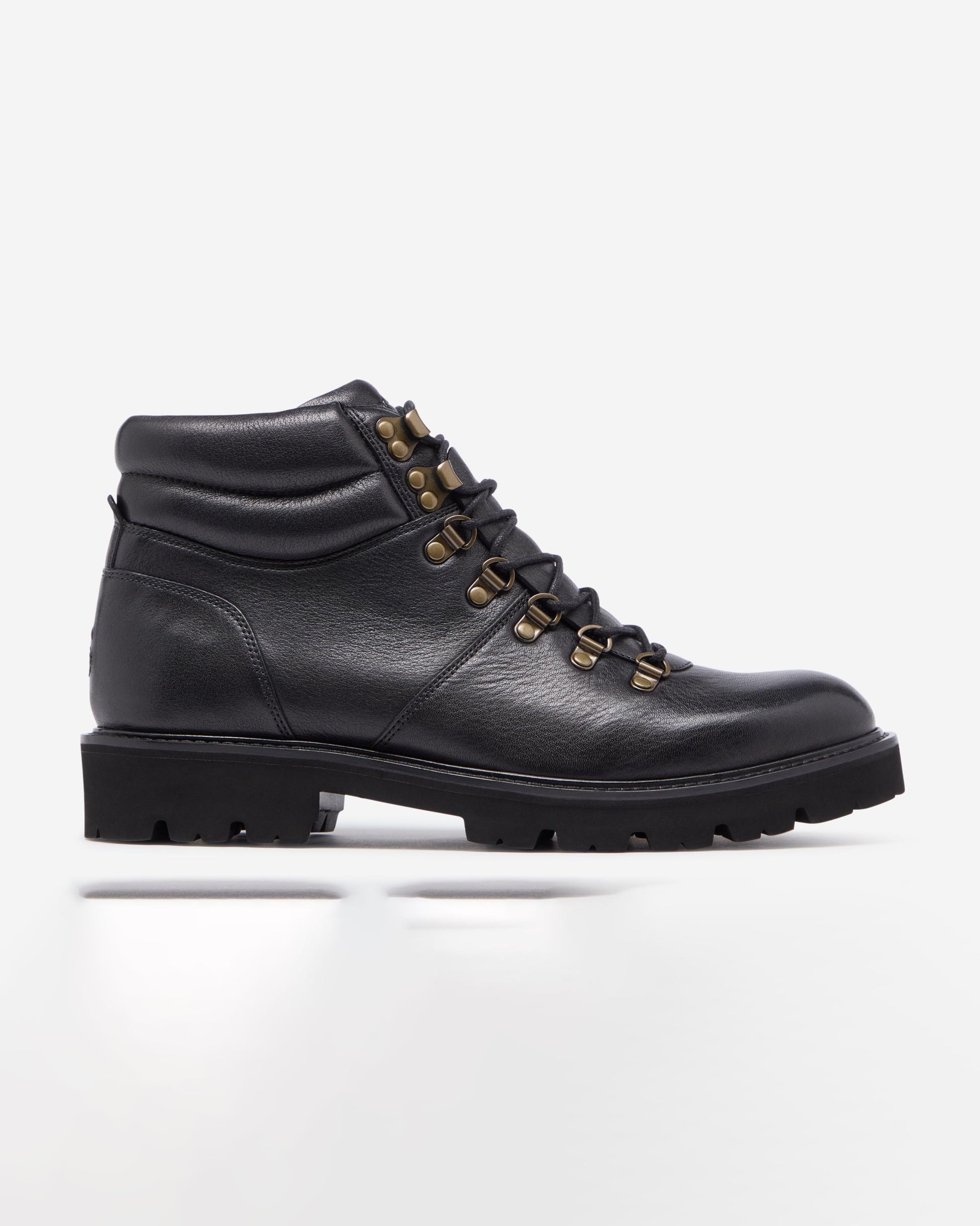 This light weight hiker is made from Black milled calf leather – a tumbled, grainy textured leather with a soft feel. The boot has a comfortably cushioned collar and tongue and a series of antique brass D-rings and ski hooks to ensure a flexible fit. Includes a tongue guard over the top of the tongue for extra protection from the elements. Inside there is a full leather cushioned insock and a ¾ calf leather lining. The upper is cemented to a Finproject ExtraLight sole - a deceptively lightweight, chunky cleated sole topped with a leather rand.