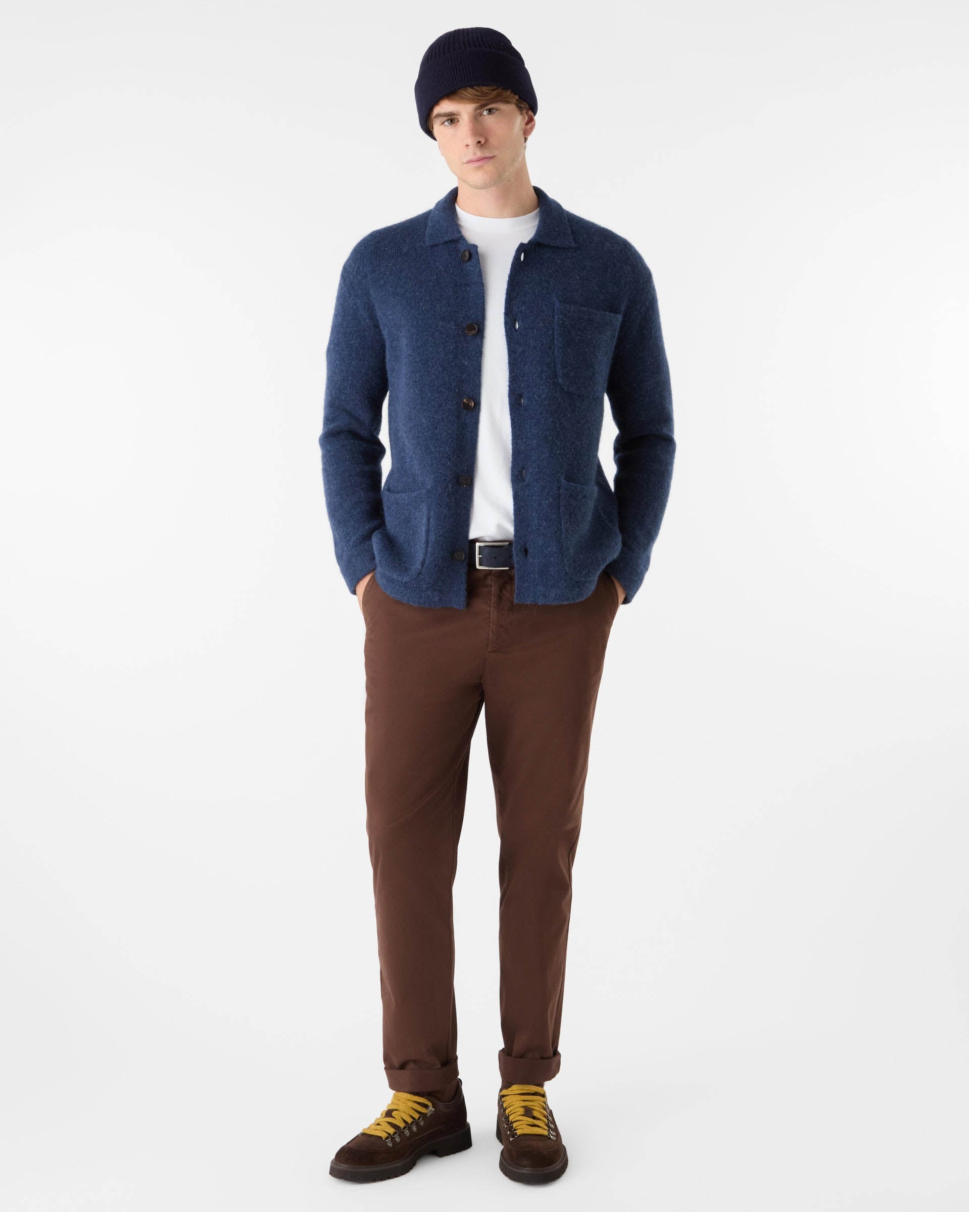 The Heywood overshirt has one upper and two lower patch pockets with six natural horn buttons. The cuffs and base have a neatly folded hem, and a double knit on the collar to create more structure and weight.