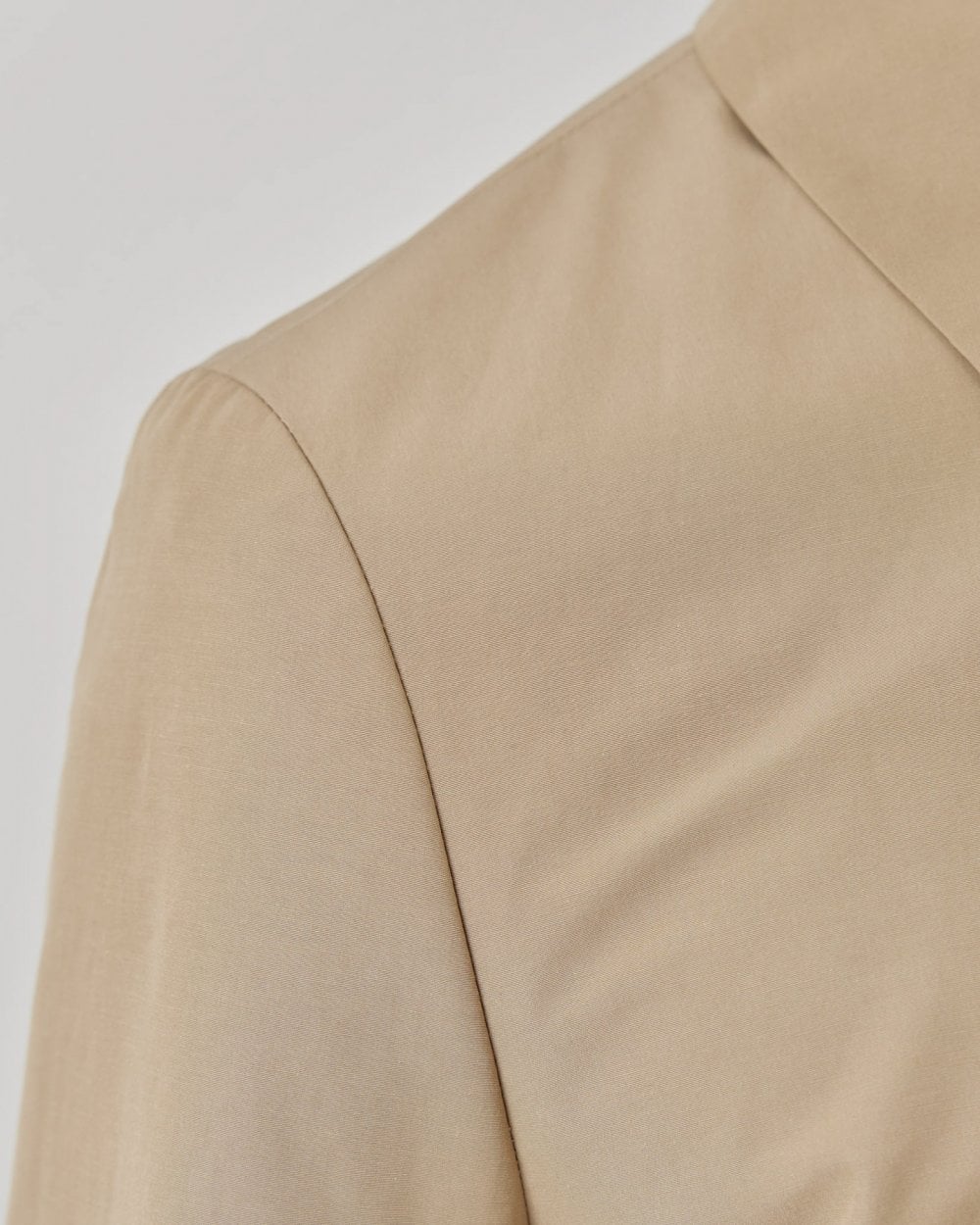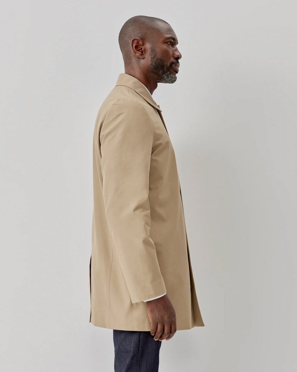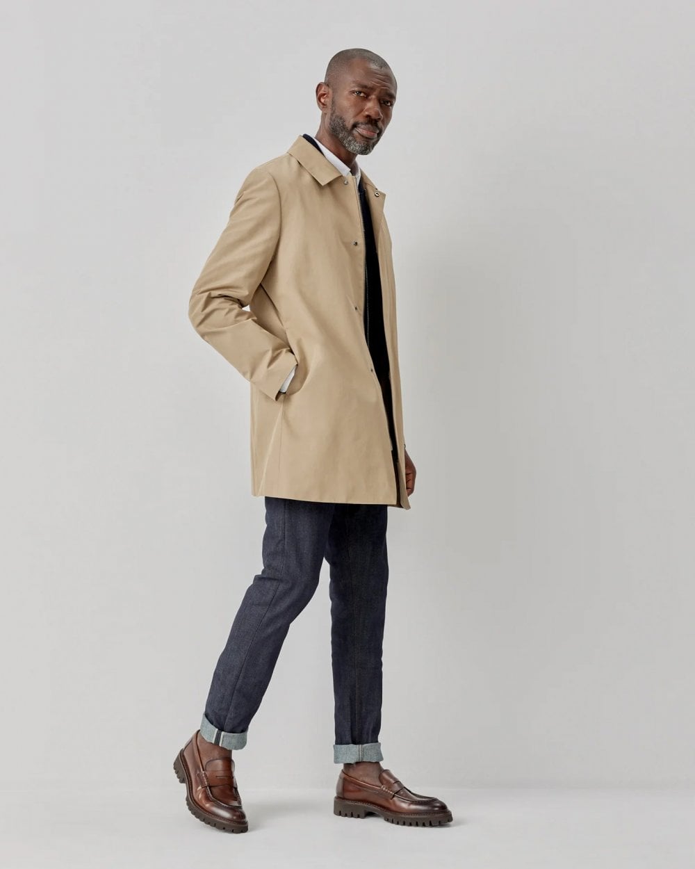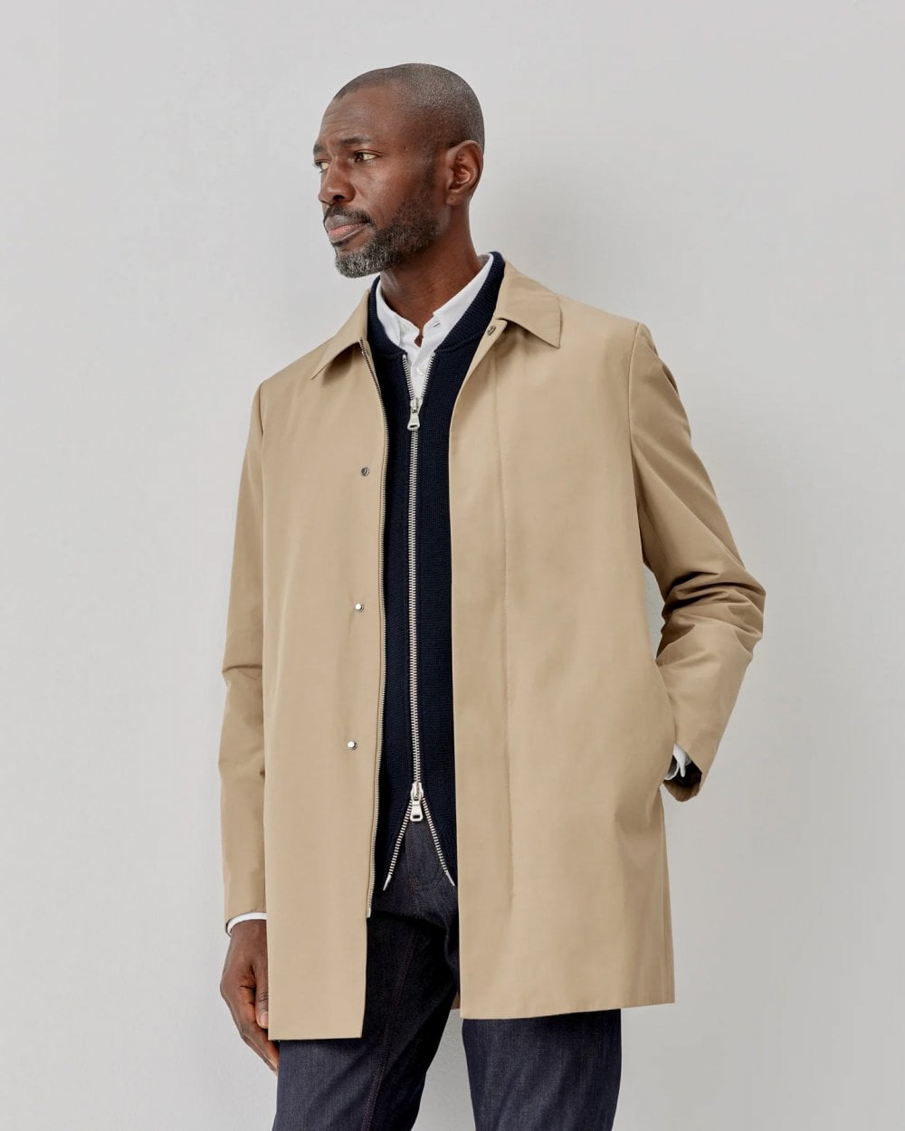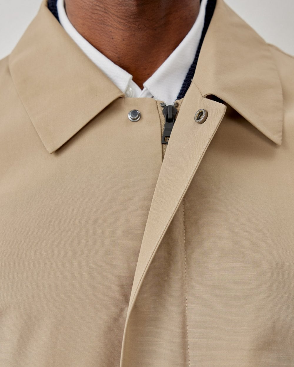 This versatile mac is made from a finely woven, cotton blend fabric in dark navy, with a contrasting khaki collar stand. The showerproof fabric, which will also cut out the wind, is lightweight with a matt finish. The minimalist style has clean lines with concealed pockets vented in the side panel seam, a concealed placket covering a zip and four press studs and a single rear vent. Inside, there are two jetted breast pockets and a full lining, which provides some warmth. The mac has a straight fit and is cut at a shorter length, which gives the versatility to double up as a jacket in the cooler months.