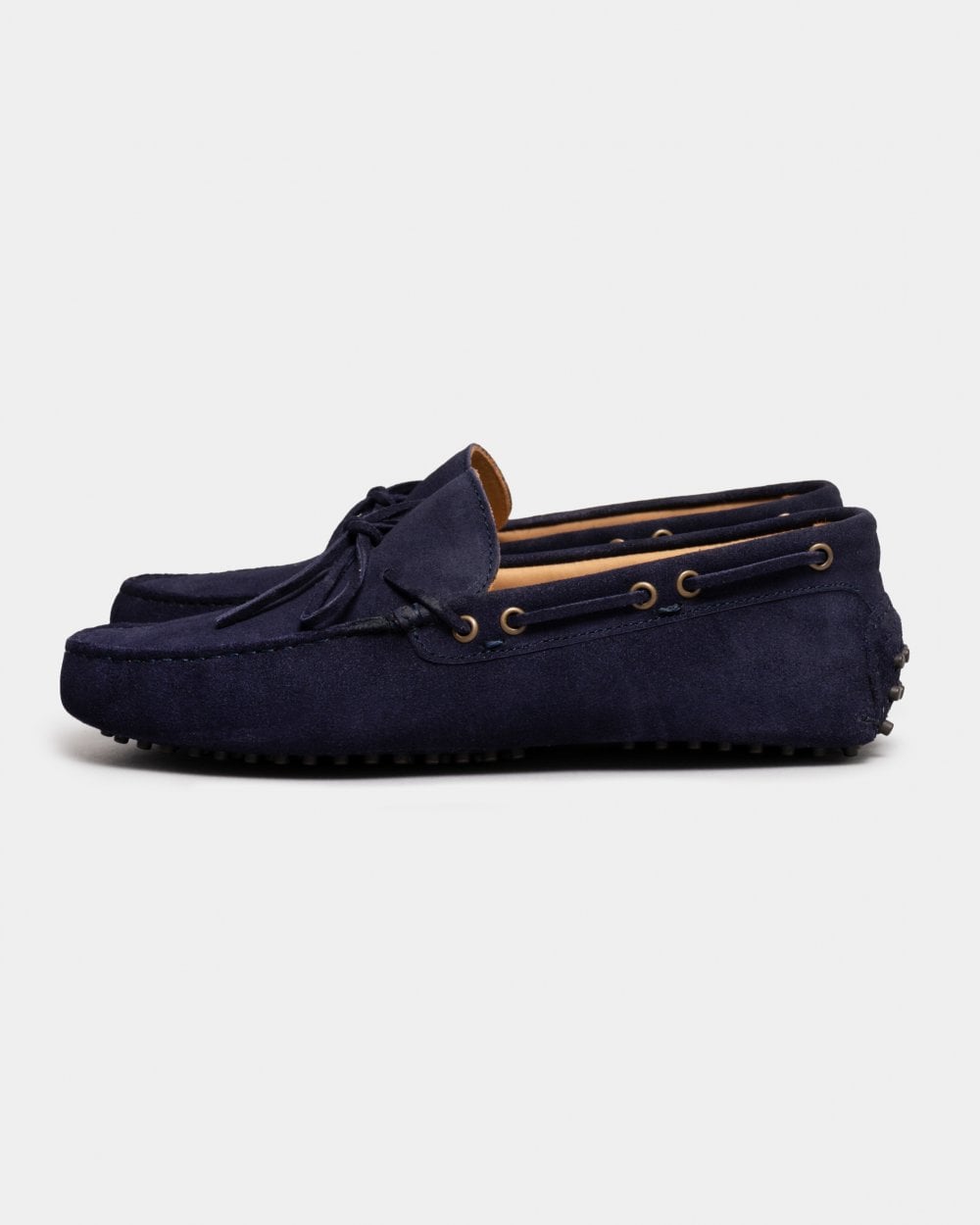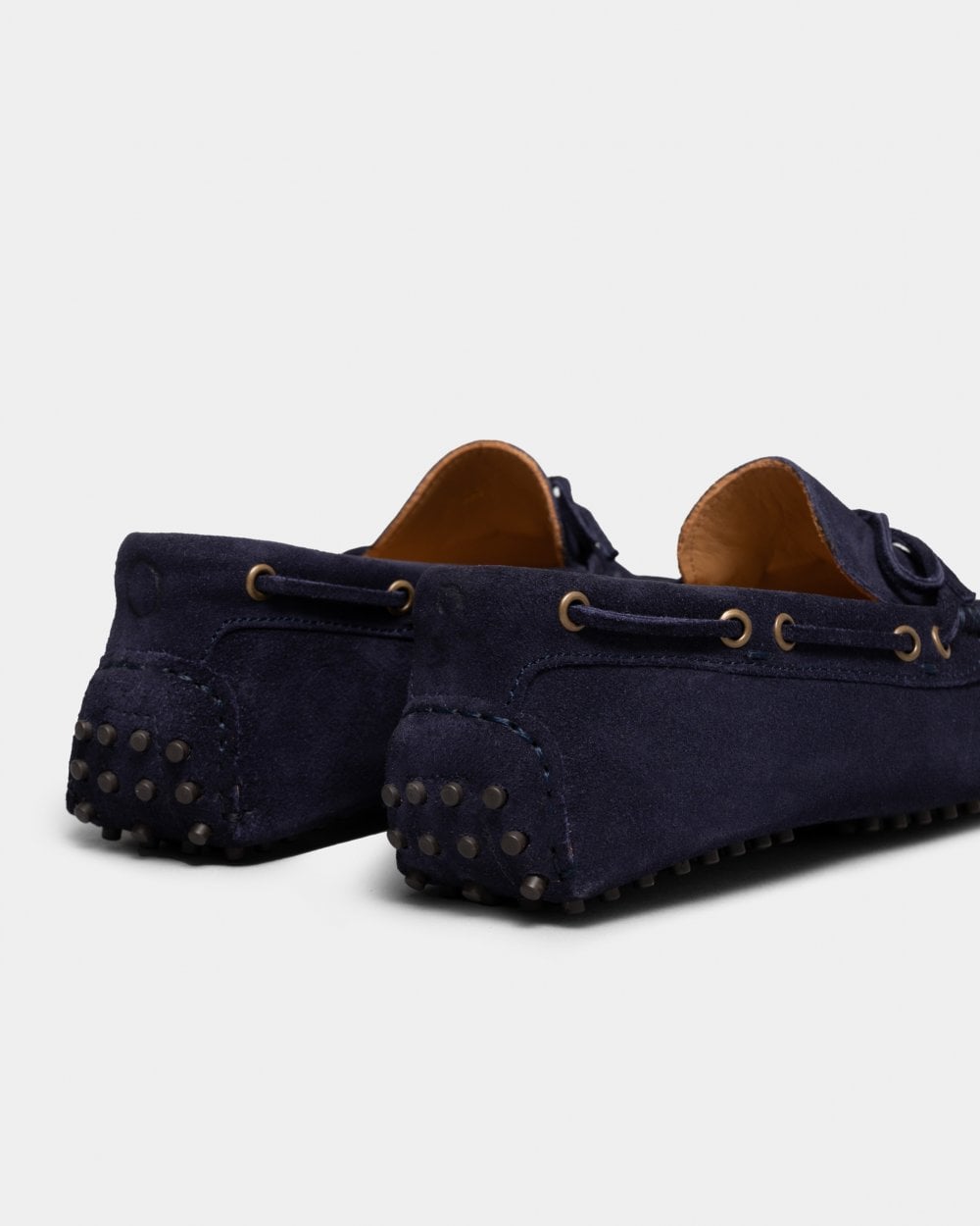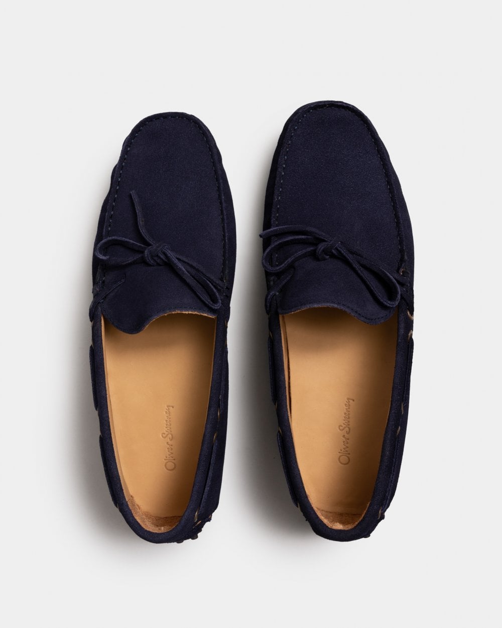 A new calf suede moccasin driving shoe from Oliver Sweeney's specialist factory in Spain. The moccasin construction is a wrap of soft suede under the foot, which is then stitched to the apron. This produces a comfortable flexible shoe, as the traditional insole board is not required. The calf suede upper is fully leather lined with a leather insock and leather lace. The traditional driving shoe sole is studded rubber, which protrudes through the leather providing a durable surface.