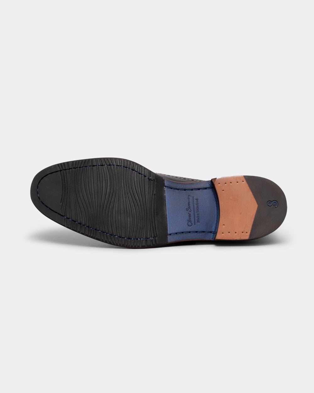 This classic Oxford wing-tip brogue is built on an elegant, formal last and made from antique finished, Adigo calf leather, with a ¾ calf leather lining and half leather, cushioned insock. The design has a neatly piped topline, traditional brogue punch detail and a toe medallion. The upper is Blake stitched to a sturdy leather sole with a practical rubber top-piece for additional grip, and a rubber tipped stack heel.