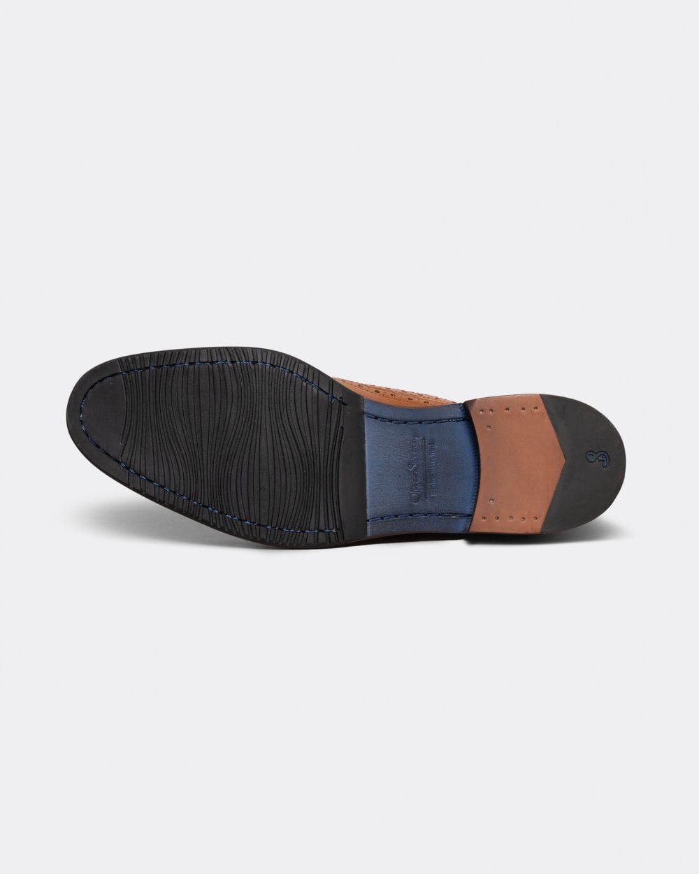 This classic Oxford wing-tip brogue is built on an elegant, formal last and made from antique finished, Adigo calf leather, with a ¾ calf leather lining and half leather, cushioned insock. The design has a neatly piped topline, traditional brogue punch detail and a toe medallion. The upper is Blake stitched to a sturdy leather sole with a practical rubber top-piece for additional grip, and a rubber tipped stack heel.