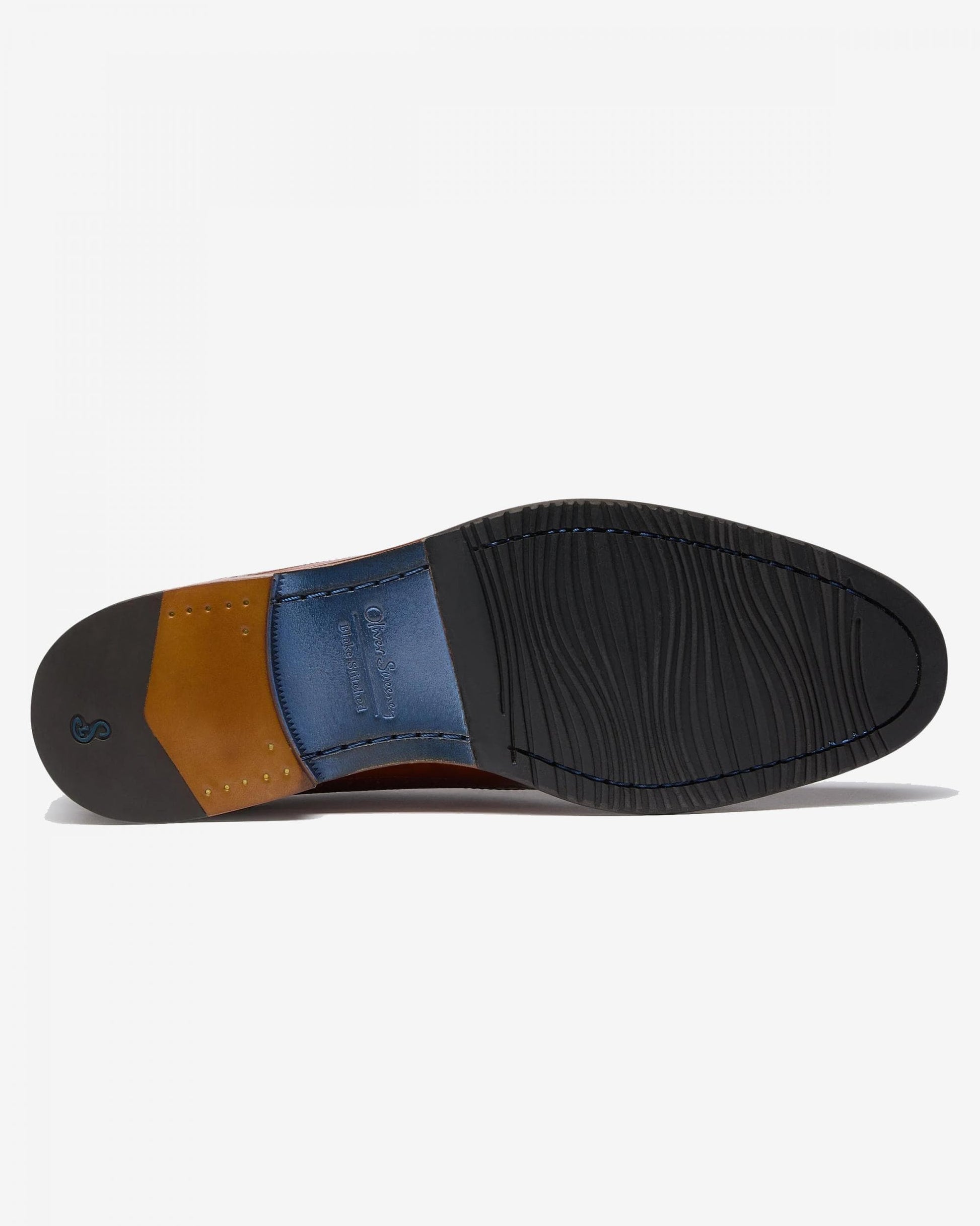 This classic Oxford wing-tip brogue is built on an elegant, formal last and made from antique finished, Adigo calf leather, with a ¾ calf leather lining and half leather, cushioned insock. The design has a neatly piped topline, traditional brogue punch detail and a toe medallion. The upper is Blake stitched to a sturdy leather sole with a practical rubber top-piece for additional grip, and a rubber tipped stack heel.
