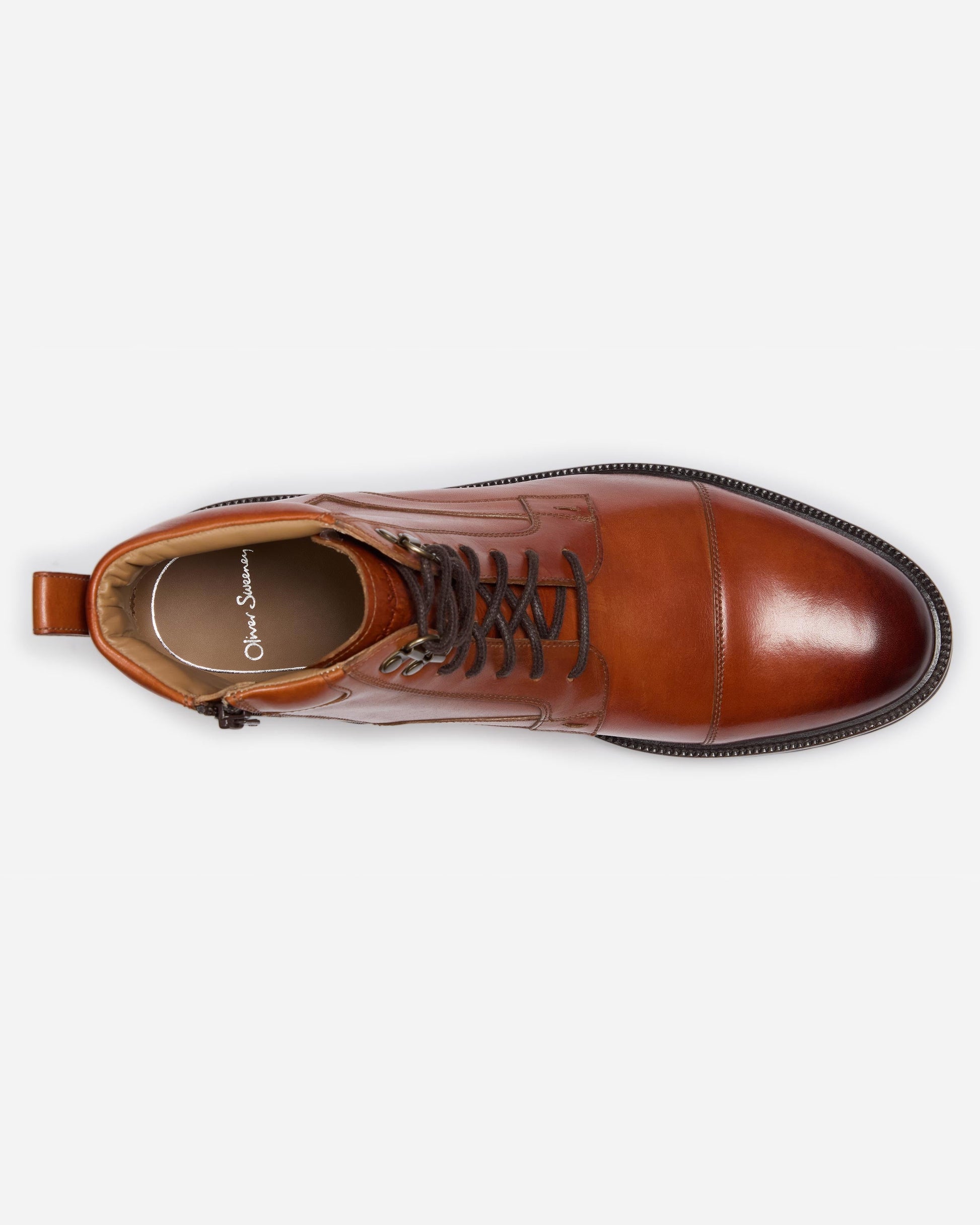 This zipped boot is made from dark tan calf leather, antique finished by hand. The upper design is a toe cap Derby boot with two top antique brass D-rings and a zip on the inside quarter. Inside there is a padded collar, a full calf leather lining and half leather insock cushioned at the heel. Set on the Finproject Extralight sole – a deceptively lightweight sole made from a durable compound with a chunky cleated profile.